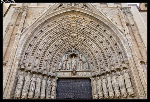 La portada principal está construida en estilo gótico y data de 1539. Está dividida en dos partes por un alero de madera muy volado al estilo aragonés del siglo XVI. La parte baja realizada por Guillem Inglés en 1327, con forma de gran arco apuntado de cuatro arquivoltas con decoración de figuras de mártires, vírgenes, ángeles y profetas.