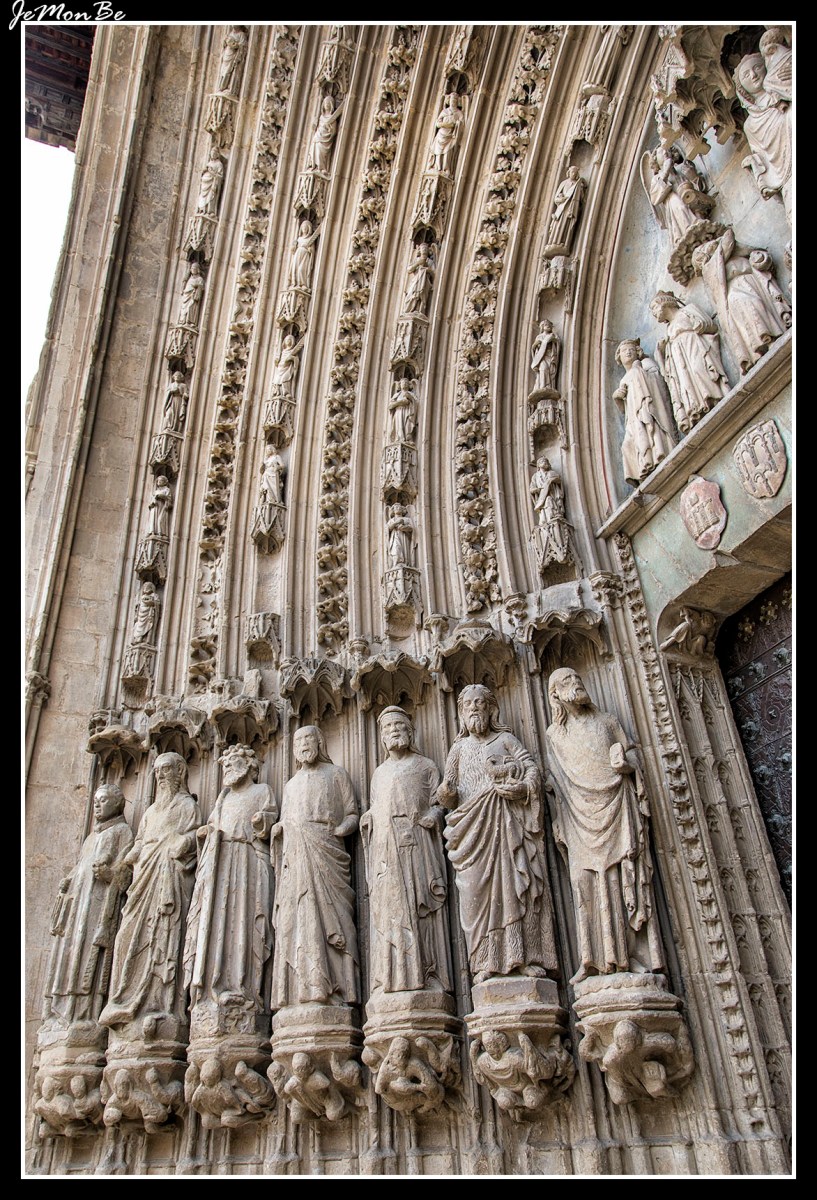 La portada principal está construida en estilo gótico y data de 1539. Está dividida en dos partes por un alero de madera muy volado al estilo aragonés del siglo XVI. La parte baja realizada por Guillem Inglés en 1327, con forma de gran arco apuntado de cuatro arquivoltas con decoración de figuras de mártires, vírgenes, ángeles y profetas.
