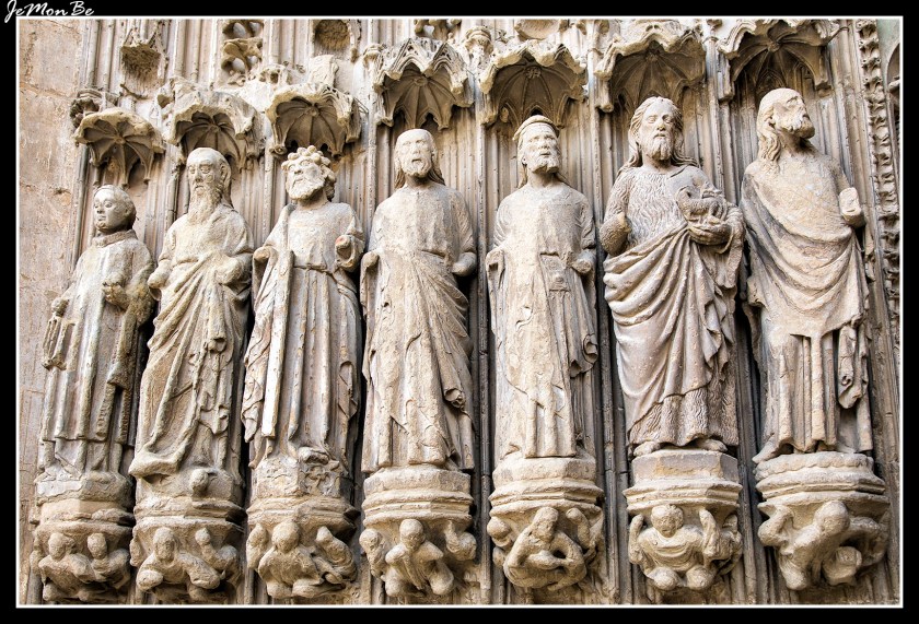 La portada principal está construida en estilo gótico y data de 1539. Está dividida en dos partes por un alero de madera muy volado al estilo aragonés del siglo XVI. La parte baja realizada por Guillem Inglés en 1327, con forma de gran arco apuntado de cuatro arquivoltas con decoración de figuras de mártires, vírgenes, ángeles y profetas.