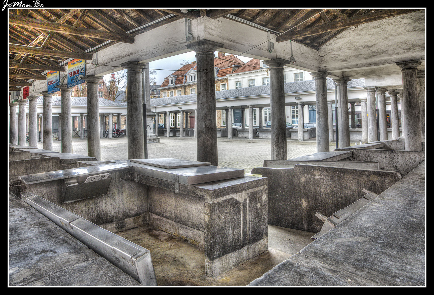 El antiguo mercado del pescado (Vismarkt) es una curiosa plaza de columnas en el centro de Brujas, hoy en día solo funciona el sábado. Esta original construcción de columnatas se realizó en 1821 cuando los pescadores fueron obligados a trasladarles aquí desde su ubicación en la plaza mayor debido al olor del pescado. La plaza está rodeada de restaurantes especializados en productos del mar.