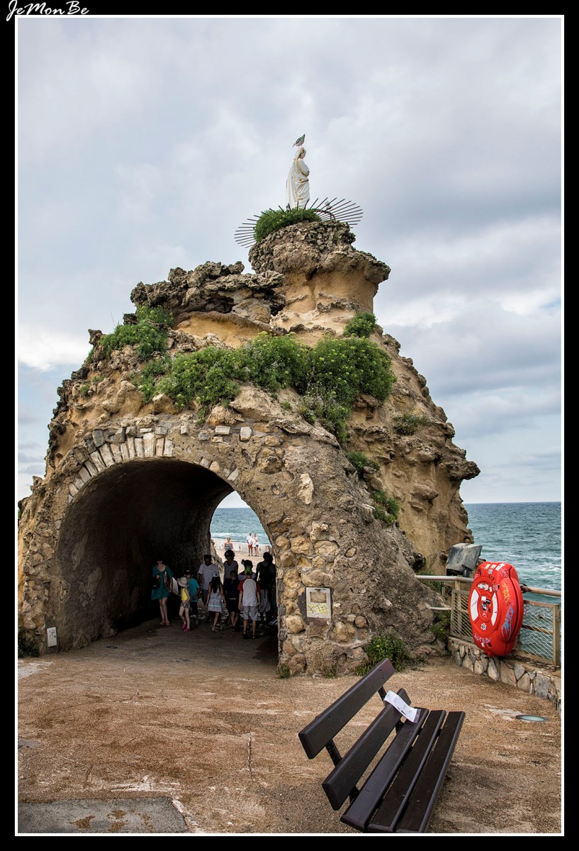 La Roca de la Virgen, la guardiana de los pescadores. Antiguamente la roca conectaba con la costa a través de un puente de madera que fue reemplazado por una magnífica pasarela de hierro diseñada por Gustave Eiffel. Cuenta la leyenda que a un barco que regresaba al muelle, le sorprendió una feroz tormenta que le impedía llegar al puerto, cuando, de repente apareció un rayo de luz que lo condujo a tierra firme. Como agradecimiento, se colocó la estatua de la Virgen en 1865. Este lugar es un lugar emblemático, desde lo alto de la roca se puede disfrutar de una de las mejores vistas de Biarritz.