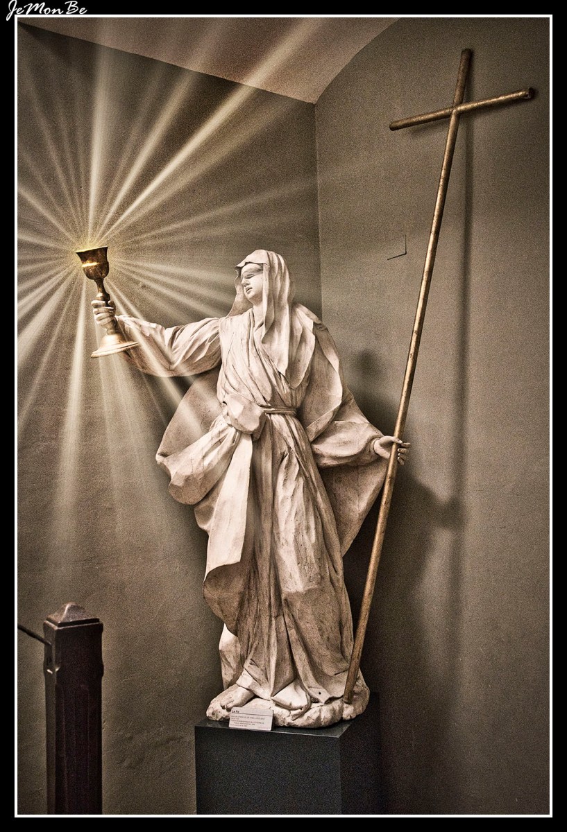 En el centro del tímpano se halla una talla de la virgen María con el Niño Jesús, entre dos ángeles turiferarios.