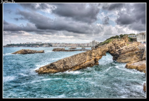 La Roca de la Virgen, la guardiana de los pescadores. Antiguamente la roca conectaba con la costa a través de un puente de madera que fue reemplazado por una magnífica pasarela de hierro diseñada por Gustave Eiffel. Cuenta la leyenda que a un barco que regresaba al muelle, le sorprendió una feroz tormenta que le impedía llegar al puerto, cuando, de repente apareció un rayo de luz que lo condujo a tierra firme. Como agradecimiento, se colocó la estatua de la Virgen en 1865. Este lugar es un lugar emblemático, desde lo alto de la roca se puede disfrutar de una de las mejores vistas de Biarritz.