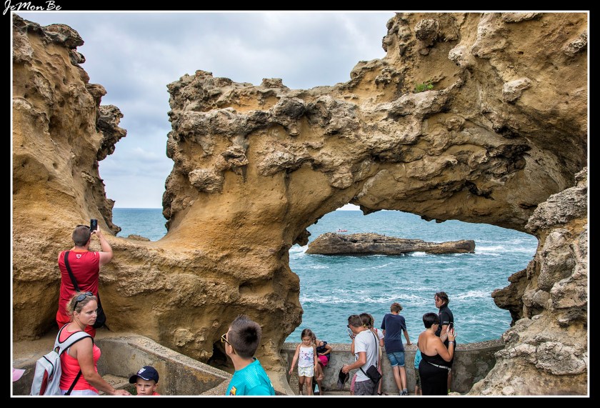 La Roca de la Virgen, la guardiana de los pescadores. Antiguamente la roca conectaba con la costa a través de un puente de madera que fue reemplazado por una magnífica pasarela de hierro diseñada por Gustave Eiffel. Cuenta la leyenda que a un barco que regresaba al muelle, le sorprendió una feroz tormenta que le impedía llegar al puerto, cuando, de repente apareció un rayo de luz que lo condujo a tierra firme. Como agradecimiento, se colocó la estatua de la Virgen en 1865. Este lugar es un lugar emblemático, desde lo alto de la roca se puede disfrutar de una de las mejores vistas de Biarritz.