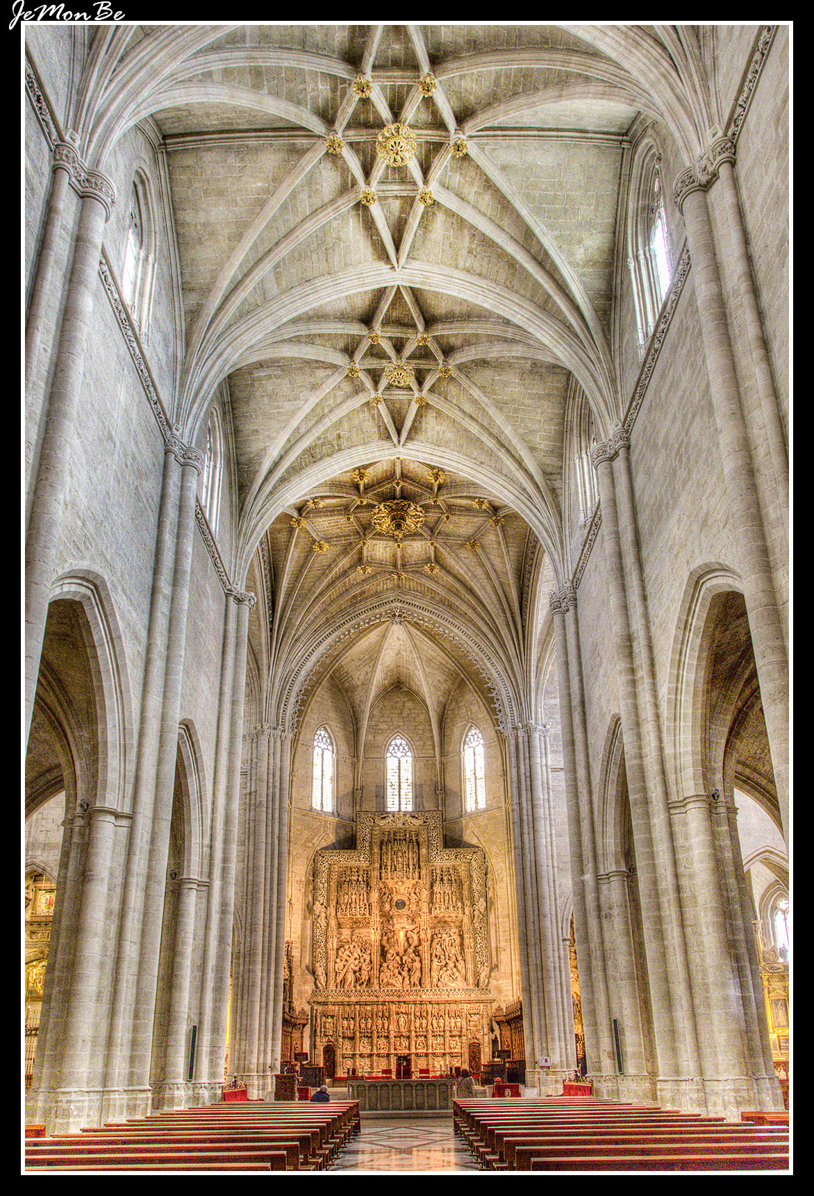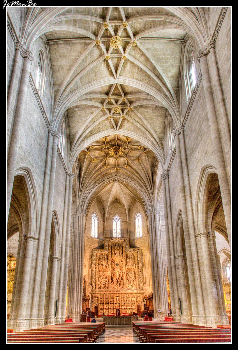 La planta es de cruz latina con capillas laterales y tres naves de cuatro tramos además del crucero.