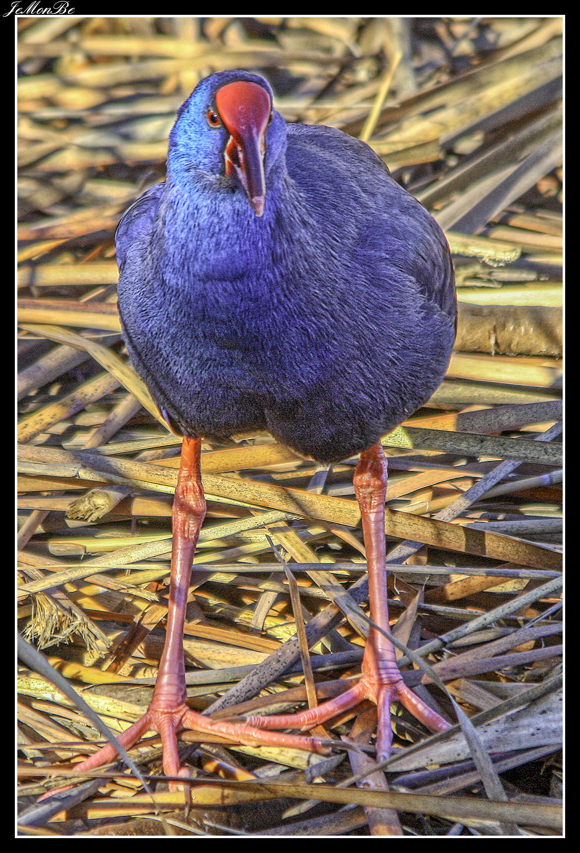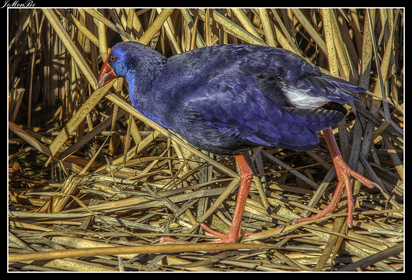Calamón común (Porphyrio porphyrio), es el más grande de los rálidos europeos es un ave de buen tamaño los adultos lucen un plumaje de tonos azulados y violáceos con reflejos purpúreos, que se torna azul metálico en la cara, la parte anterior del cuello y la zona superior del pecho; las infracoberteras caudales son de color blanco puro. Las partes desprovistas de plumas se caracterizan también por su viva coloración, especialmente durante la época de celo, ya que tanto el pico (cónico y robusto) como el escudete frontal y las patas rematadas por larguísimos dedos con gran capacidad prensil, lucen un intenso color carmesí. Este rálido, es un volador bastante torpe (no más de 15 o 20 metros) desplazándose con frecuentes aleteos, mientras mantiene colgando las patas; no obstante, se desplaza con soltura entre las cañas.