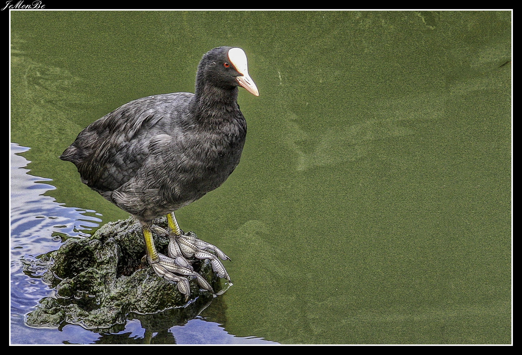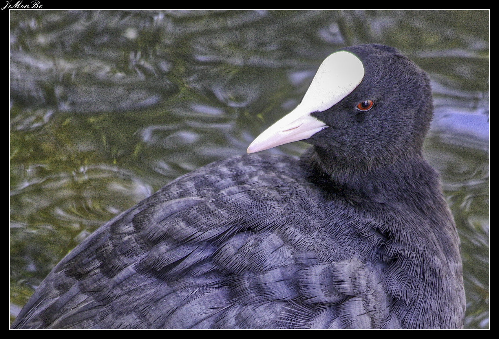 Focha común (Fulica atra), este rálido robusto y de buen tamaño se caracteriza por presentar un plumaje prácticamente negro, a excepción de los flancos y las zonas inferiores, que adquieren un cierto tono grisáceo, y las puntas de las rémiges secundarias, que son blancas. El aspecto más llamativo de la anatomía de esta especie es la posesión de un escudete frontal blanco que se estrecha hacia la base del pico, también de color blanco.
