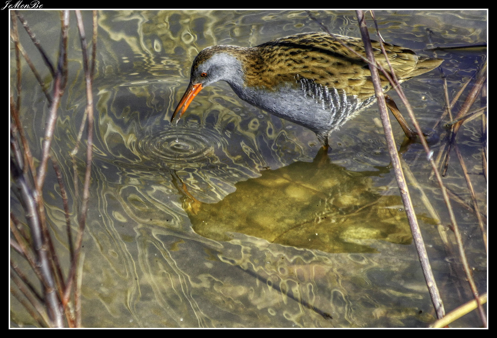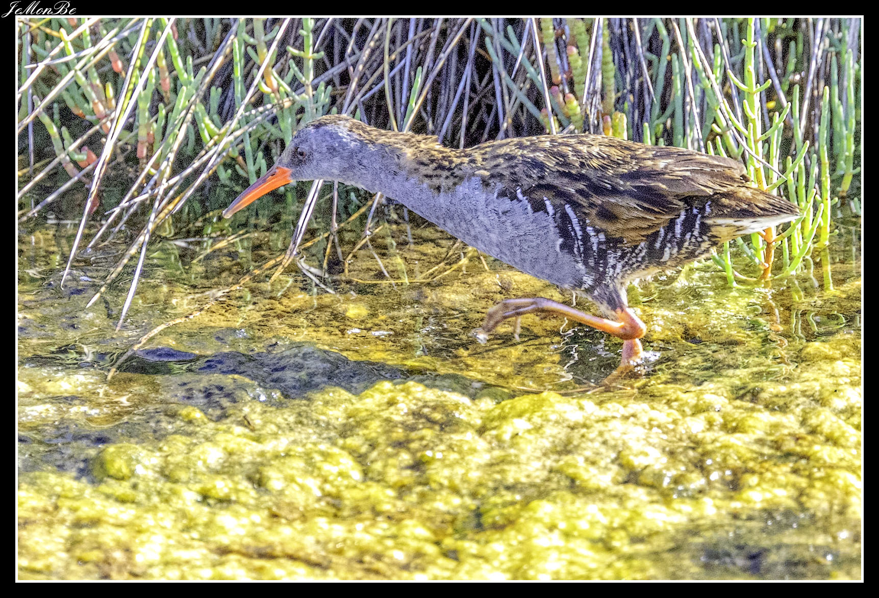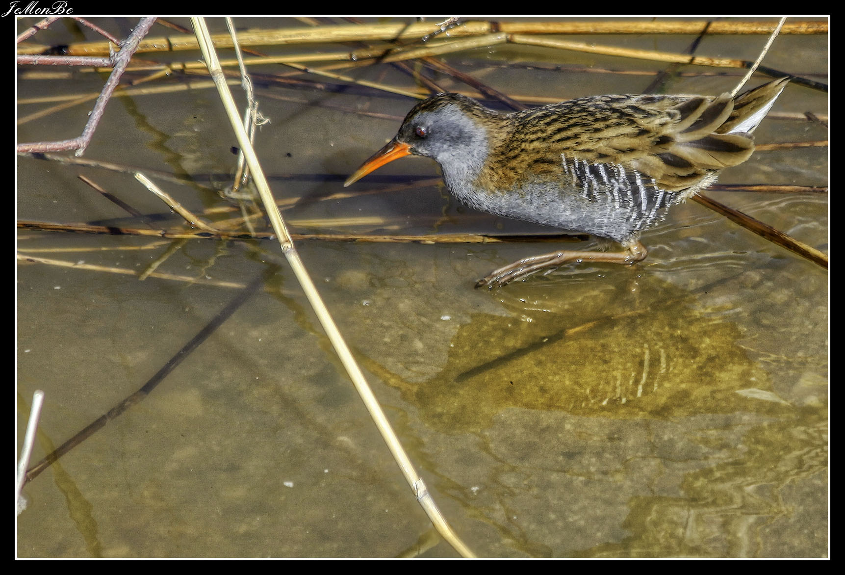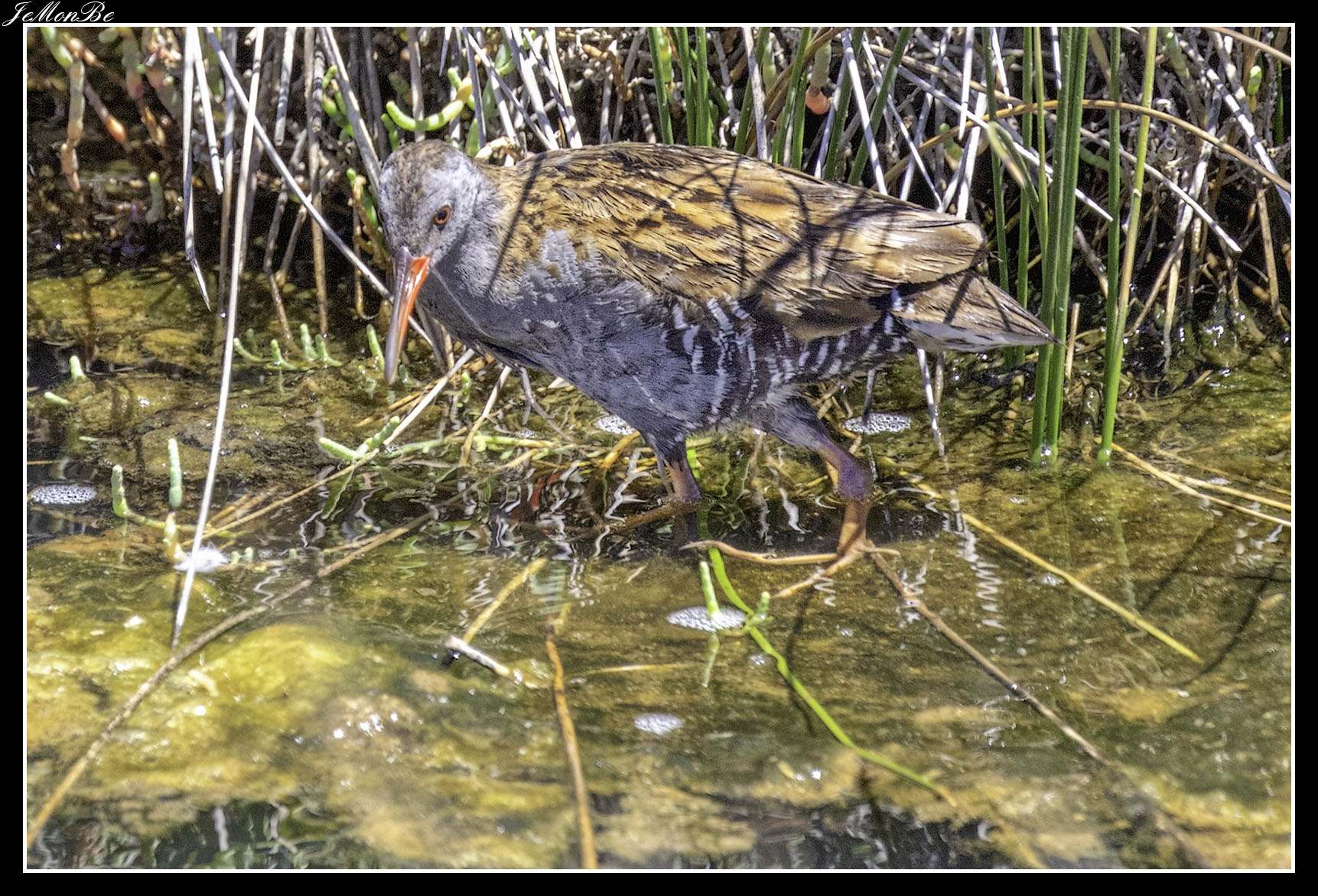 Rascón europeo (Rallus aquaticus). Ambos adultos resultan muy similares, las hembras algo menores y con el pico más corto, y en ellos el largo pico es de color rojo intenso la coloración de las regiones dorsales es pardo-olivácea con los centros de las plumas negruzcos, en tanto que la cara, la frente, el pecho y el vientre muestran una tonalidad gris-azulada oscura. Los flancos aparecen listados de blanco y negro, mientras que las infracoberteras caudales resaltan vivamente por su llamativo color blanco. Reacio a, cuando se eleva sobre el agua o la vegetación palustre, con aleteos rápidos y las patas colgantes, se desplaza únicamente trechos cortos.