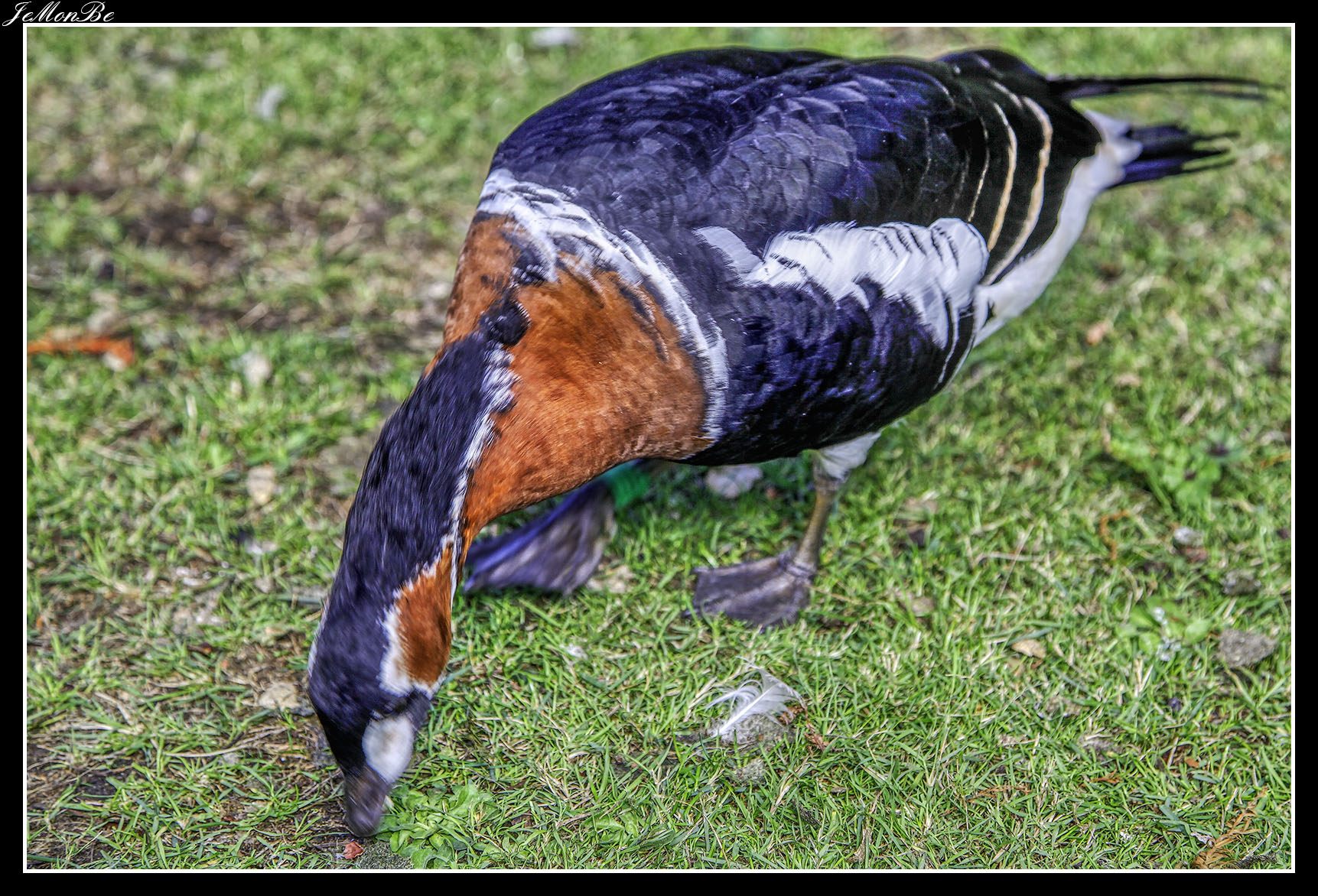 Barnacla cuellirroja (Branta ruficollis), este pequeño ganso es inconfundible por su llamativa coloración blanquinegra, con amplias superficies de color castaño intenso en la cara y el pecho. Se reproduce en la tundra, durante las migraciones y la invernada prefiere terrenos esteparios, entre los que se incluyen estepas salinas, pastizales semiáridos y, a menudo, cultivos de cereal. Esta especie depende menos del agua que otras barnaclas.