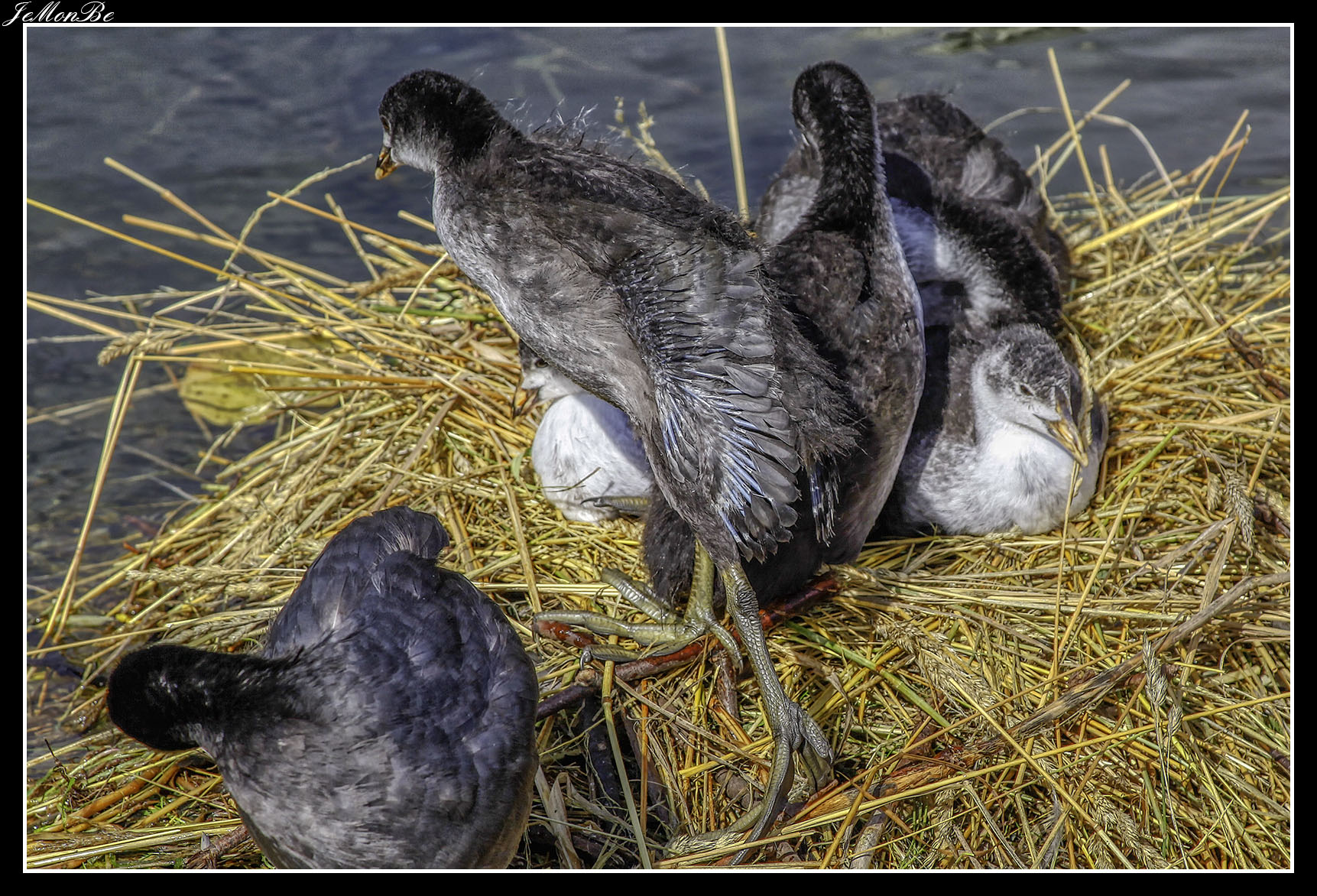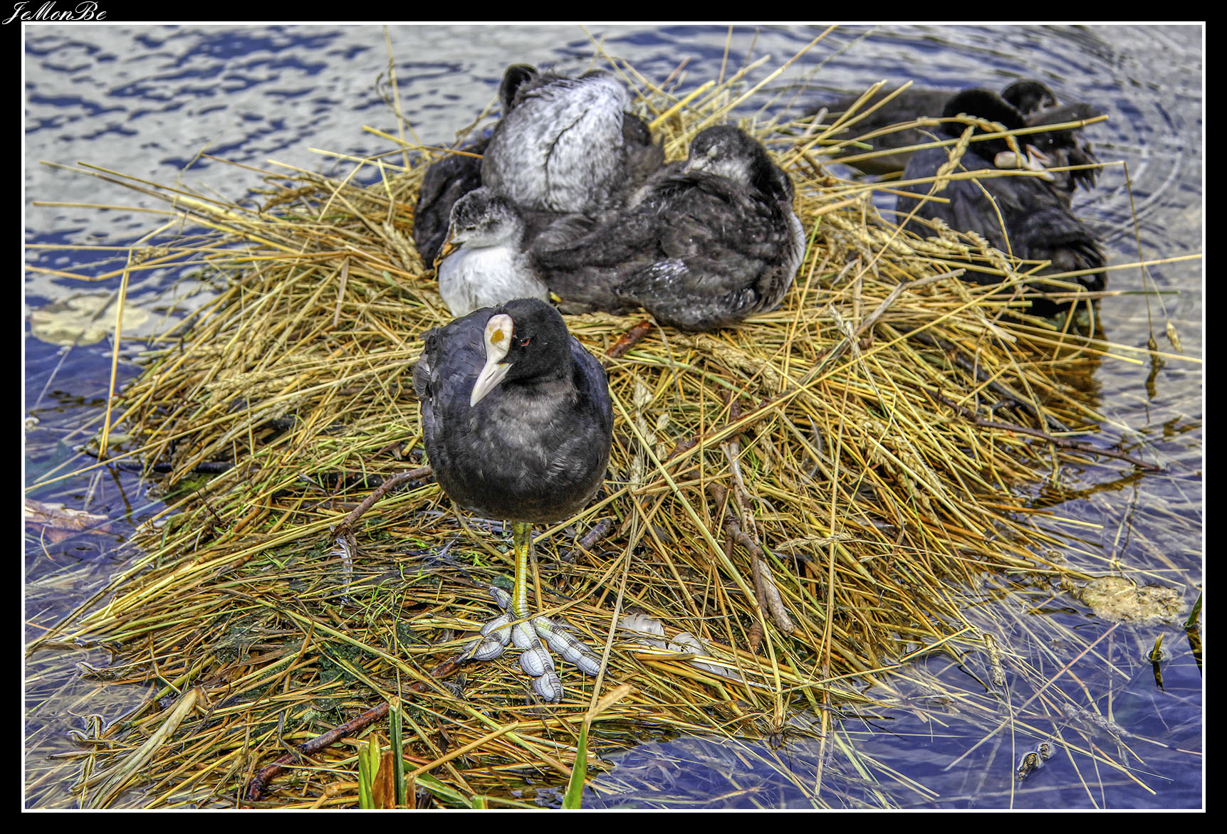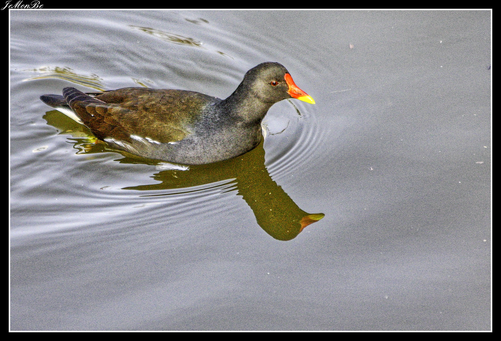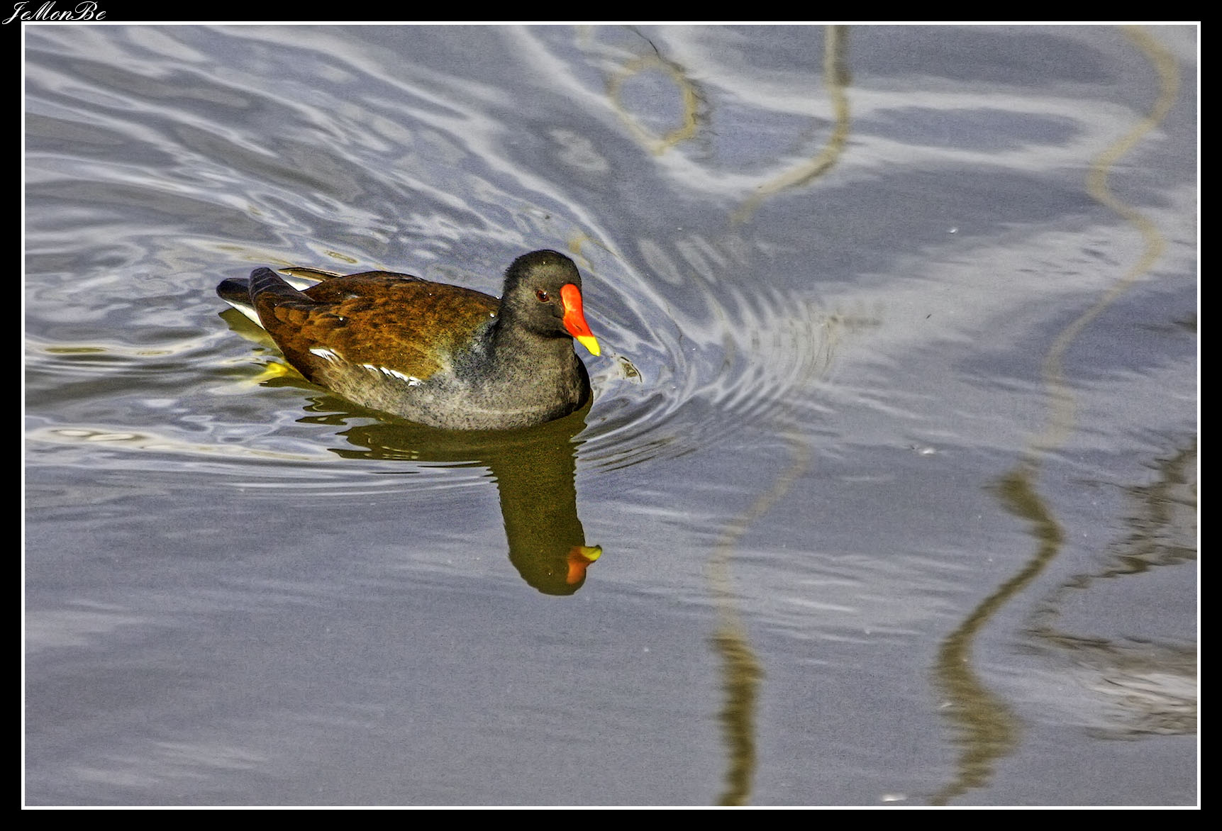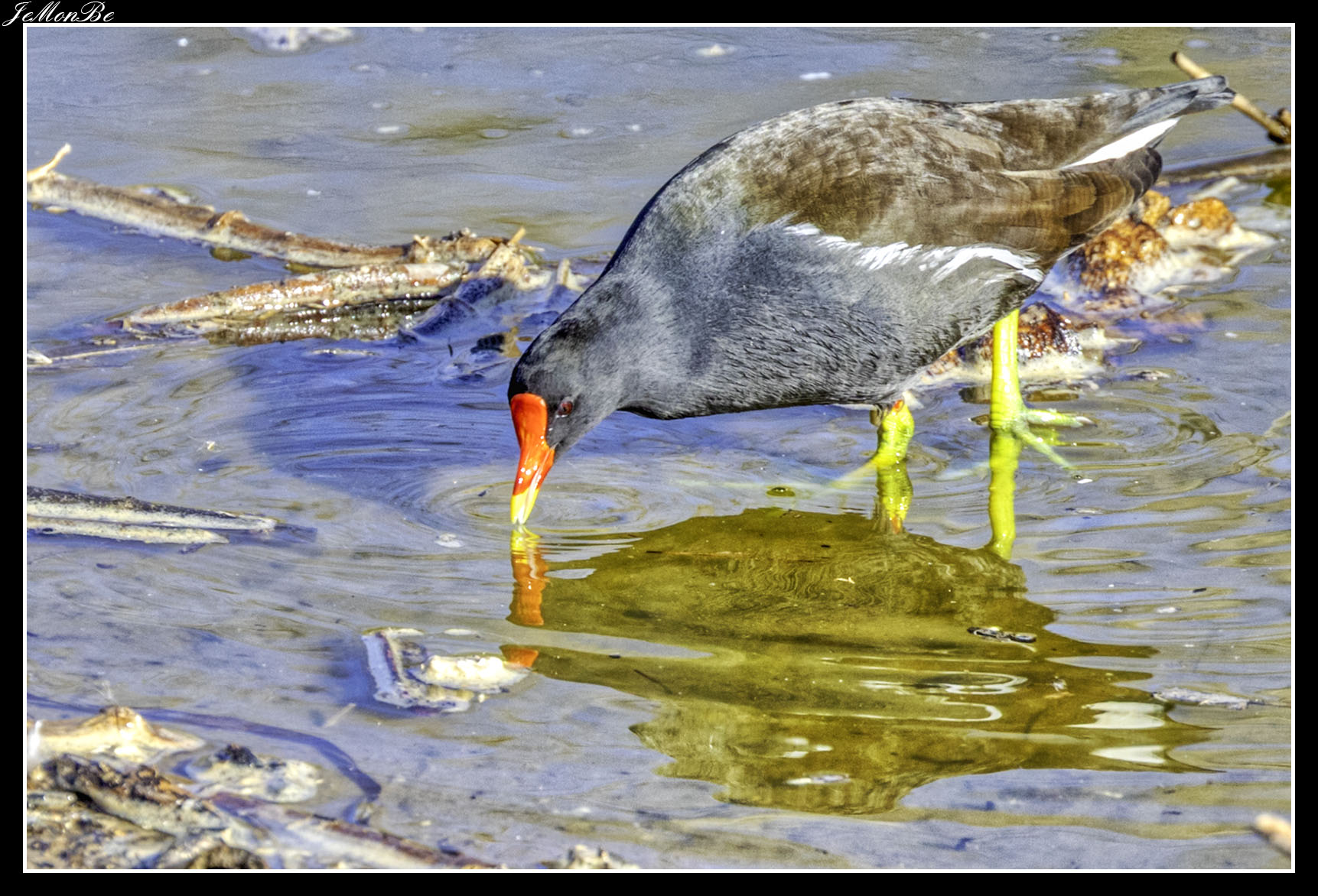 Polla de agua (Gallinula chloropus), su plumaje es gris negruzco, con la cabeza y el cuello más oscuros, salvo la zona bajo la cola que es blanca, y sendas franjas también blancas que atraviesan transversalmente sus flancos. Su pico es rojo, al igual que el escudo facial, excepto en la punta que es amarilla. Su escudo facial es redondeado en la parte superior mientras que sus laterales son rectos y bastante paralelos. Sus patas son de color amarillo verdoso, con una mancha roja en las rodillas. Tienen unos dedos muy largos que carecen de los lóbulos de las fochas y cualquier membrana interdigital, adaptados para andar sobre la vegetación acuática. Los juveniles son de tonos parduzcos y carecen del escudo facial rojo.