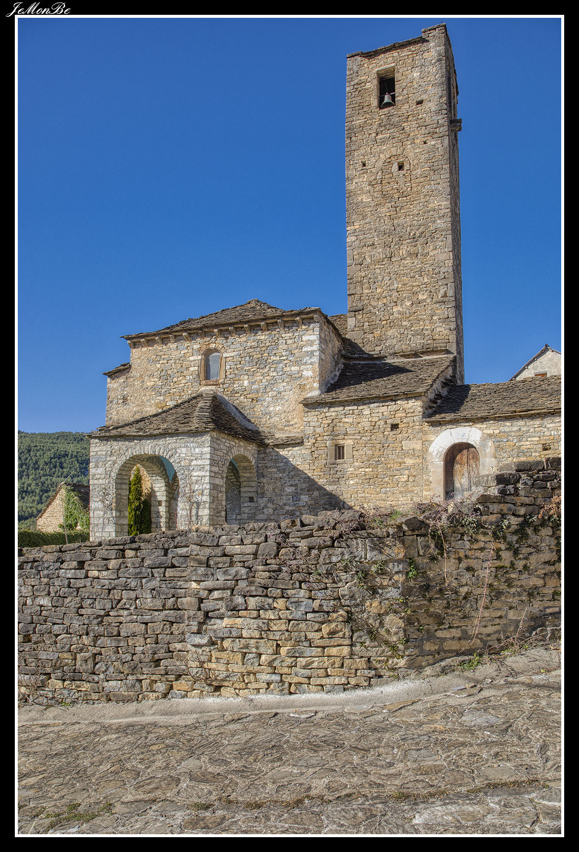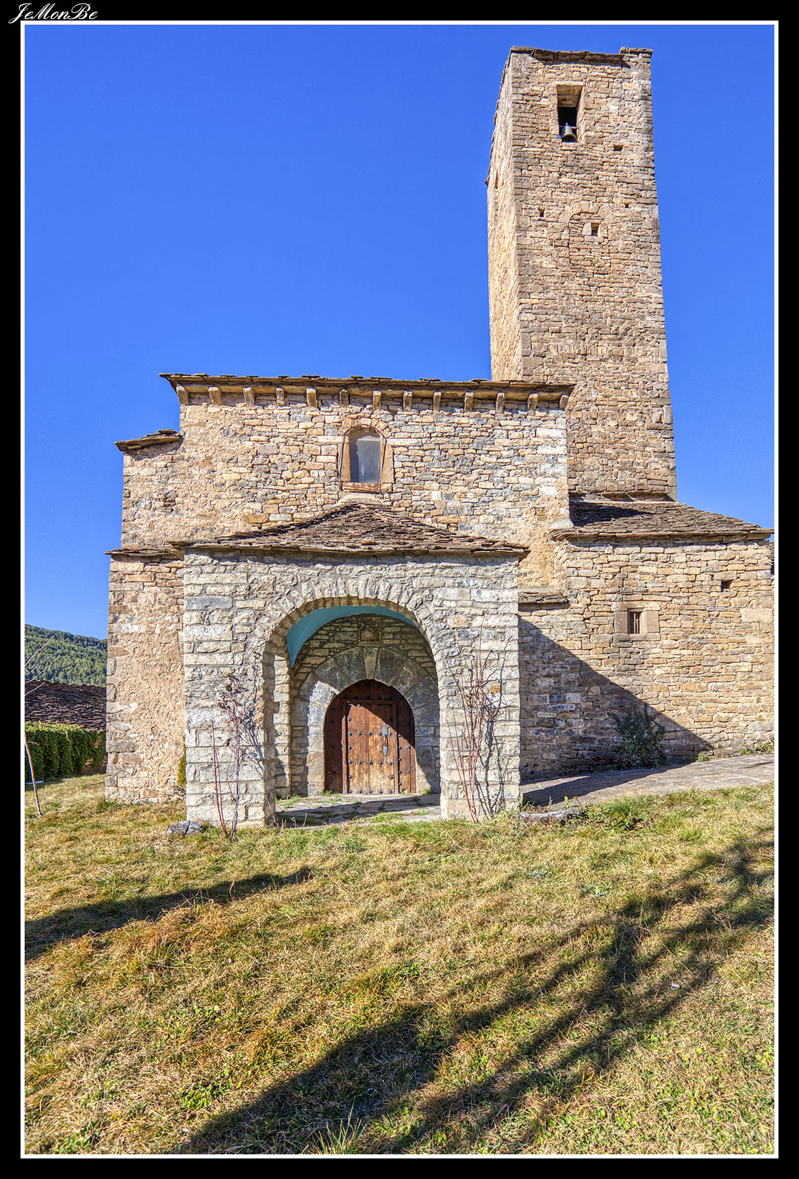 Su iglesia parroquial en origen fue románica; pero ha sufrido numerosas transformaciones que dificultan su comprensión. La nave, orientada canónicamente, aún guarda al exterior parte de su muro sur, conteniendo la portada original, cegada, de doble arquivolta, impostas lisas y jambas rectas.