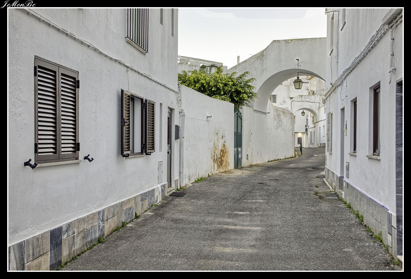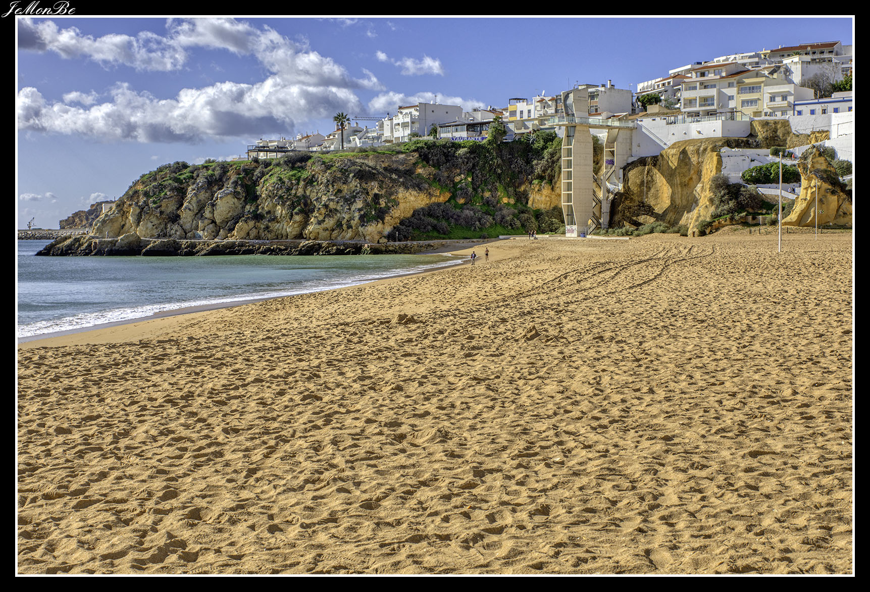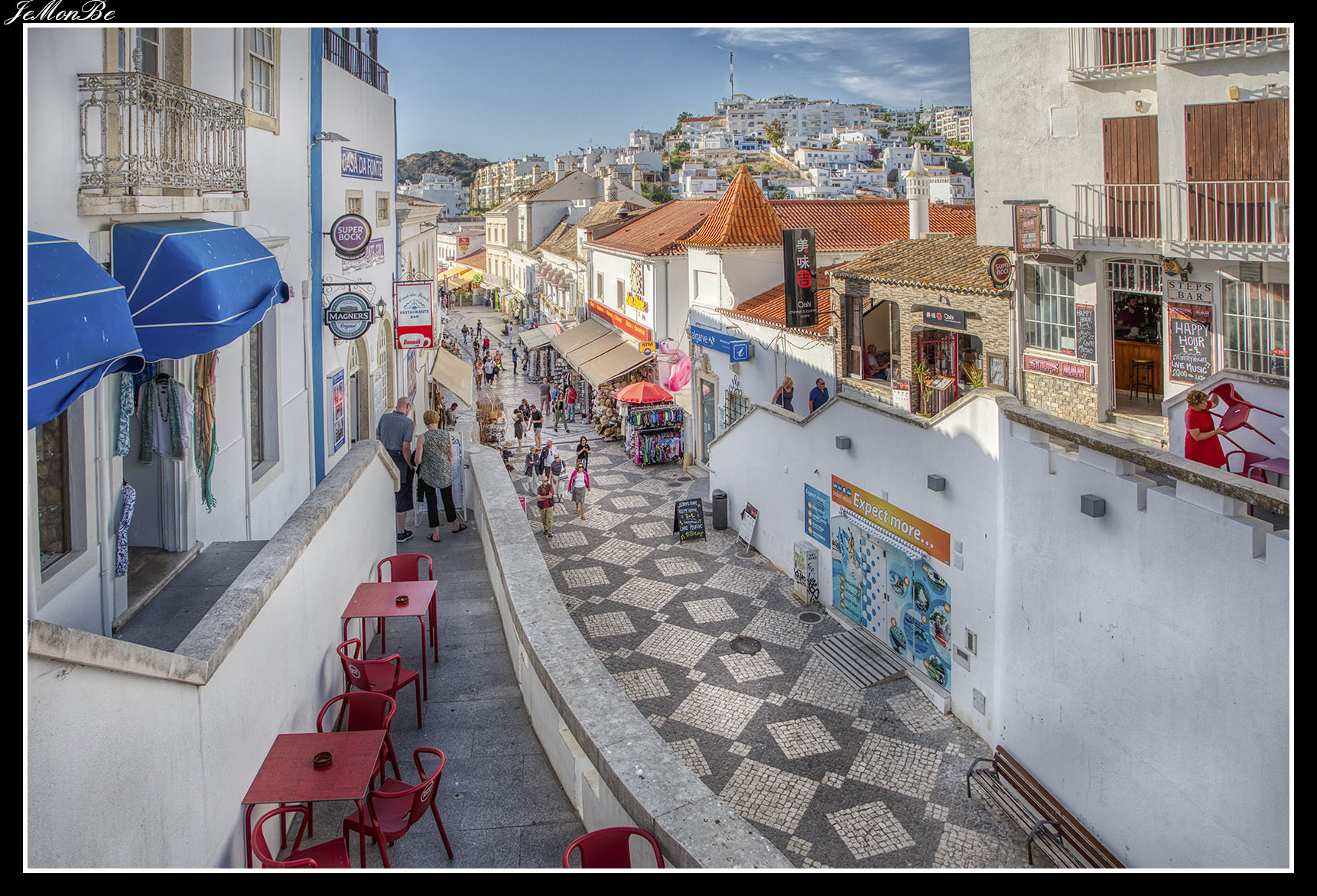 El centro histórico de Albufeira es pequeño, pero pintoresco. Tiene una plaza central donde se han acumulado muchos restaurantes y tiendas, además de alguna discoteca que desentona con sus neones desde el primer piso de alguno de sus edificios, y una calle comercial que concluye en una pequeña cueva que da acceso a la playa de la ciudad, pequeña y casi siempre saturada de bañistas, pero muy agradable.