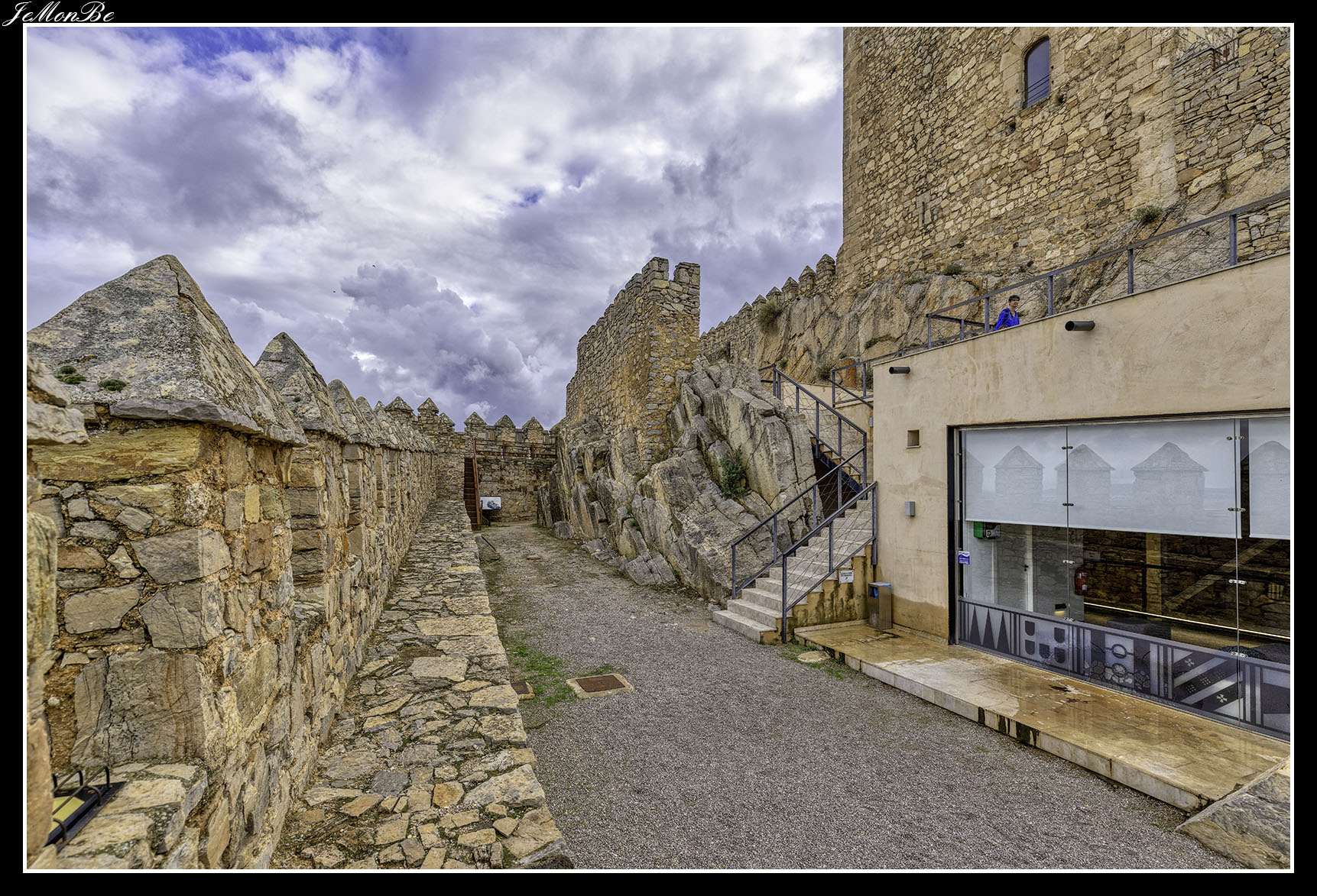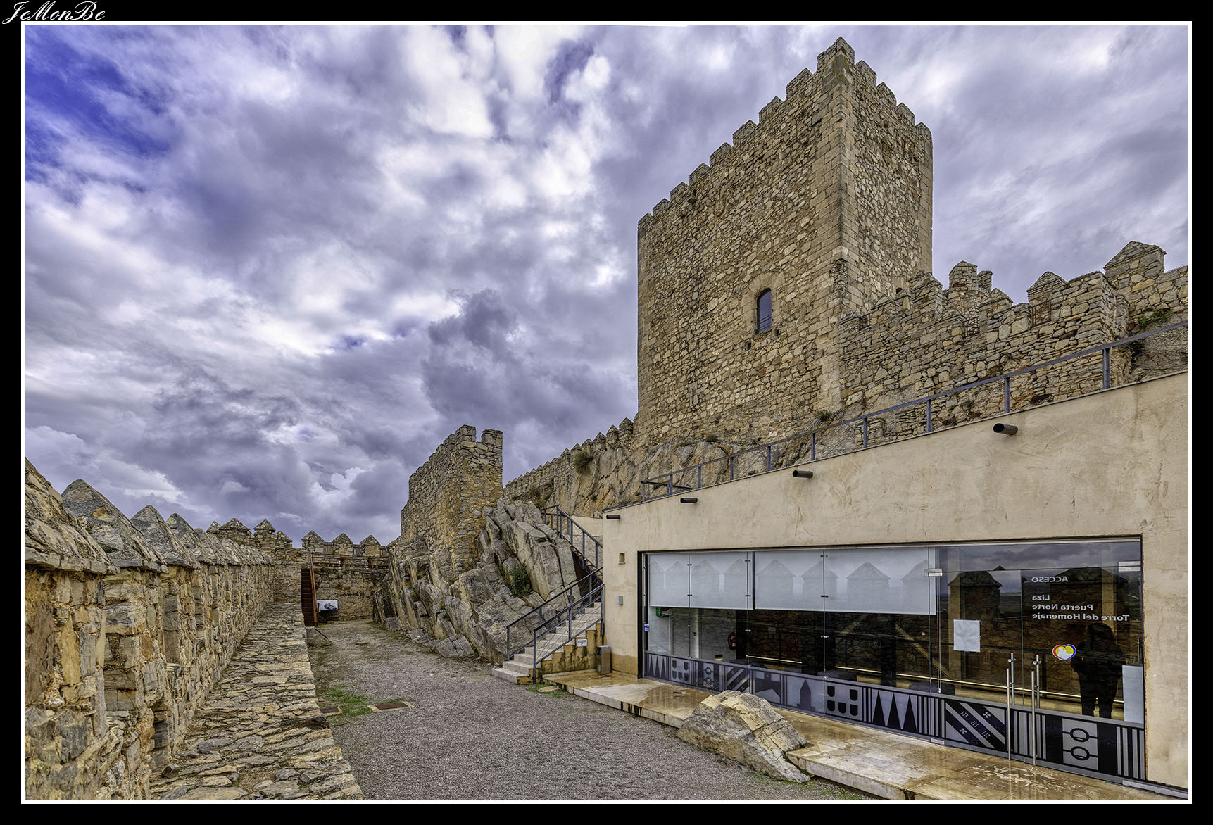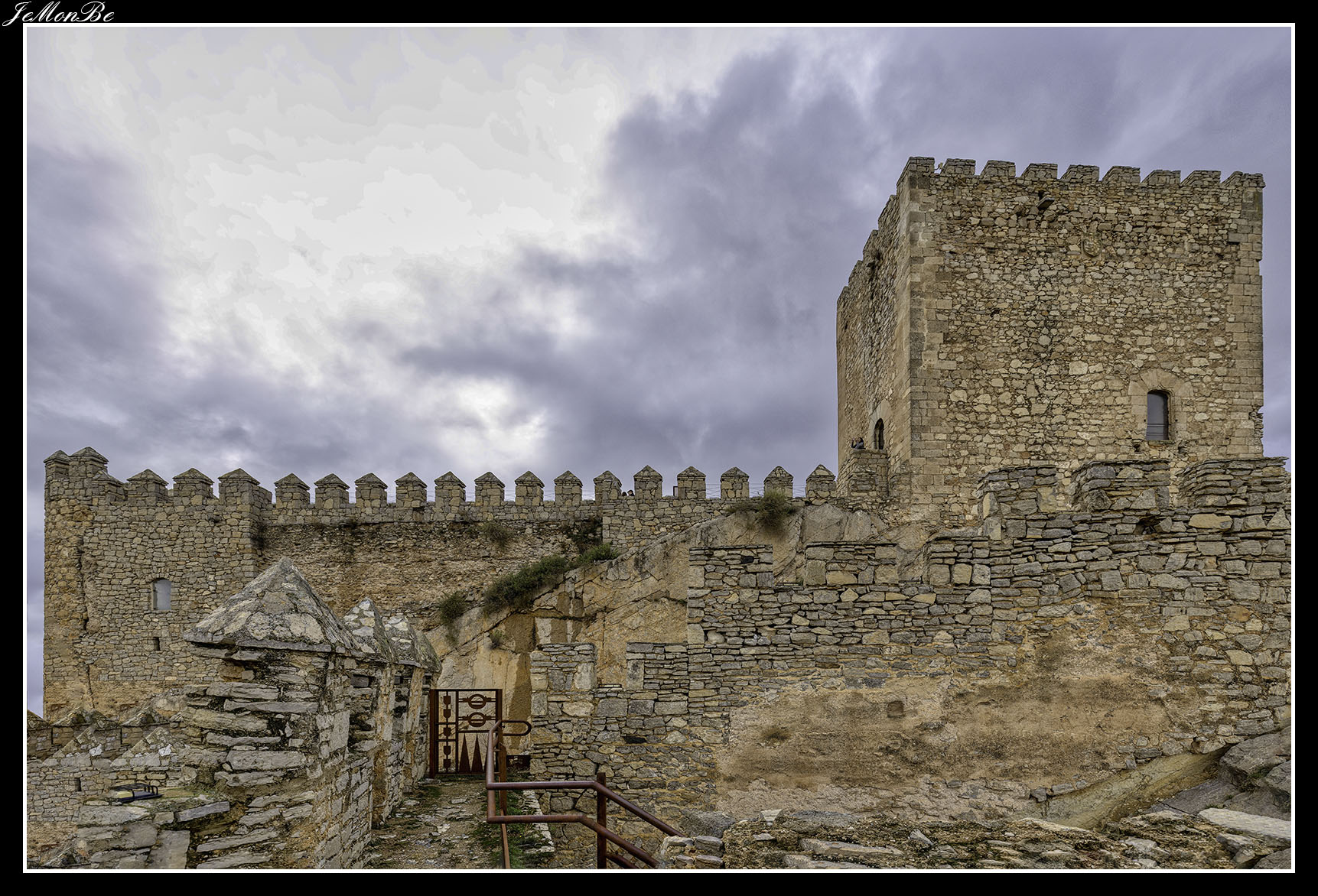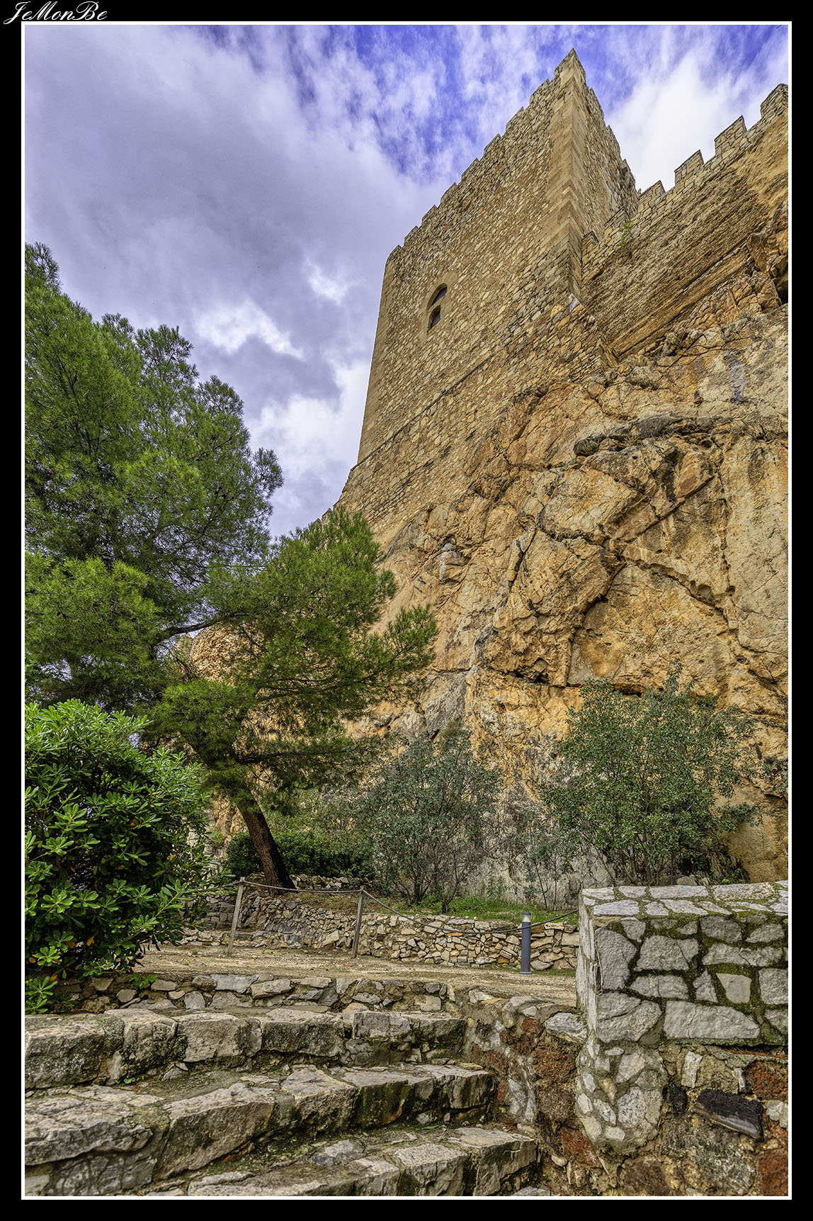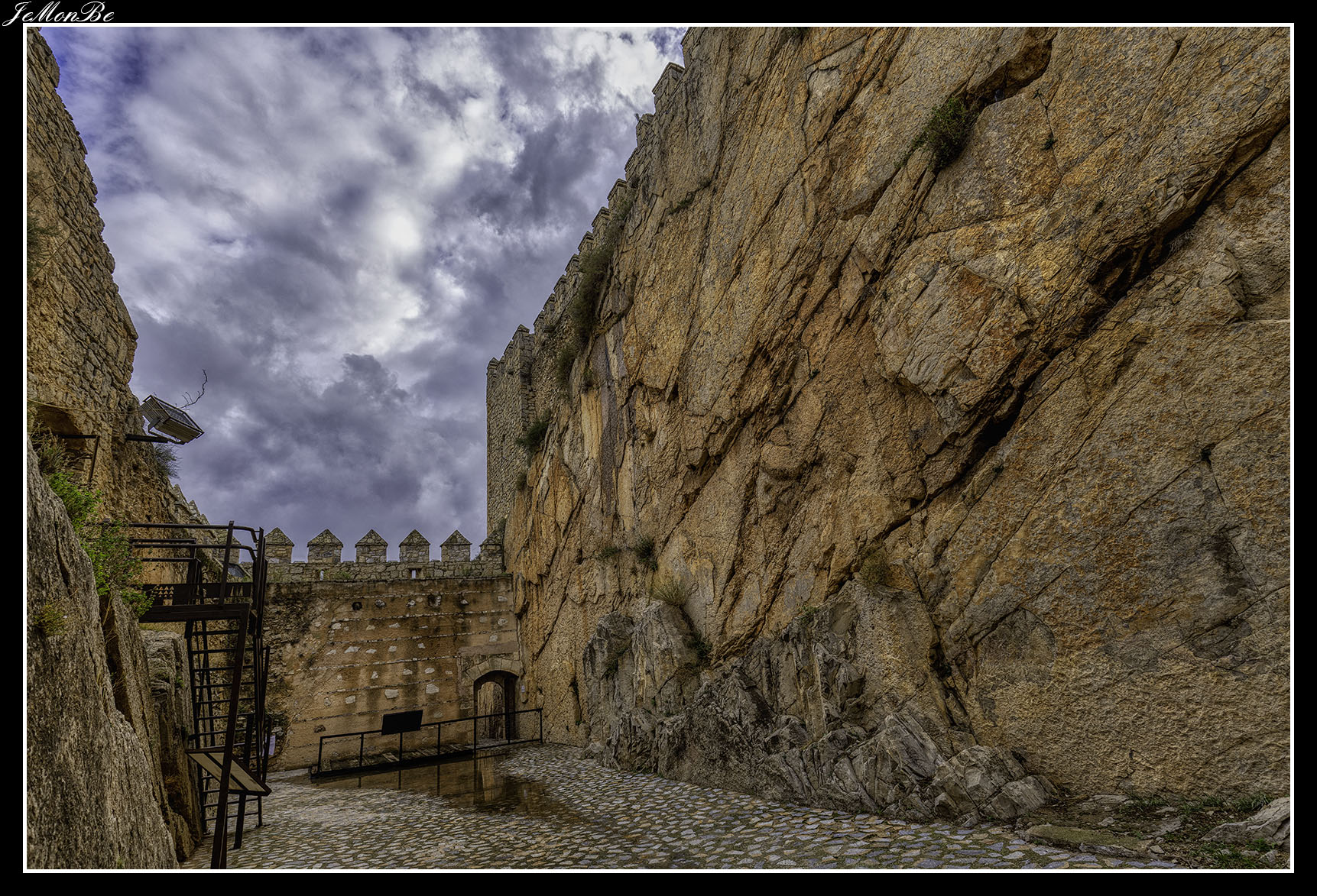 Cuando entramos estaremos en el patio de armas, que era una zona reservada para los artesanos y los almacenes. Desde este patio se accede a las distintas partes de la fortaleza, restos de la zona palaciega de la antigua fortaleza árabe, la puerta norte por donde subían los carros, las troneras para las armas de fuego y el acceso a las murallas que permitían la defensa.