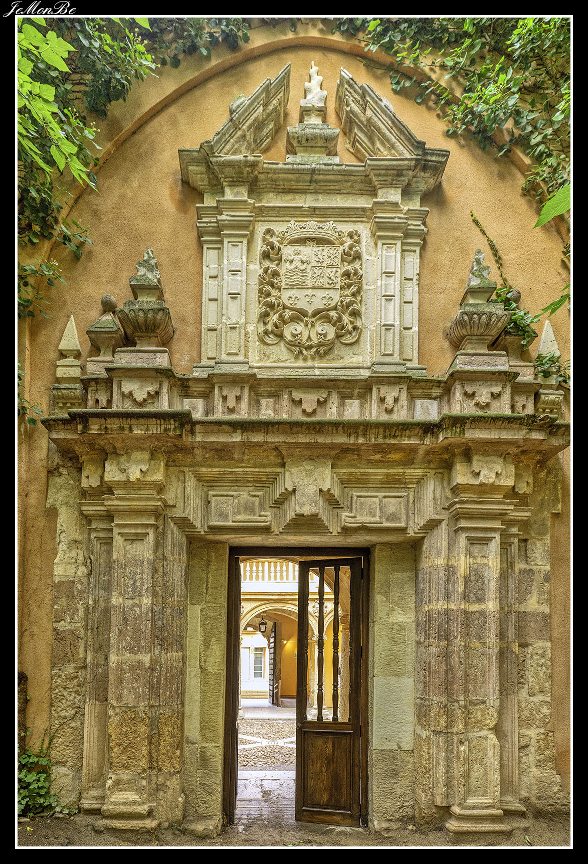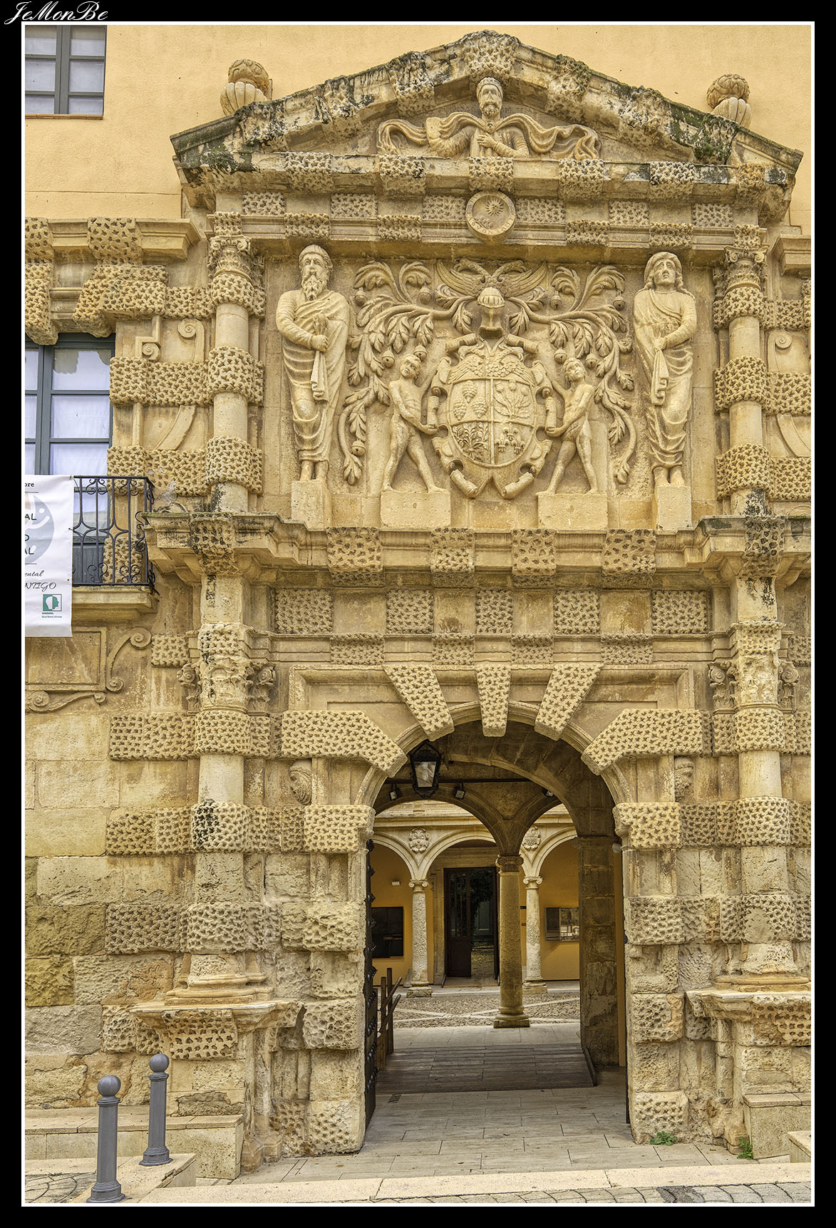 La portada posee un vano de entrada con arco de medio punto y columnas fajadas almohadilladas a ambos lados, extendiéndose este fajamiento rústico hacia el segundo cuerpo y los ventanales laterales. El cuerpo superior tiene columnas compuestas que enmarcan el tema fundamental de la heráldica, apareciendo en el centro el escudo del linaje de los Pina sujetado por dos niños. Todo el conjunto queda rematado por un frontón en el que aparece un busto coronado con la inscripción SCIPIO.