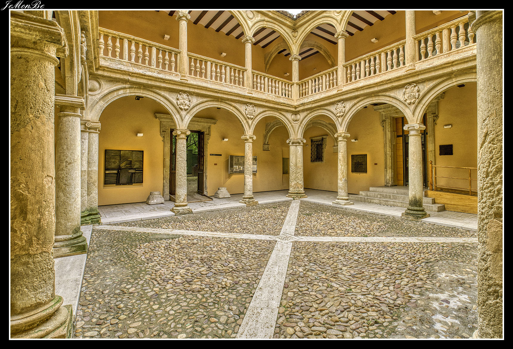 El edificio, de dos plantas, se distribuye en torno a un patio de planta cuadrada al que dan galerías con arco de medio punto sostenido por columnas jónicas. Sobre la puerta sur, por la que se accede al jardín, hay un escudo similar al de la fachada principal, pero de menor tamaño y peor estado.