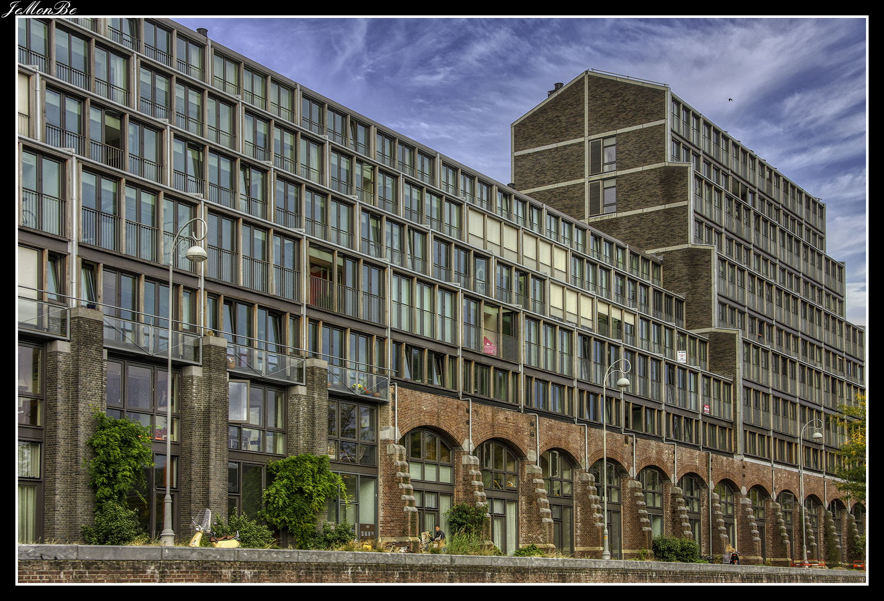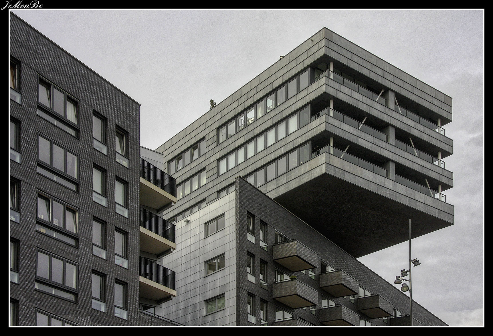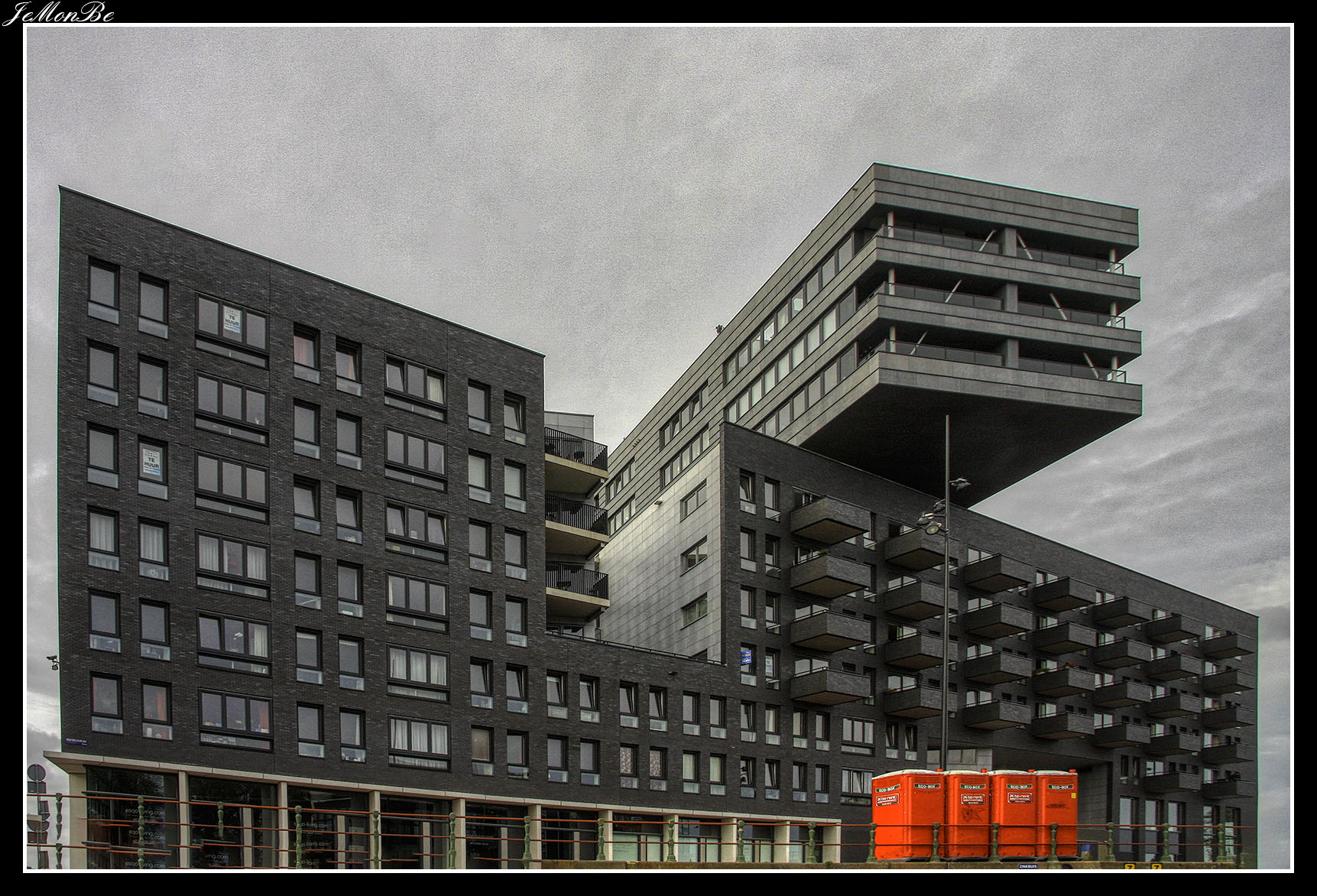 Westerdok 128 edificio residencial de apartamentos conocido por su diseño arquitectónico moderno y distintivo. Se caracteriza por su fachada de ladrillo oscuro y una sección superior que se proyecta en voladizo sobre la parte inferior.