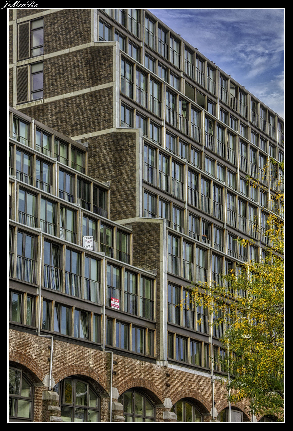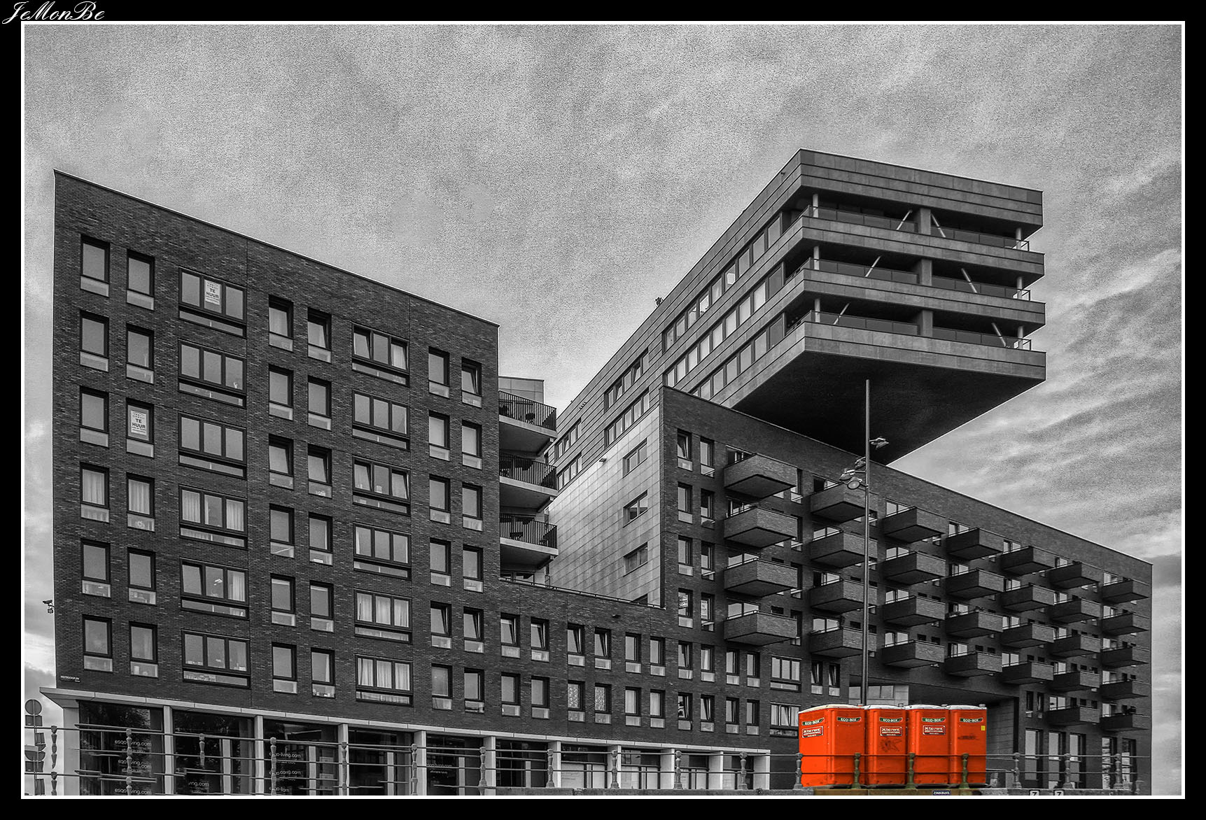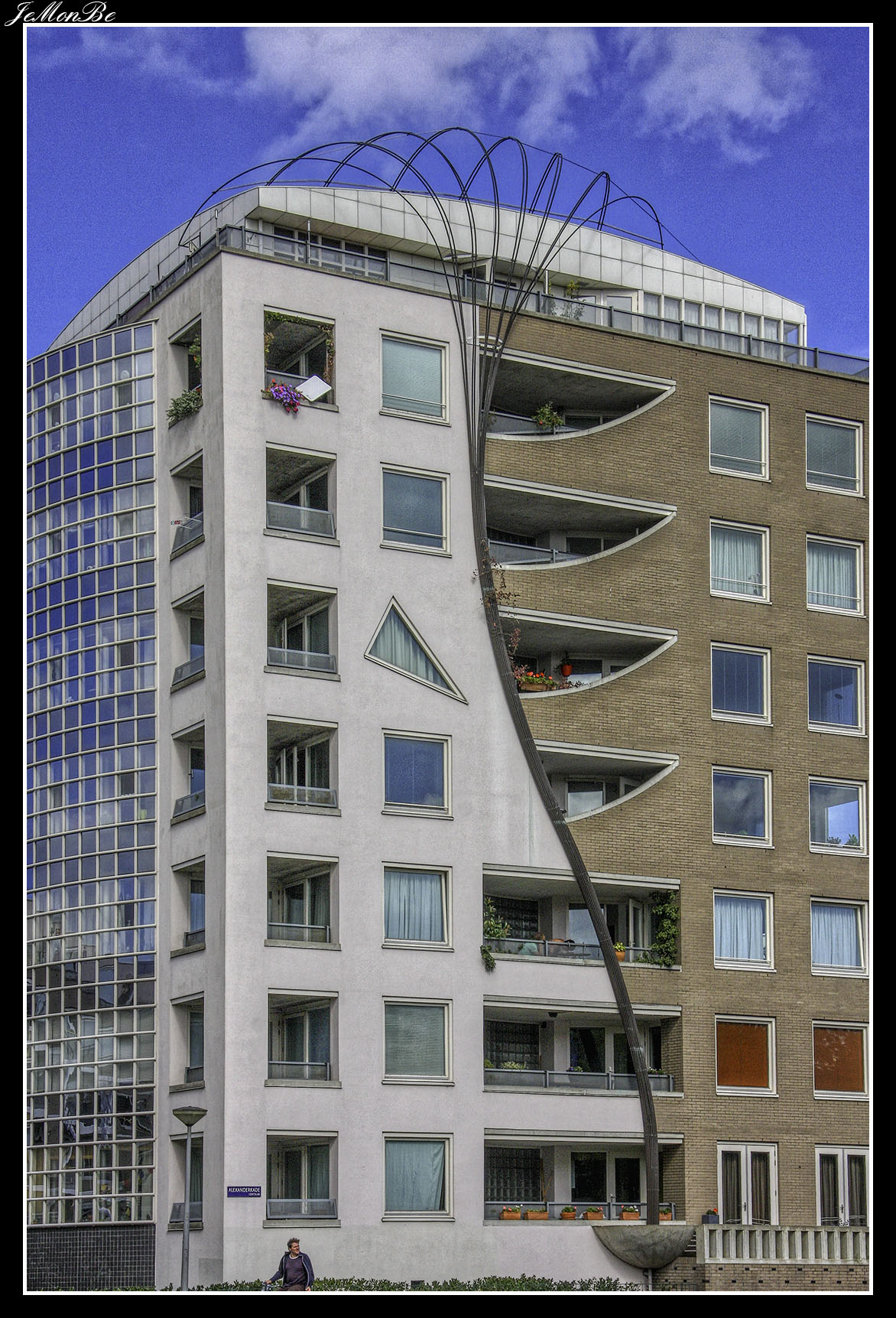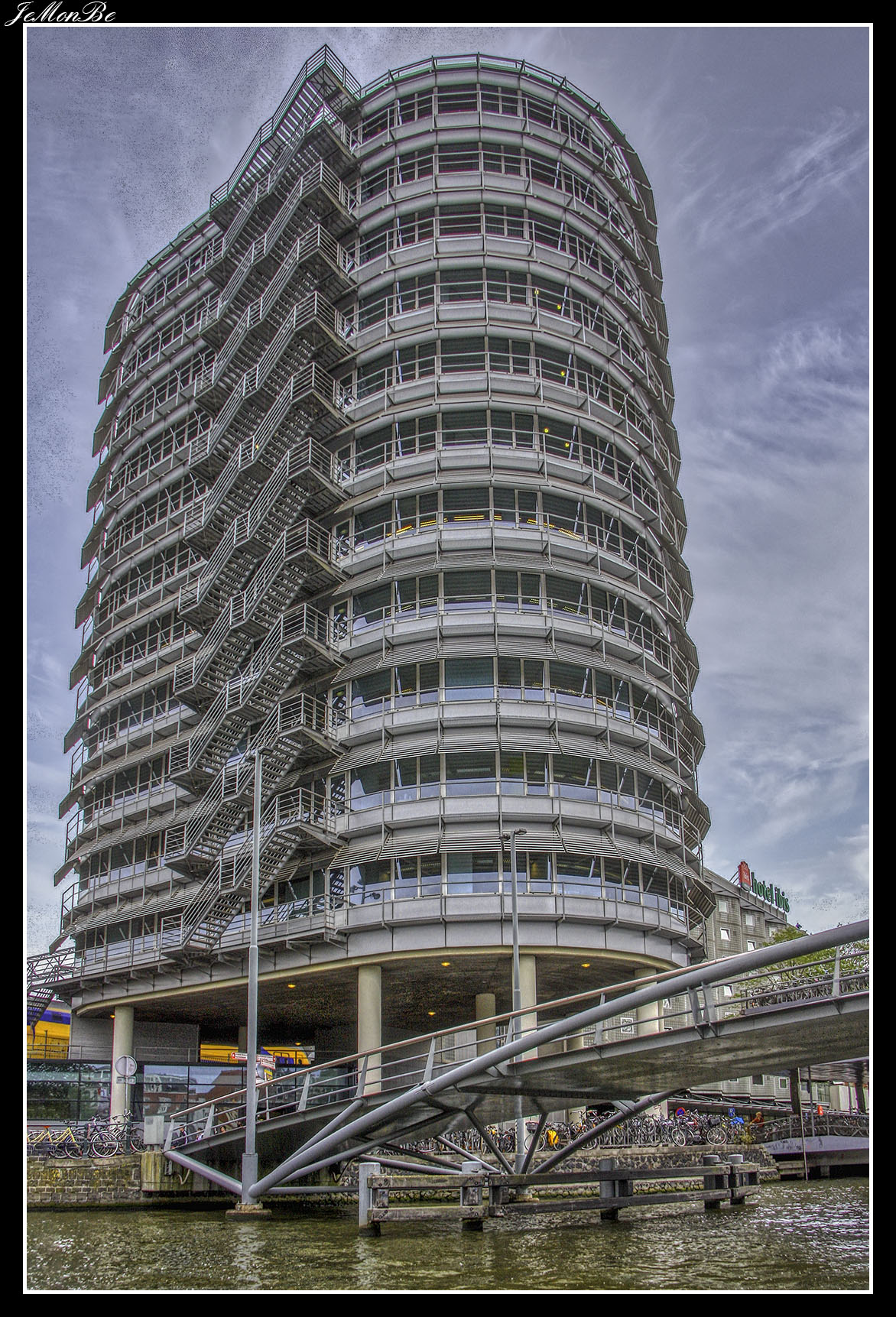 Westerdok 128 edificio residencial de apartamentos conocido por su diseño arquitectónico moderno y distintivo. Se caracteriza por su fachada de ladrillo oscuro y una sección superior que se proyecta en voladizo sobre la parte inferior.