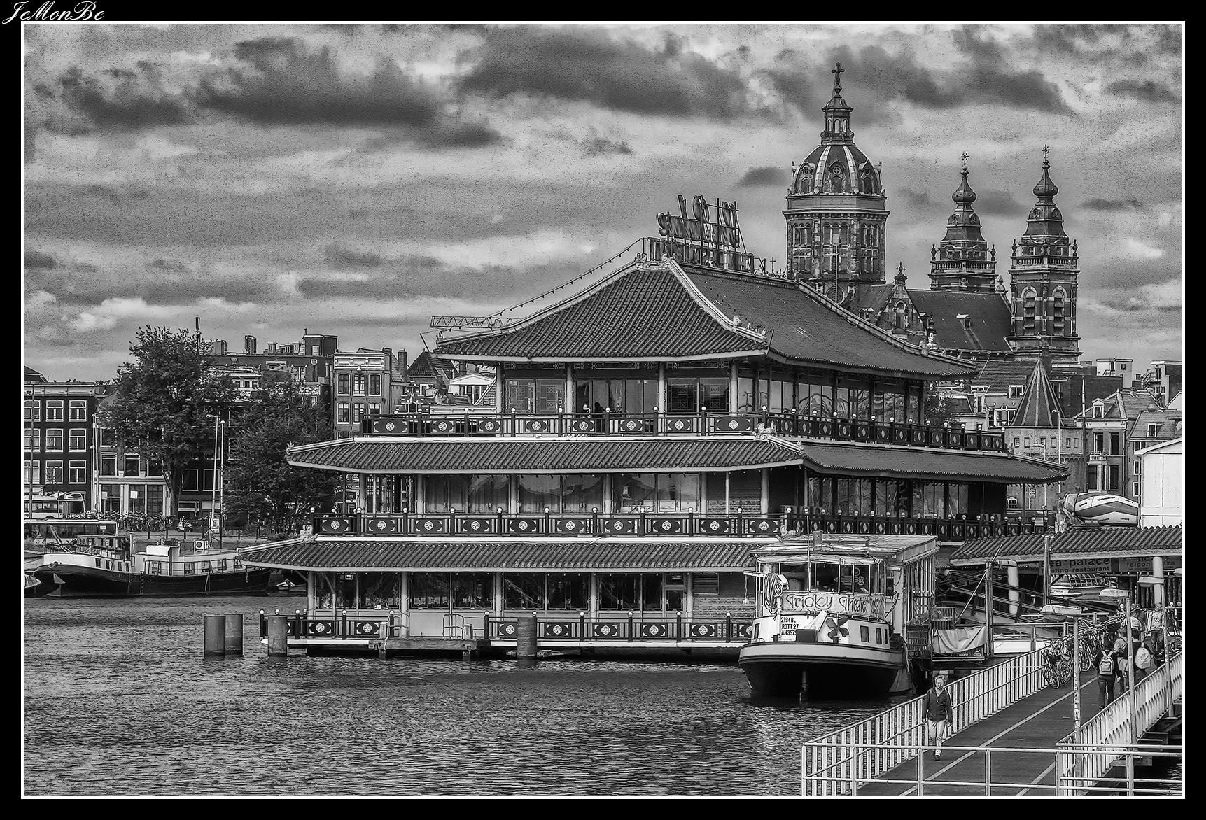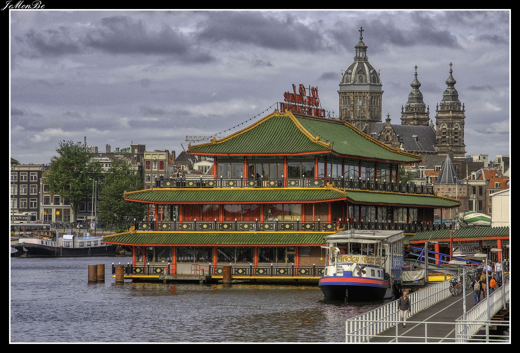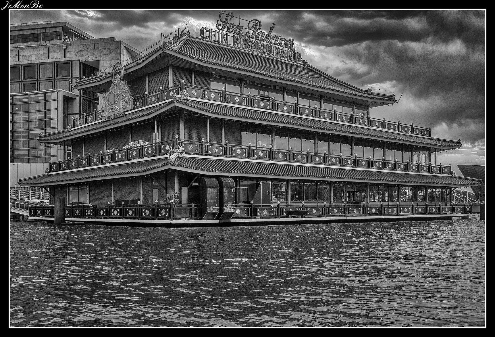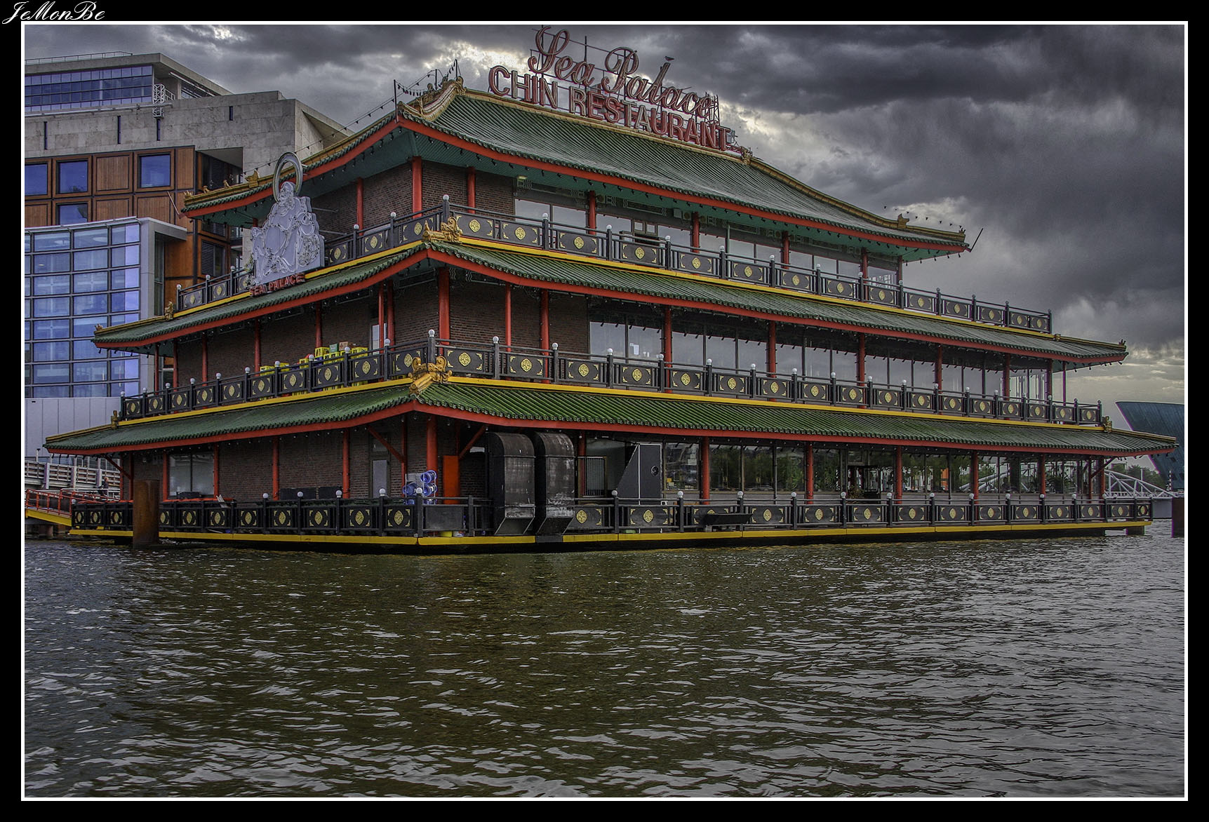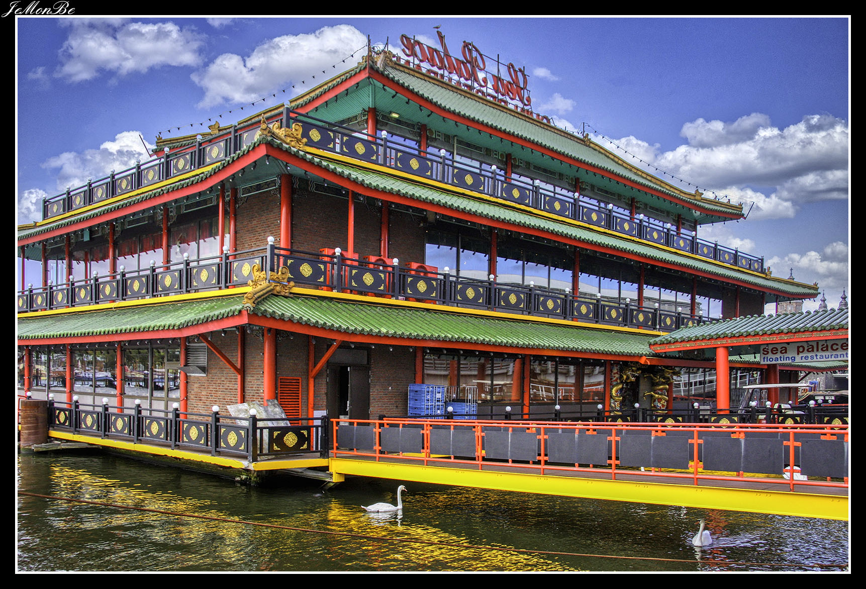 El edificio de estilo pagoda flotante es el Sea Palace Restaurant, conocido por ser el primer restaurante chino flotante de Europa. Se encuentra conectado a tierra firme mediante una pasarela metálica. Detrás del restaurante se puede ver la Basílica de San Nicolás.