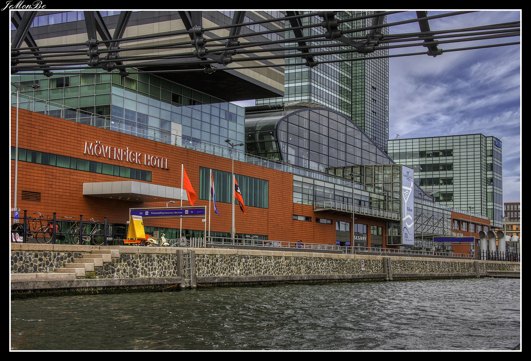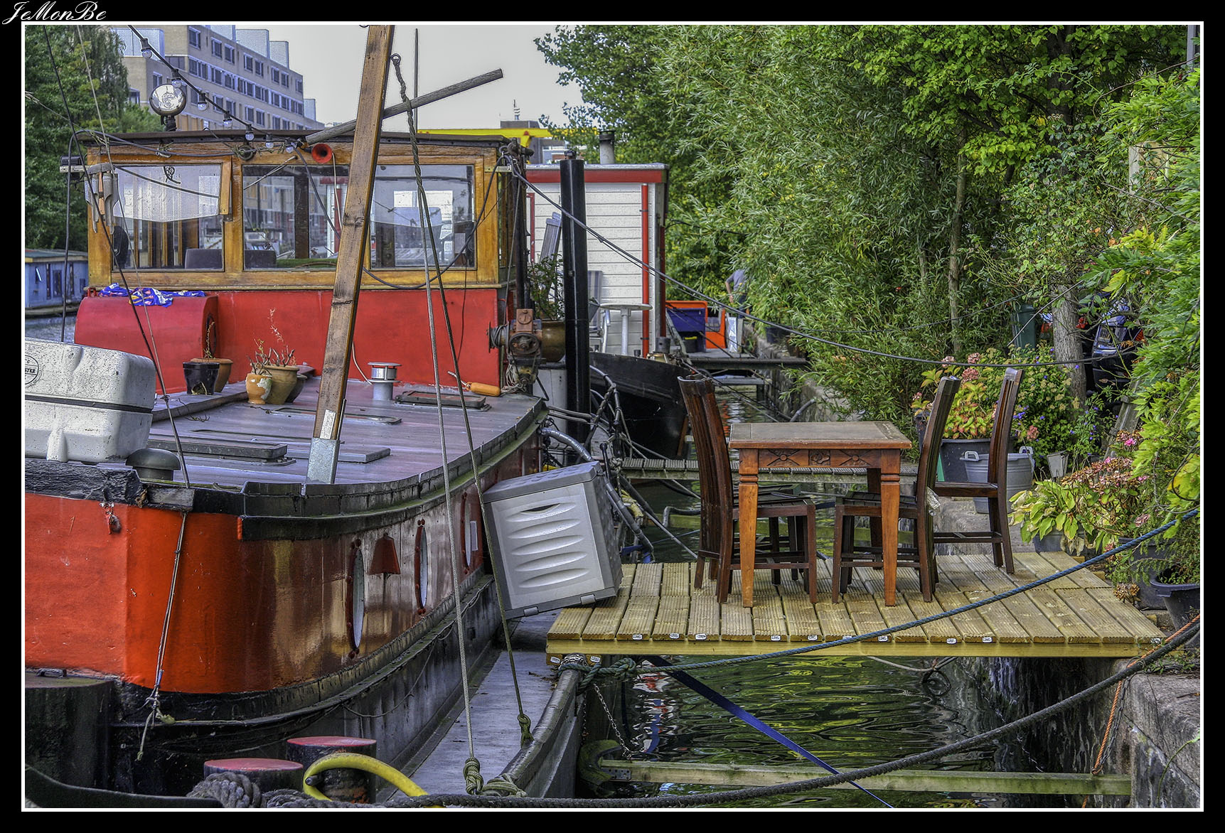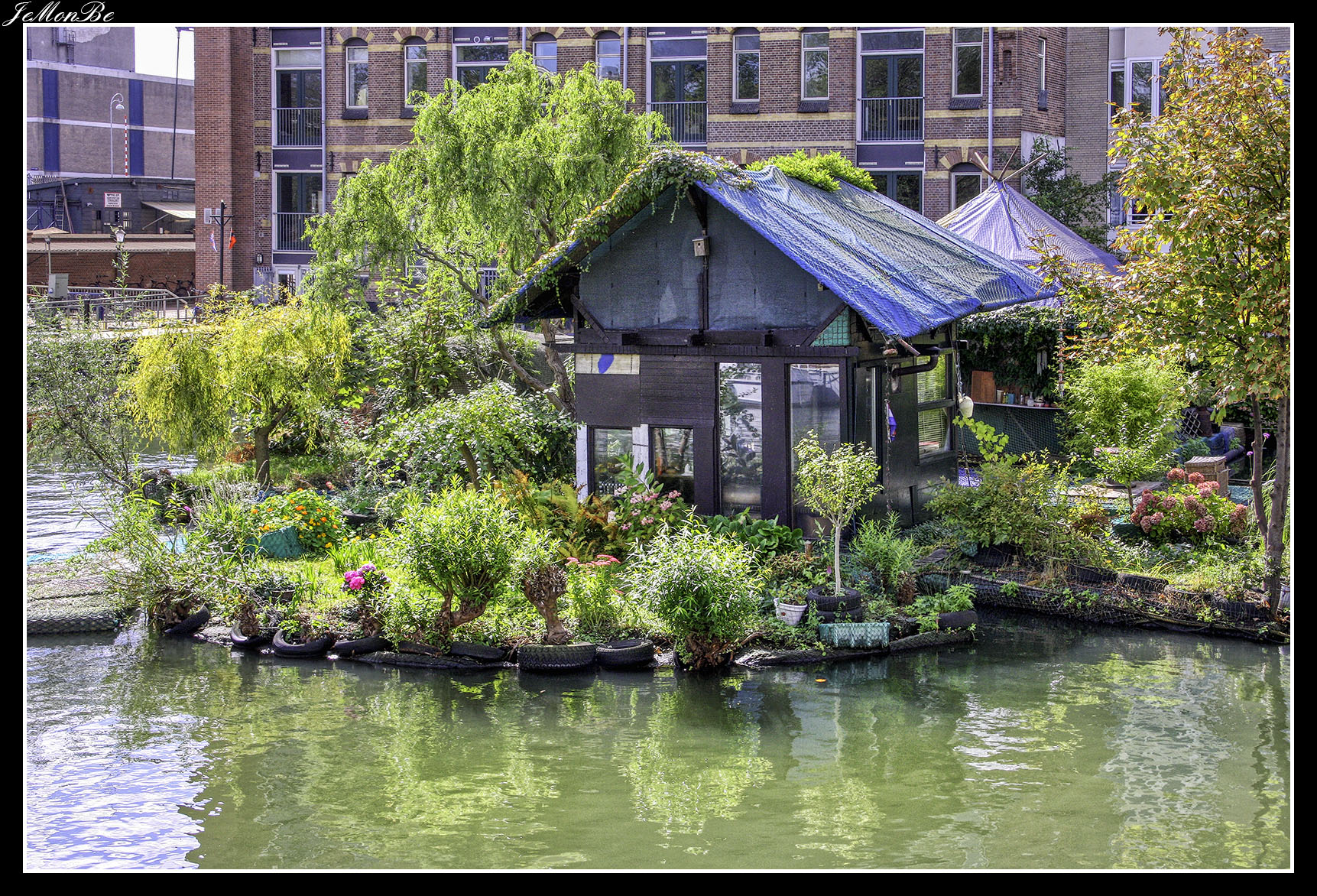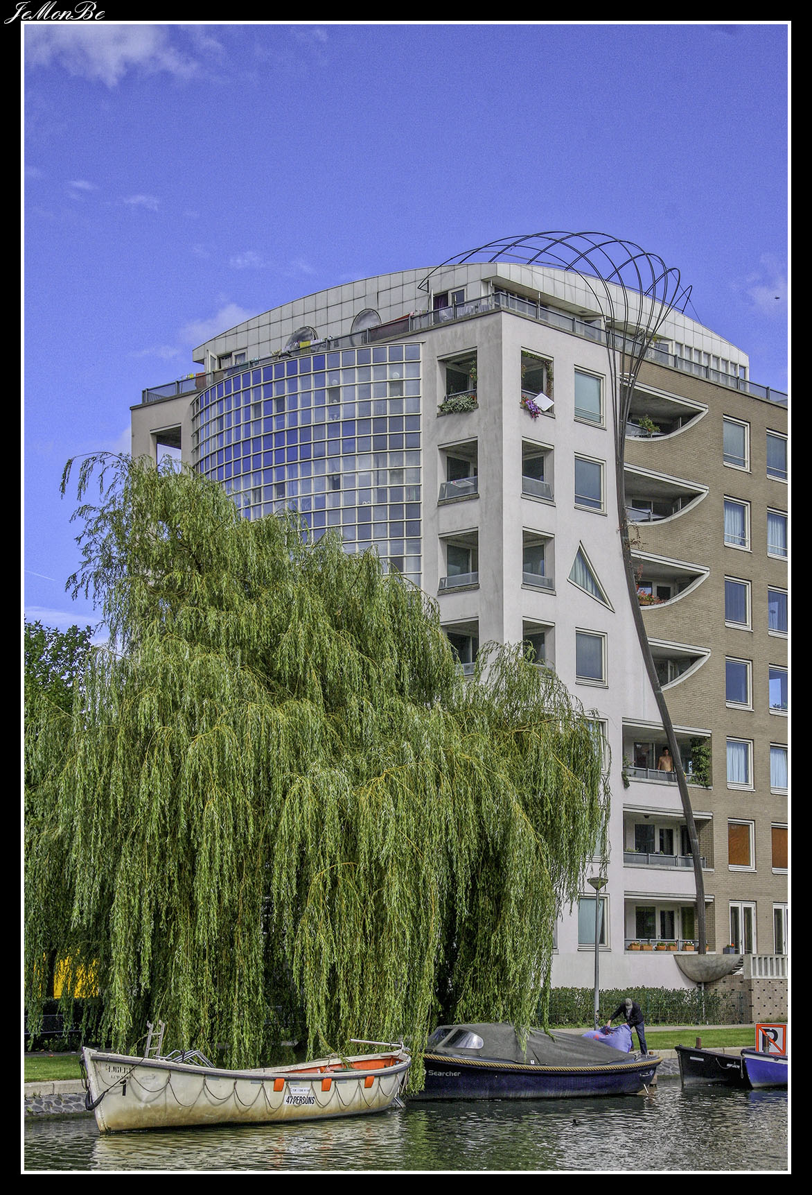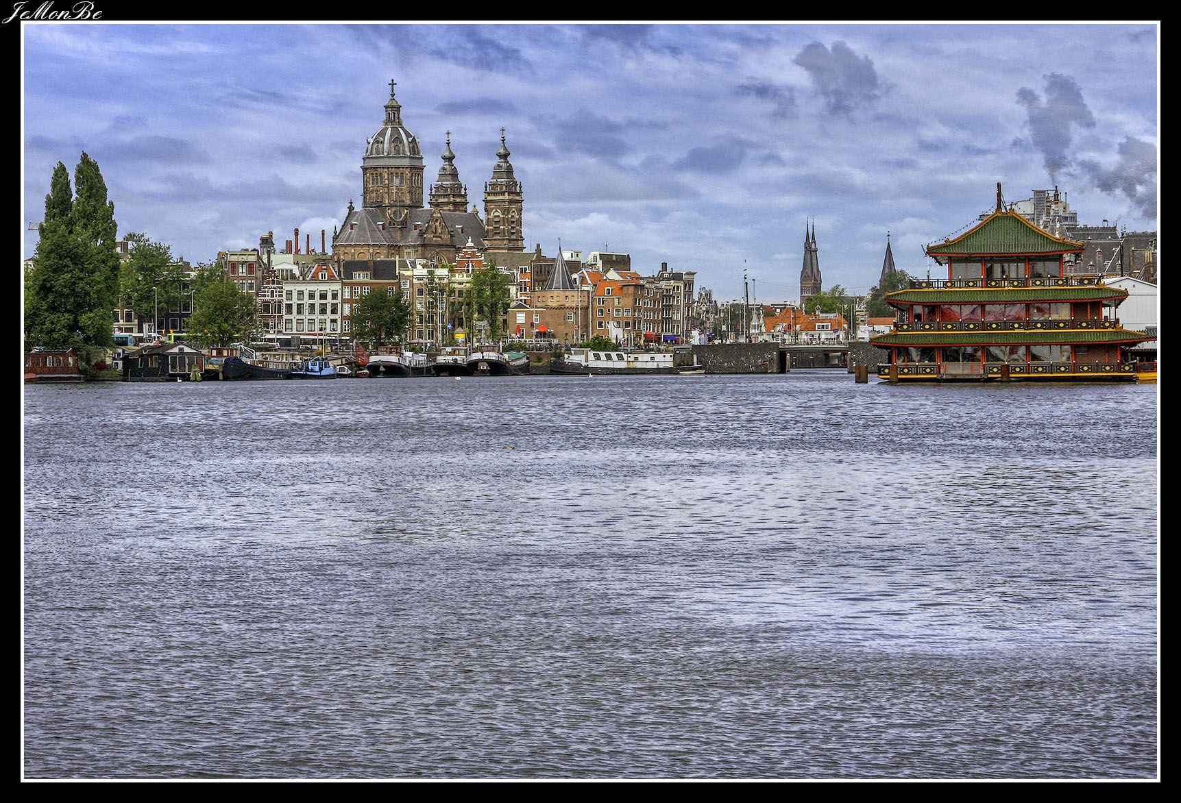 El edificio de estilo pagoda flotante es el Sea Palace Restaurant, conocido por ser el primer restaurante chino flotante de Europa. Se encuentra conectado a tierra firme mediante una pasarela metálica. Detrás del restaurante se puede ver la Basílica de San Nicolás.