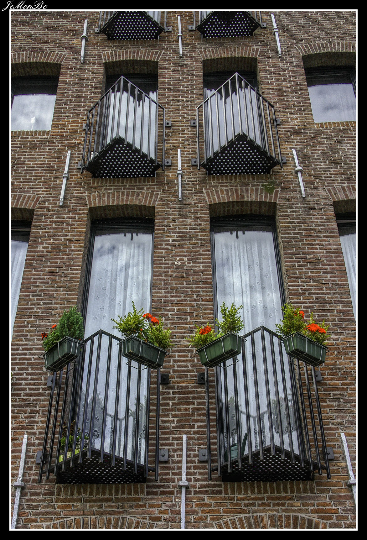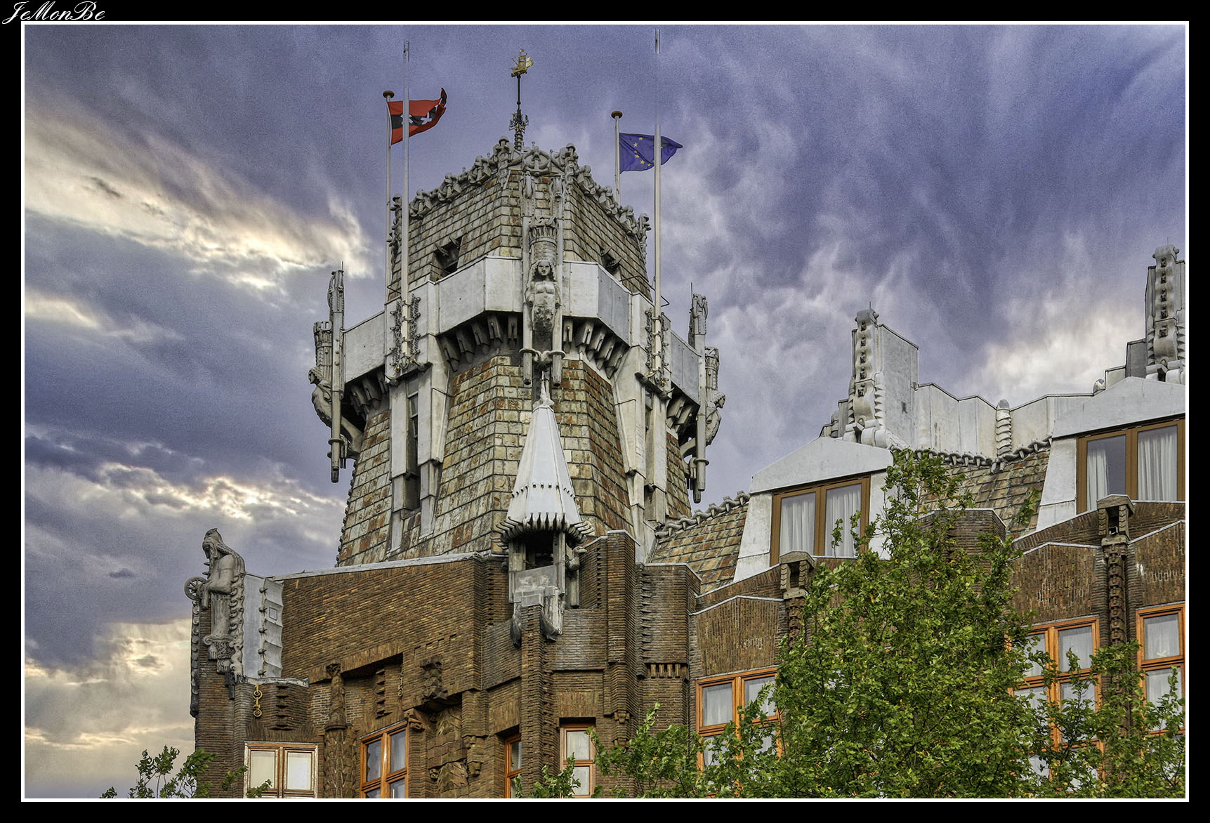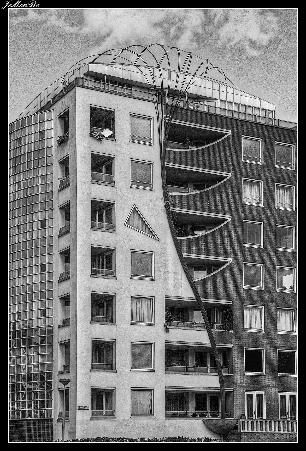 Edifico junto al puente del elefante con una arquitectura distintiva de balcones curvos y elementos triangulares blancos en su fachada. Estos edificios se caracterizan por su diseño contemporáneo que se integra con el entorno histórico de la ciudad.