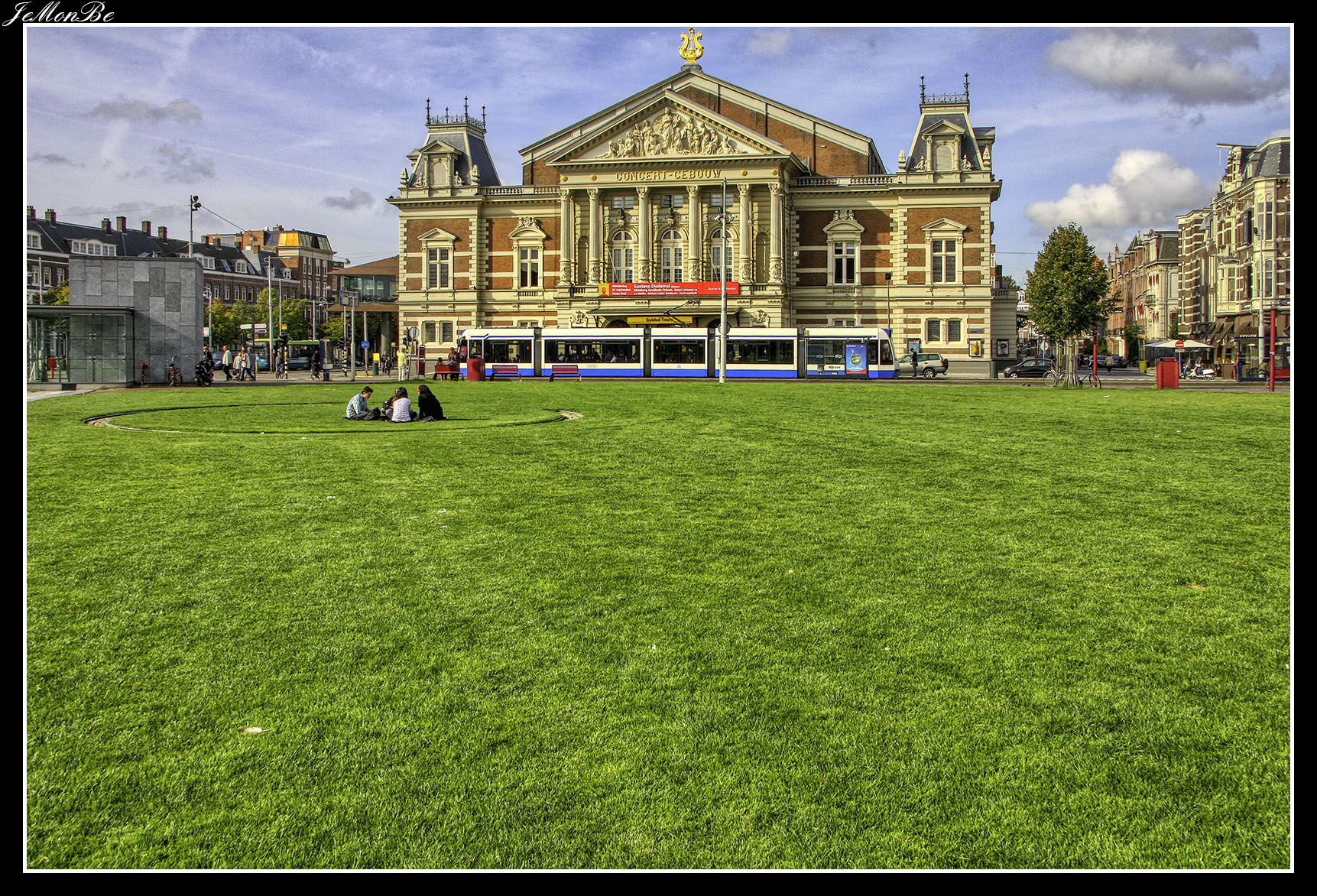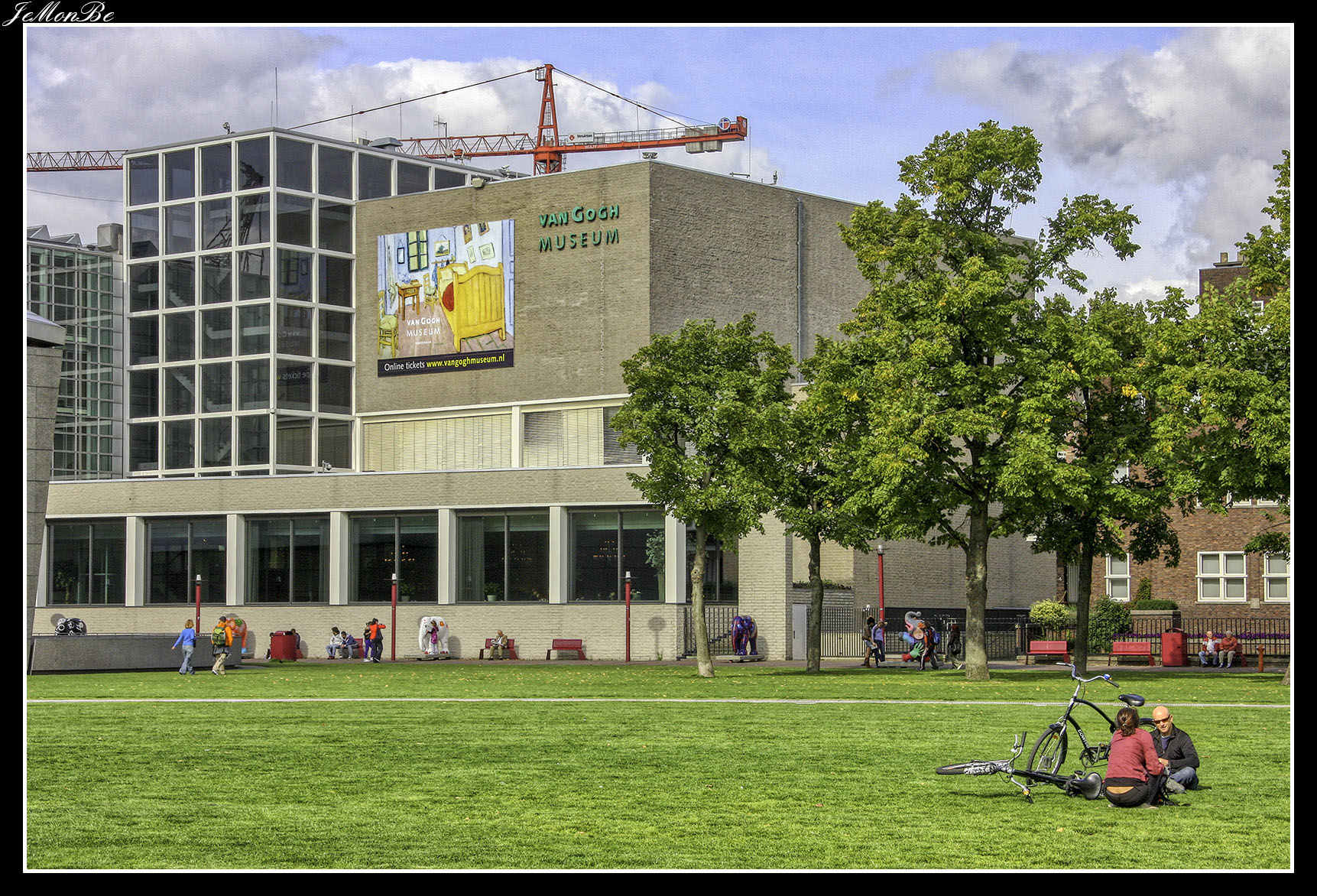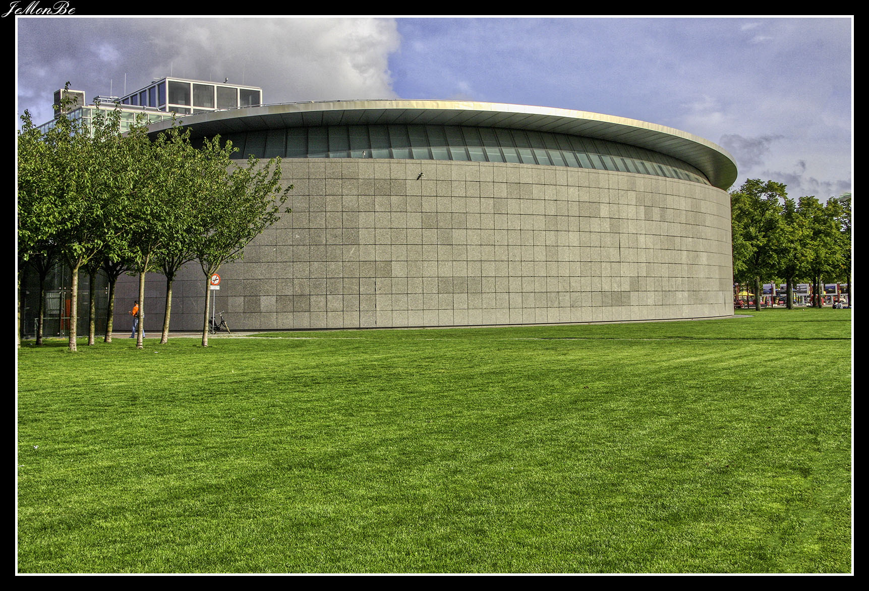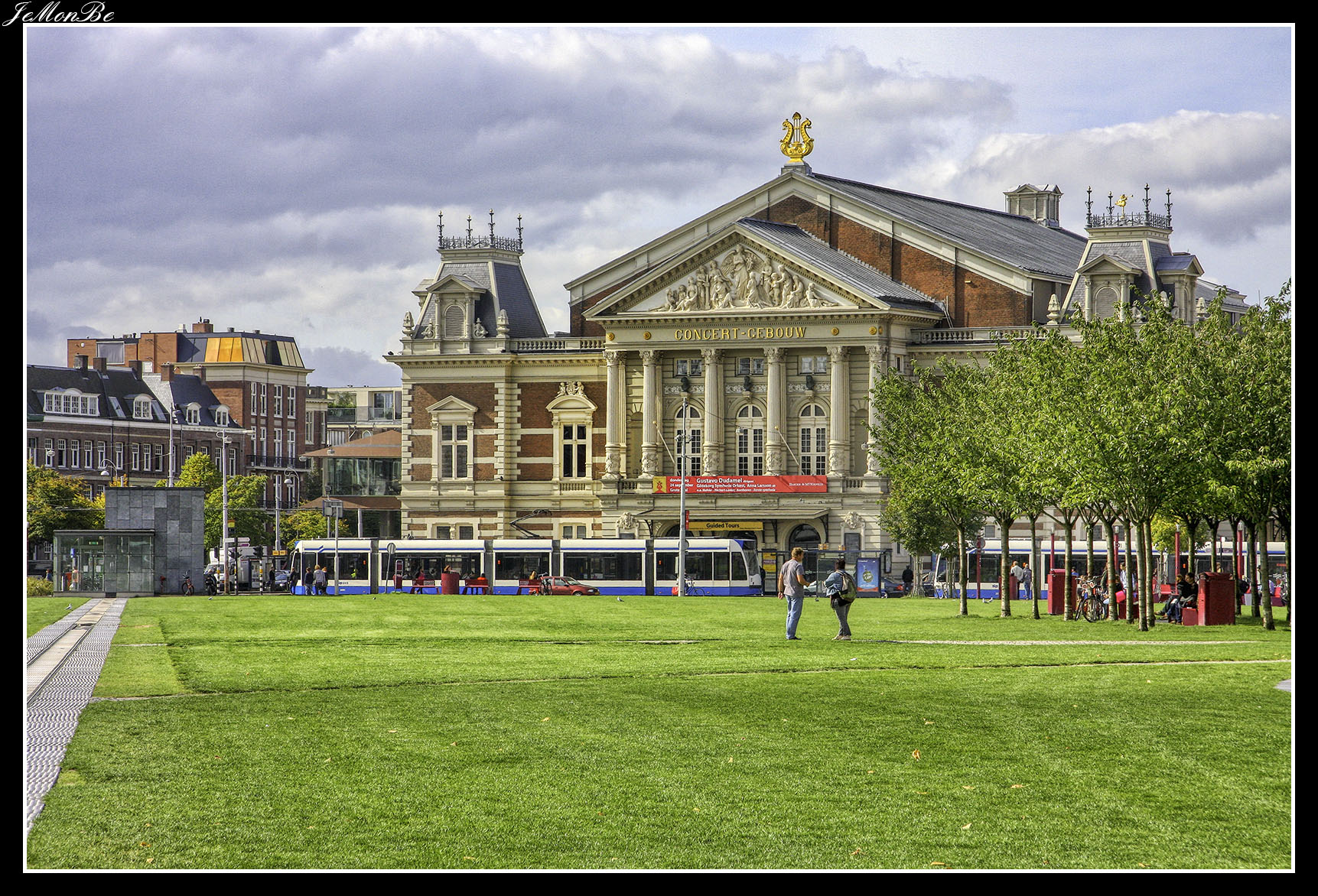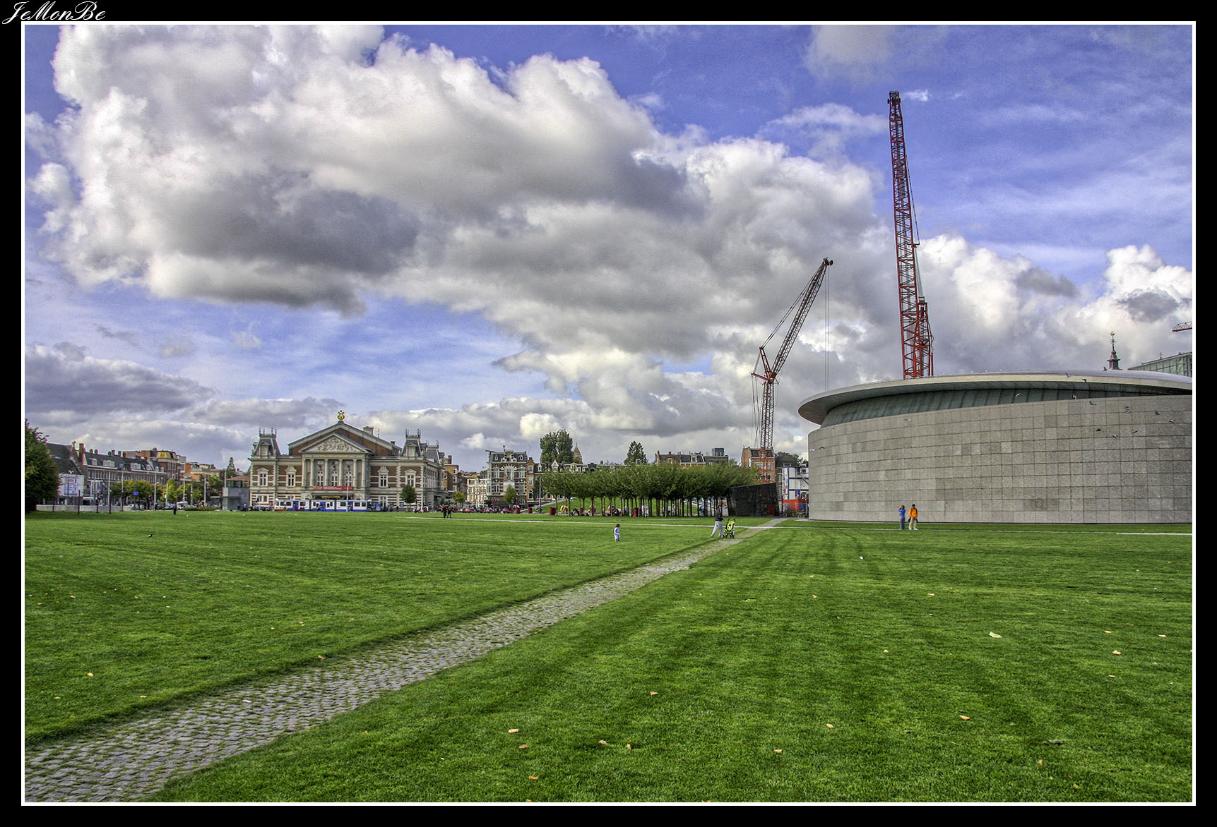 Museumplein (Plaza de los Museos), alberga varios museos. El edificio circular es el Museo Van Gogh y el edificio del fondo es el Concertgebouw (Sala de Conciertos Real).