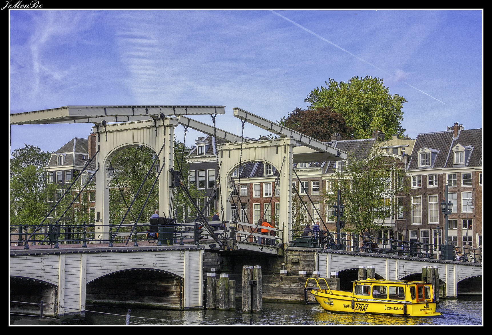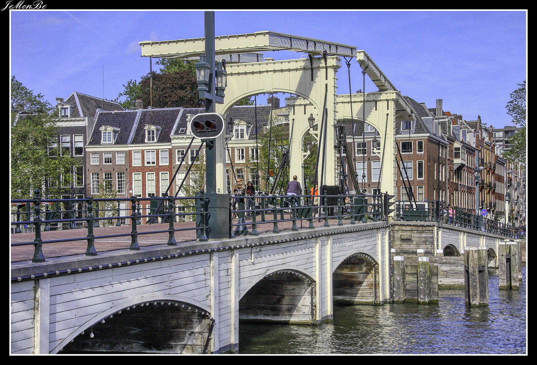 El río Amstel que dio nombre a la ciudad a su paso por Magere Brug (Puente Estrecho), un histórico puente levadizo de madera.