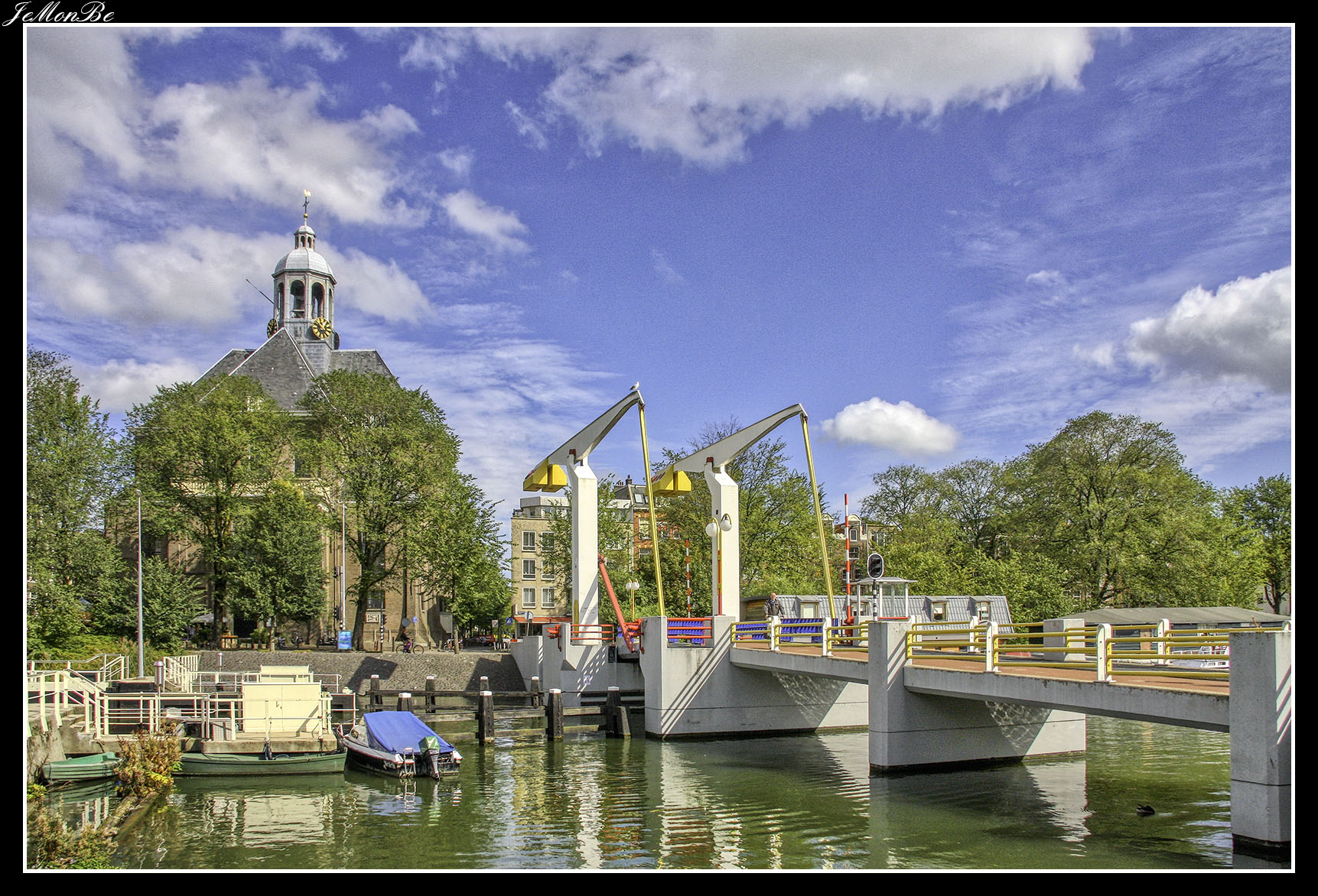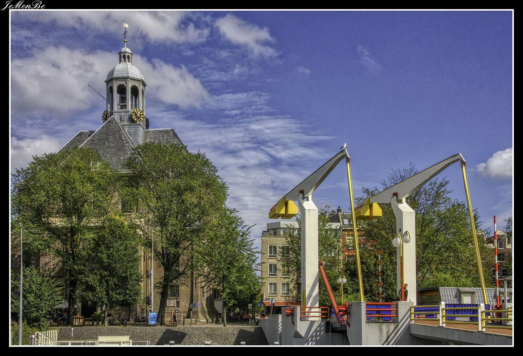 Pelikaanbrug (Puente del Pelícano) y la Oosterkerk (Iglesia del Este) al fondo. Pelikaanbrug es un moderno puente levadizo construido en 1984, que cruza el Nieuwevaart solo para peatones y ciclistas. La Oosterkerk es del siglo XVII y ya no se utiliza para servicios religiosos, toda la zona se edificó en la segunda mitad del siglo XVII sobre islas artificiales.
