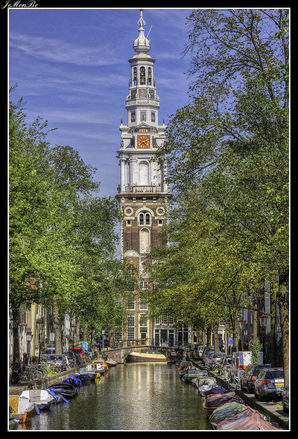 Canal de Groenburgwal, con la torre de la Zuiderkerk (Iglesia del Sur) al fondo. La Zuiderkerk fue la primera iglesia protestante de Ámsterdam, construida entre 1603 y 1611, dejó de utilizarse para servicios religiosos en 1929. La torre del campanario, que se eleva 80 metros, se puede subir para disfrutar de vistas panorámicas de la ciudad.