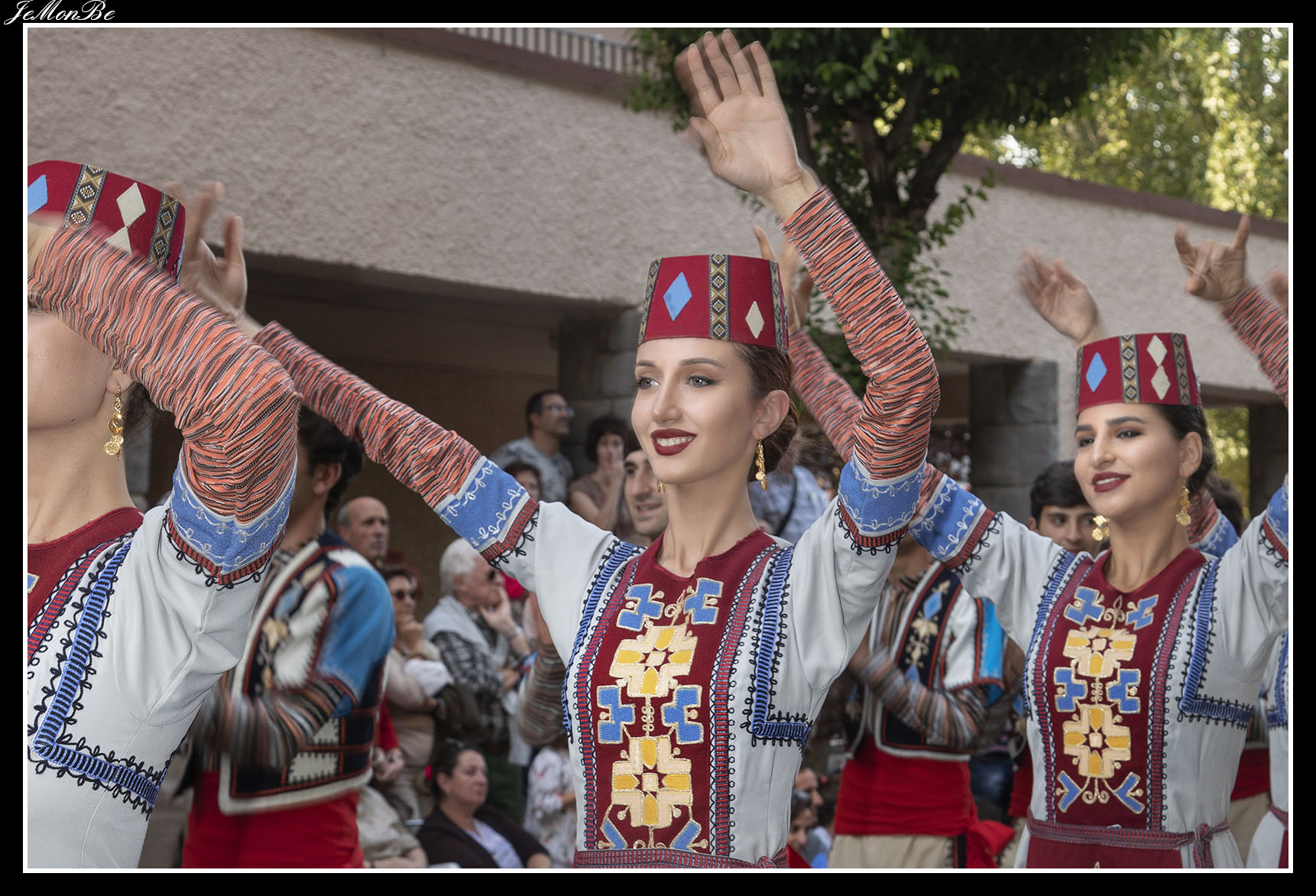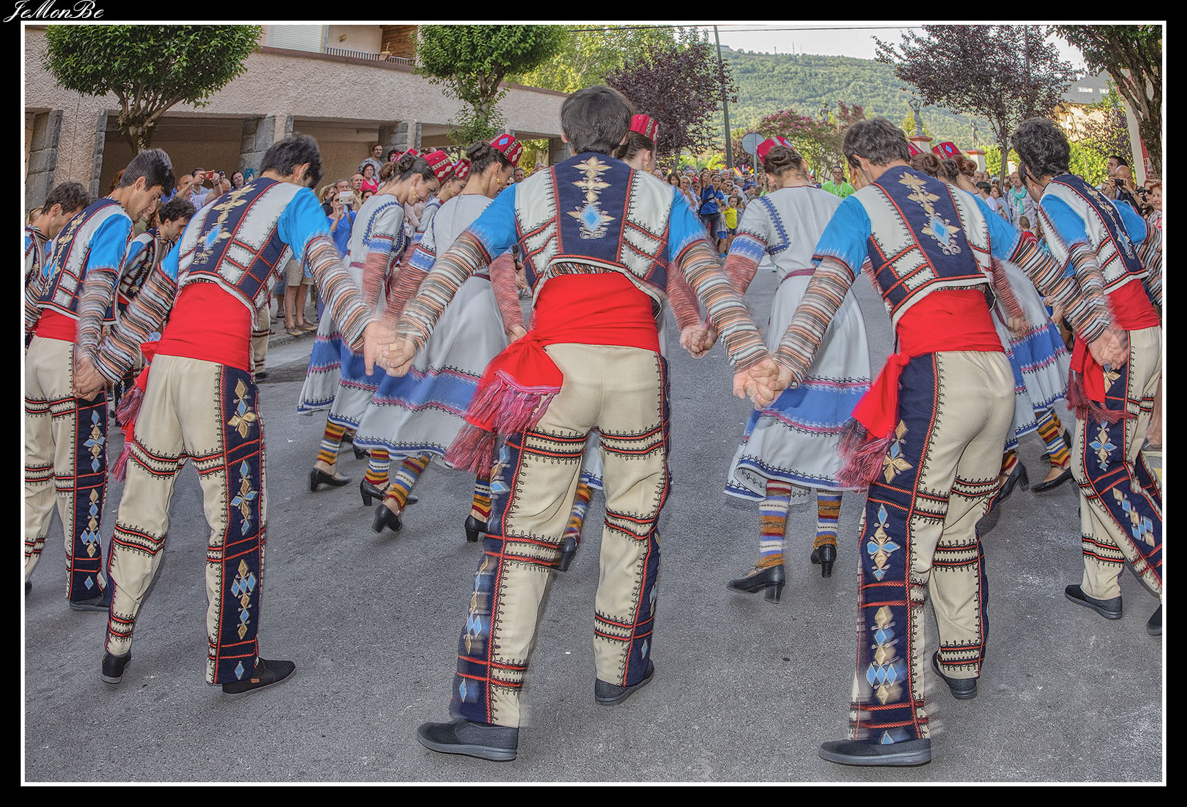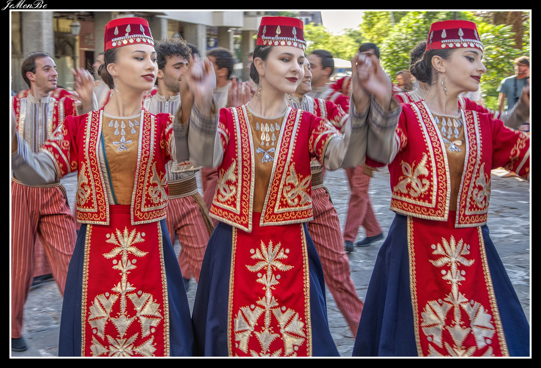 Las danzas de los bailarines son fogosas, impetuosas, rápidas, acrobáticas y viriles, se realizan saltos, quebradas en las rodillas, ruedas o pirámides. Los movimientos de las piernas los hacen gracias a resbalones, a puntas ejecutadas con los dedos de los pies en botas de cobre flexible, que recuerdan a los pasos de los caballos; mientras que los movimientos de los brazos evocan el vuelo del águila.