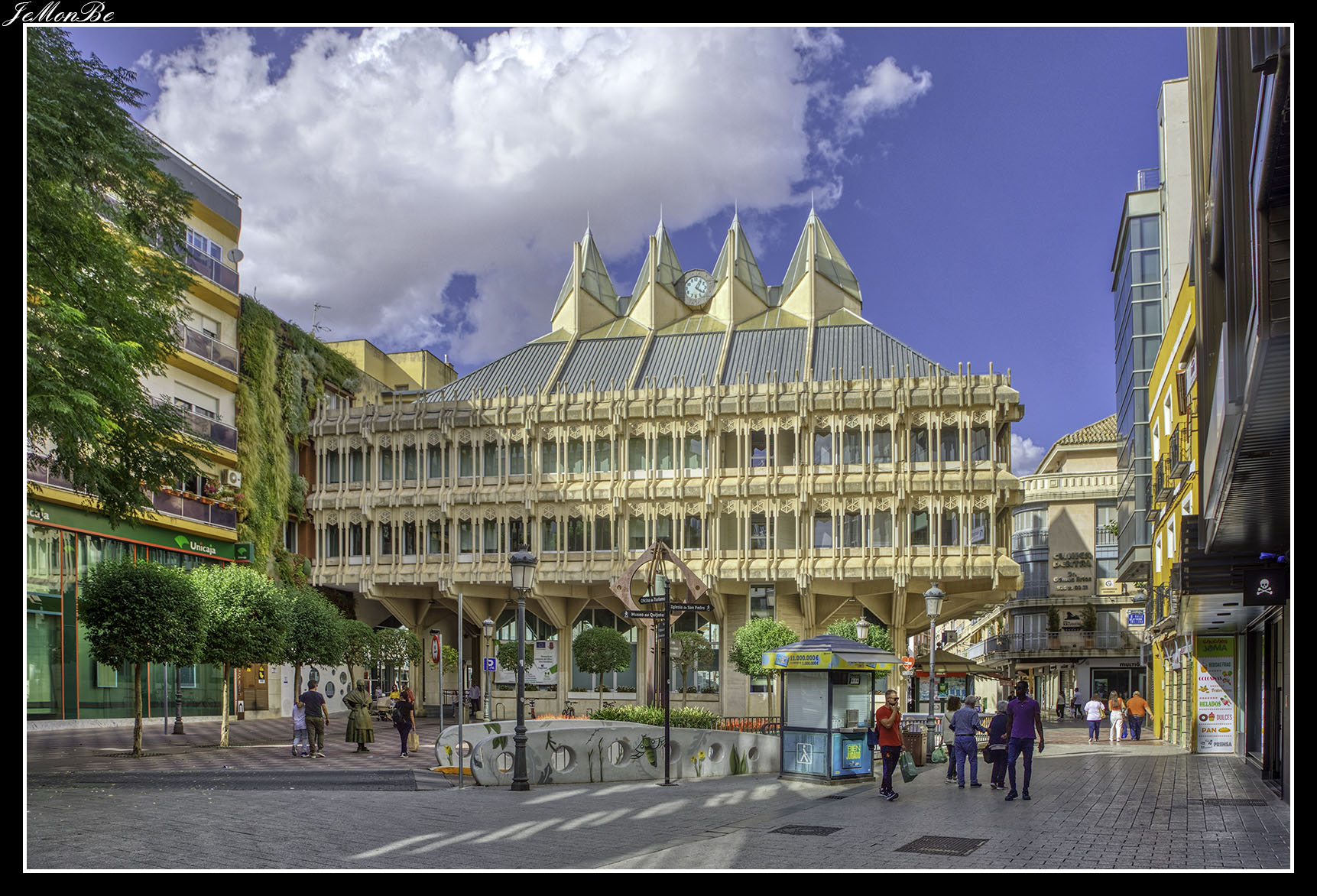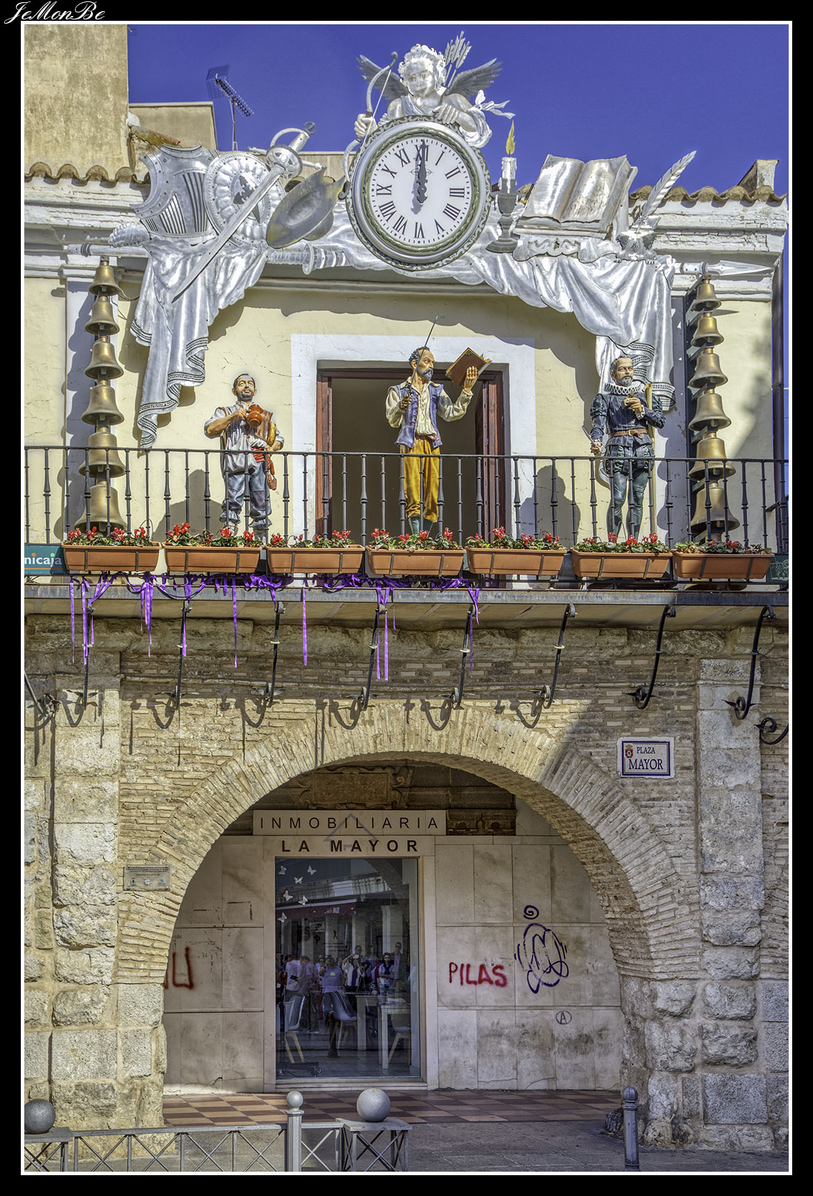 El centro neurálgico está en la Plaza Mayor, en un extremo podemos ver una fuente de varios niveles presidida por Alfonso X el Sabio fundador de la ciudad y la Casa del Arco, primera casa consistorial que en la actualidad alberga un reloj carillón en el que las figuras autómatas de Miguel de Cervantes, Sancho Panza y don Quijote salen al exterior a ciertas horas del día.