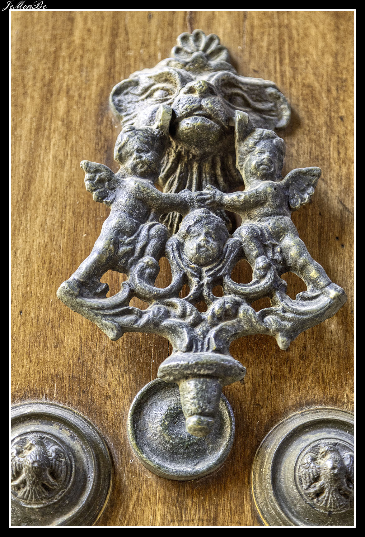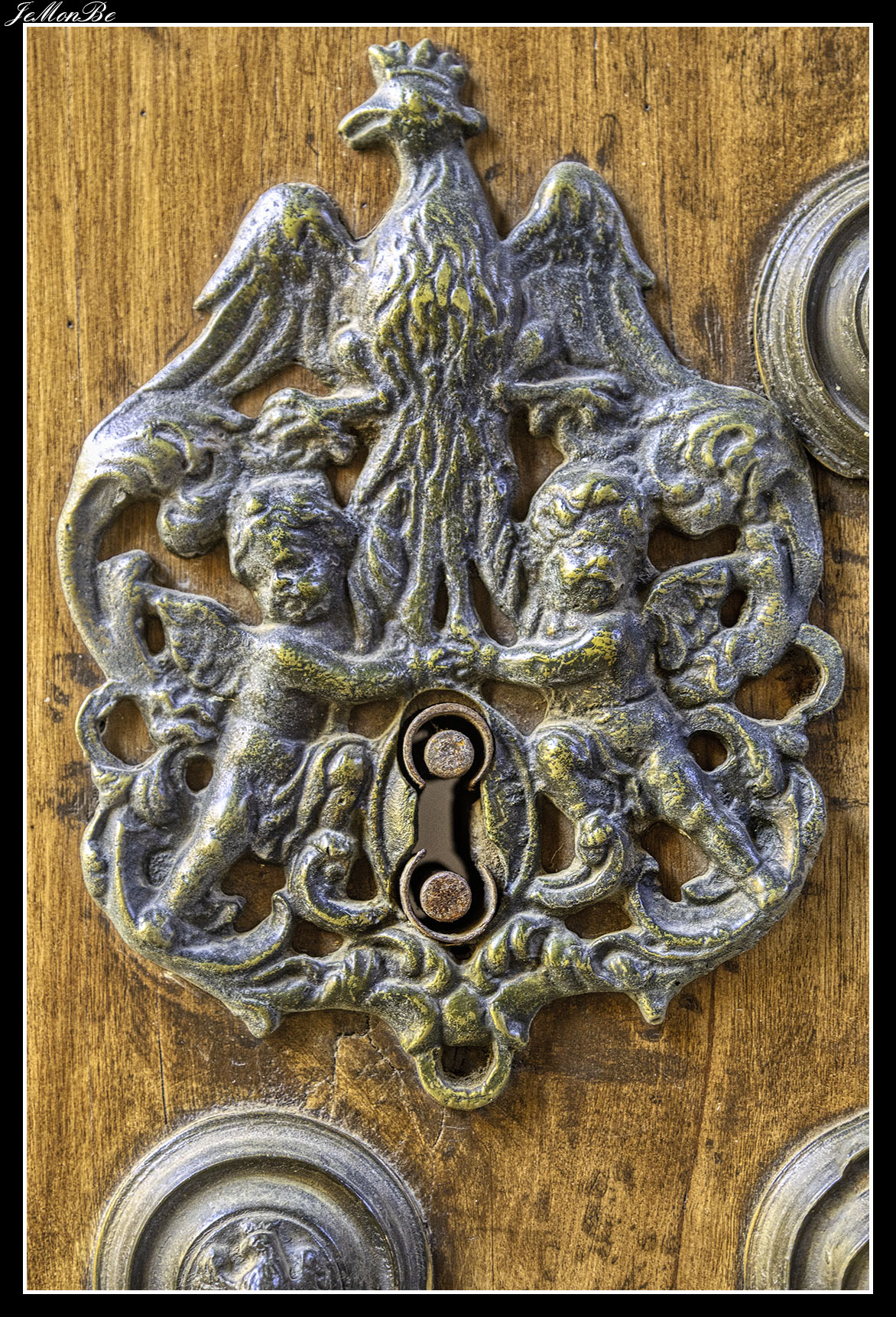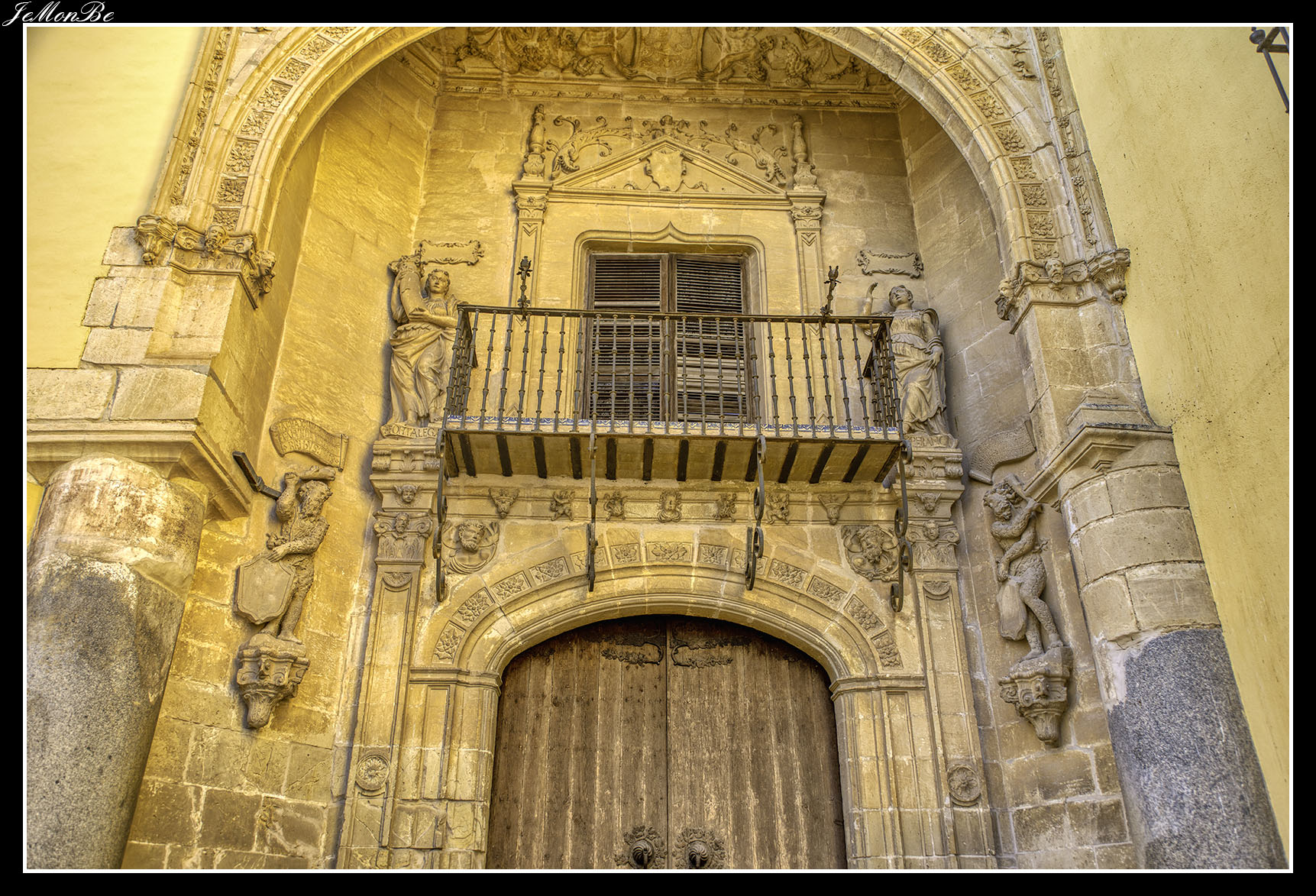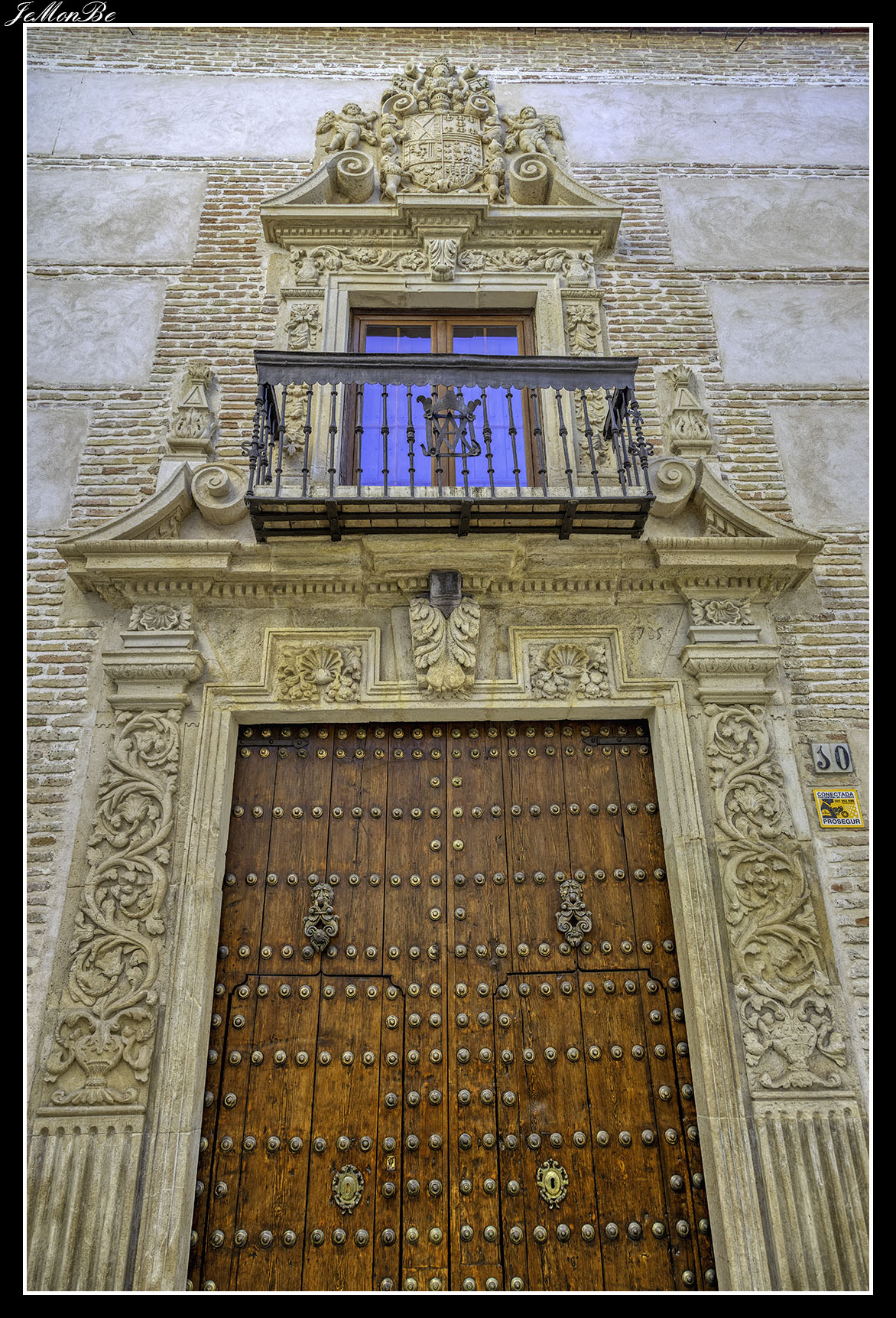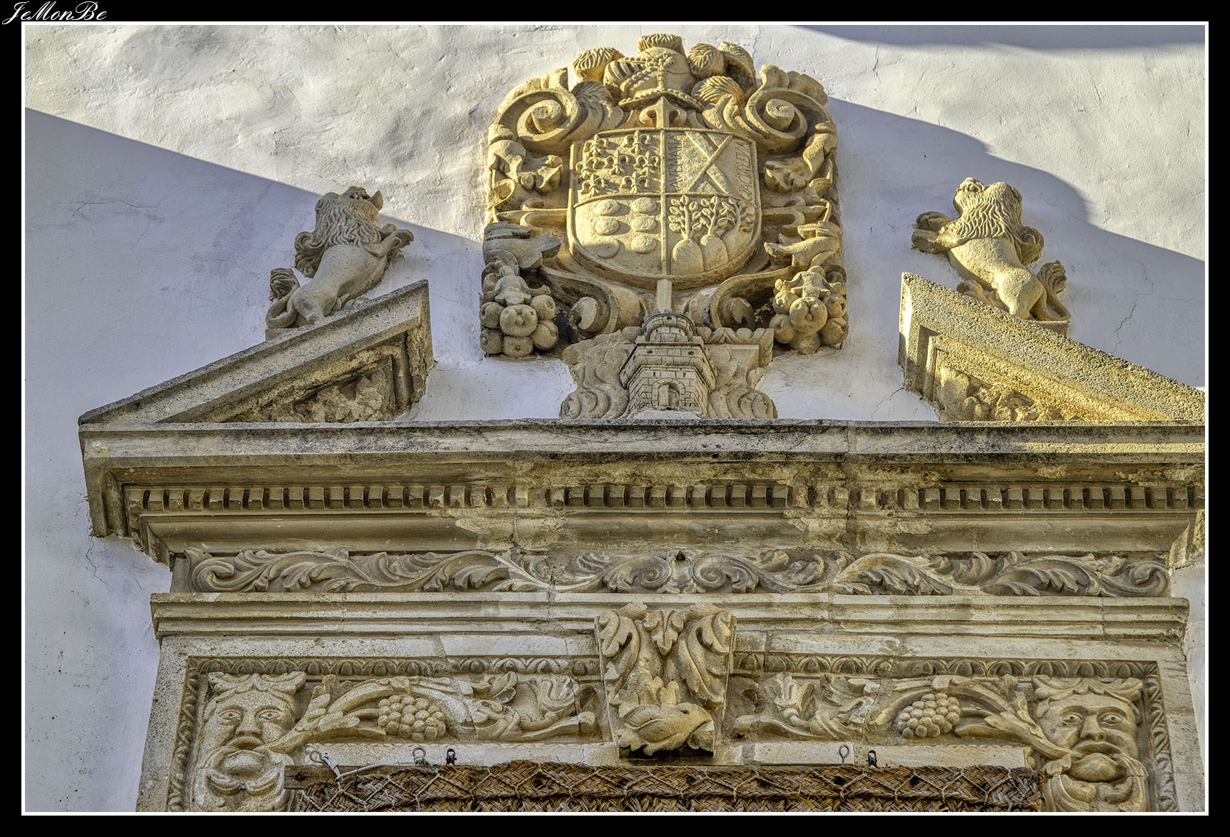 Estos a su vez enmarcan una impresionante portada barroca labrada en piedra flanqueada por columnas dóricas y coronada por el escudo de la casa.