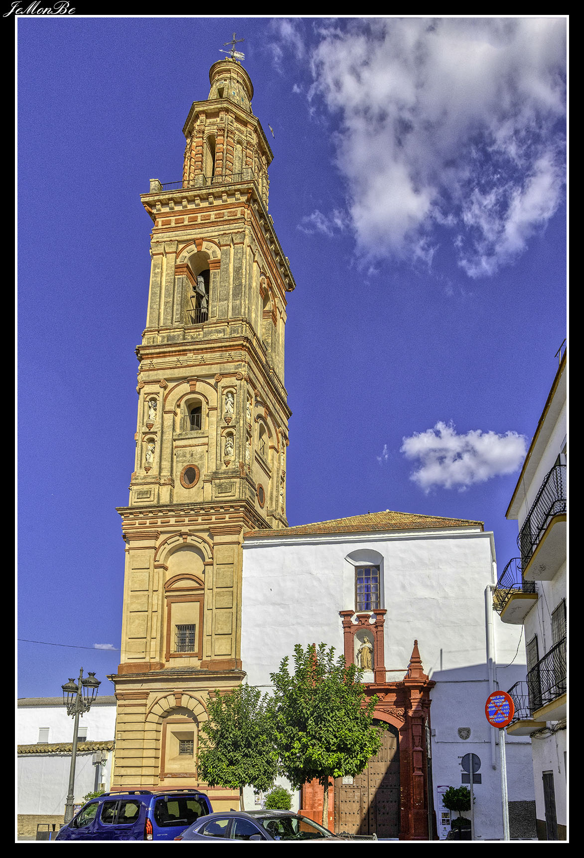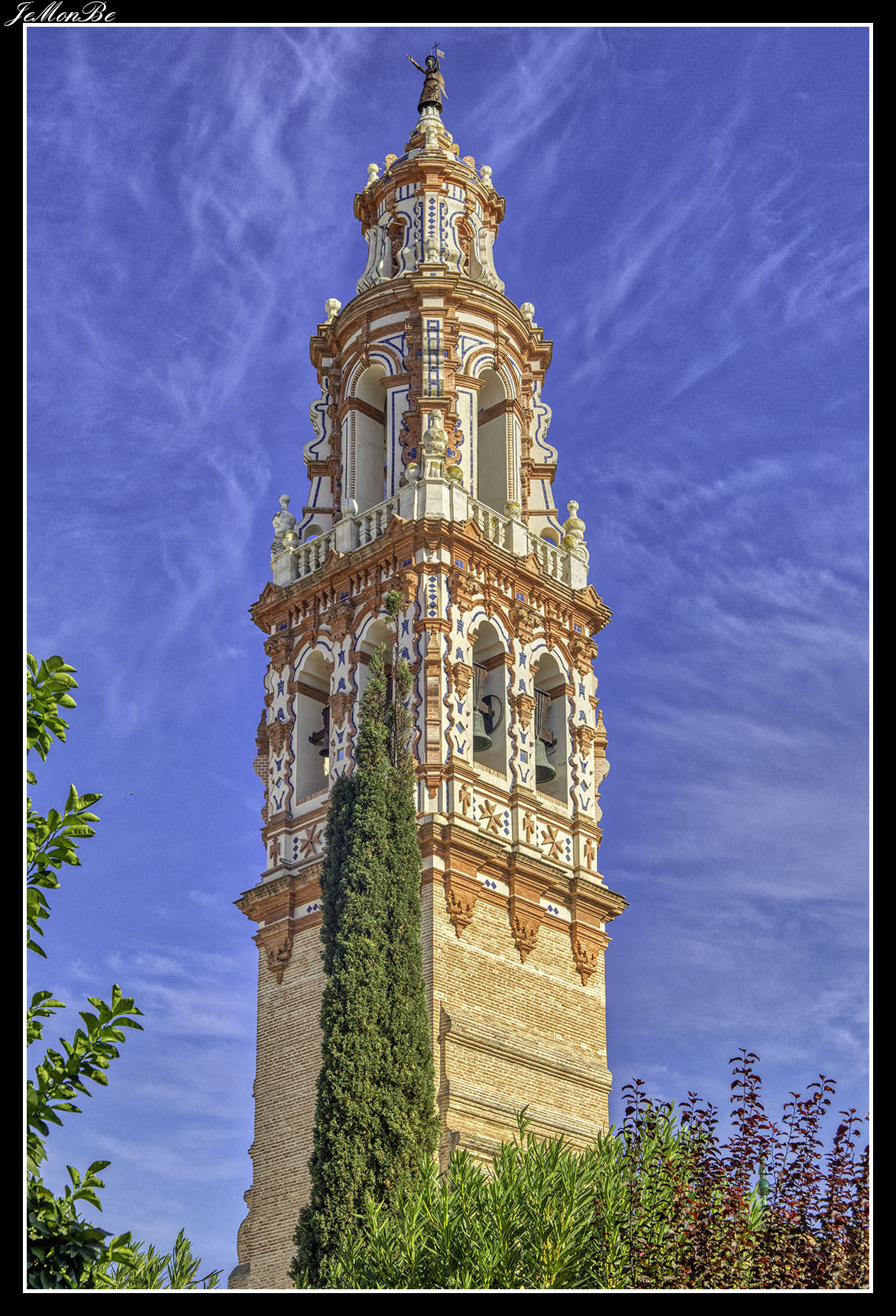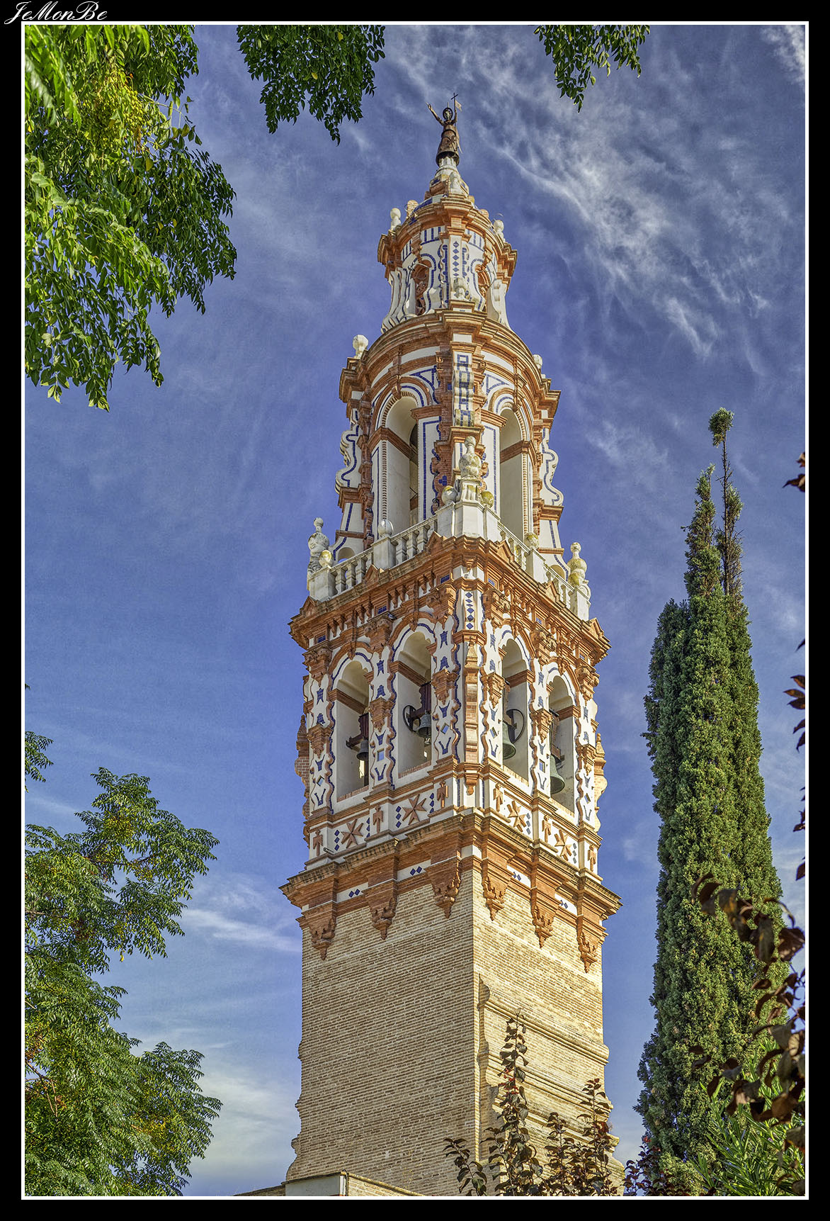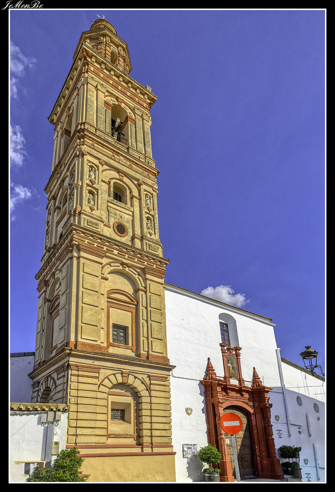 La torre adosada a la gran portada, cuyo diseño recuerda a la Giralda de Sevilla, posee un esbelto cuerpo de ladrillos con vanos decorados. El cuerpo de campanas es de ordenación clásica. Se observa una profusa ornamentación de azulejería del siglo XVIII. Entre las campanas figura una del siglo XV, que tiene el interés de reproducir el Pendón de Écija.