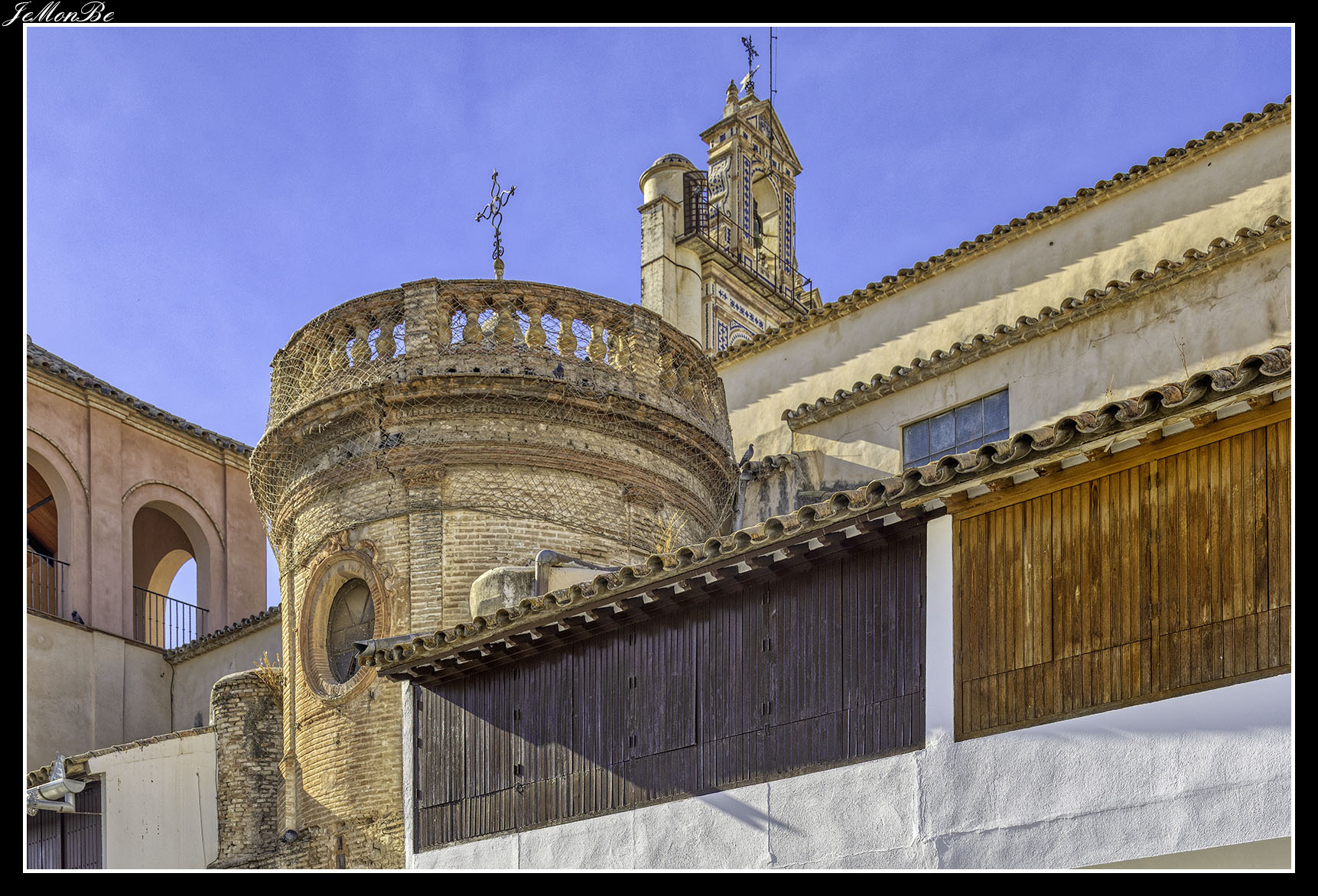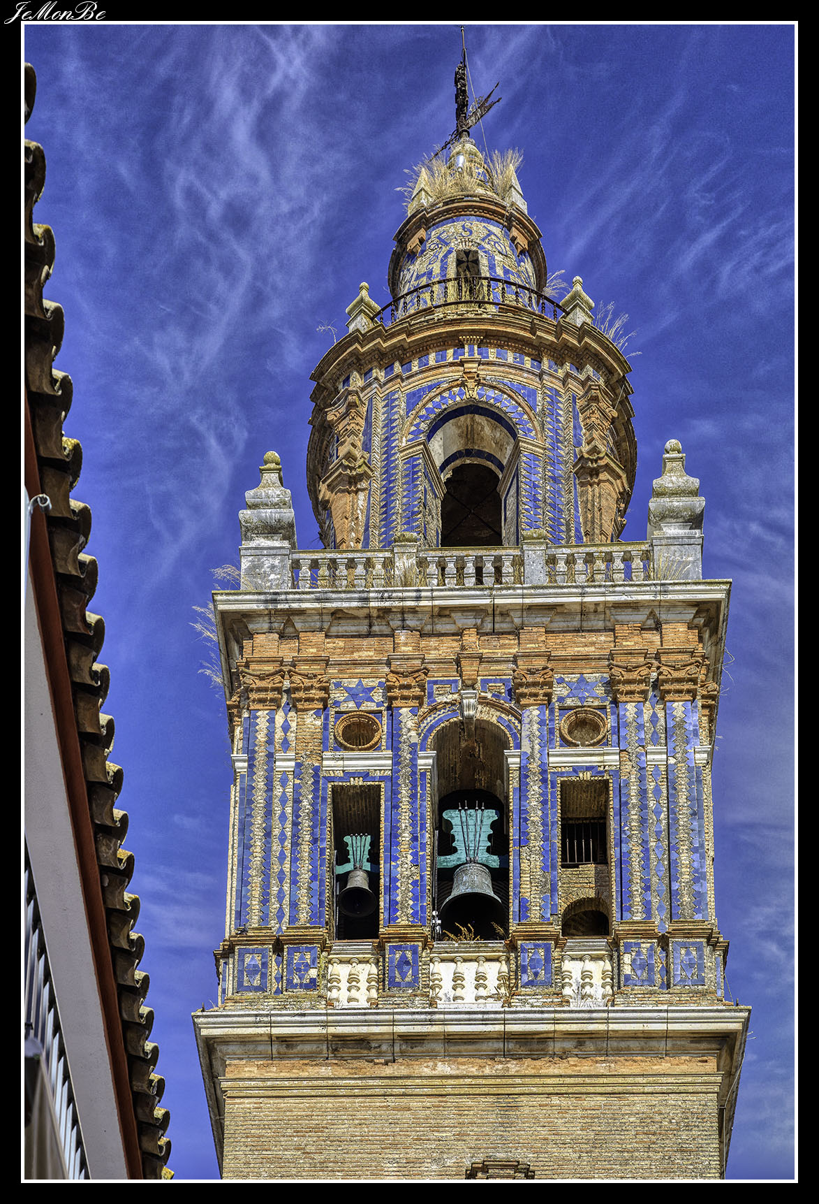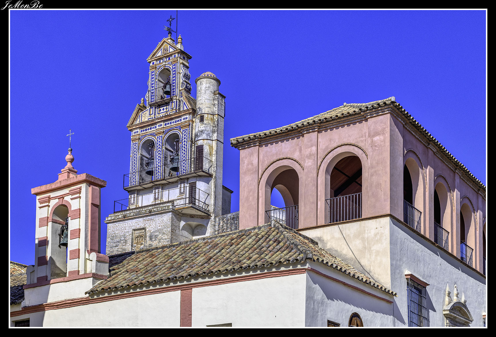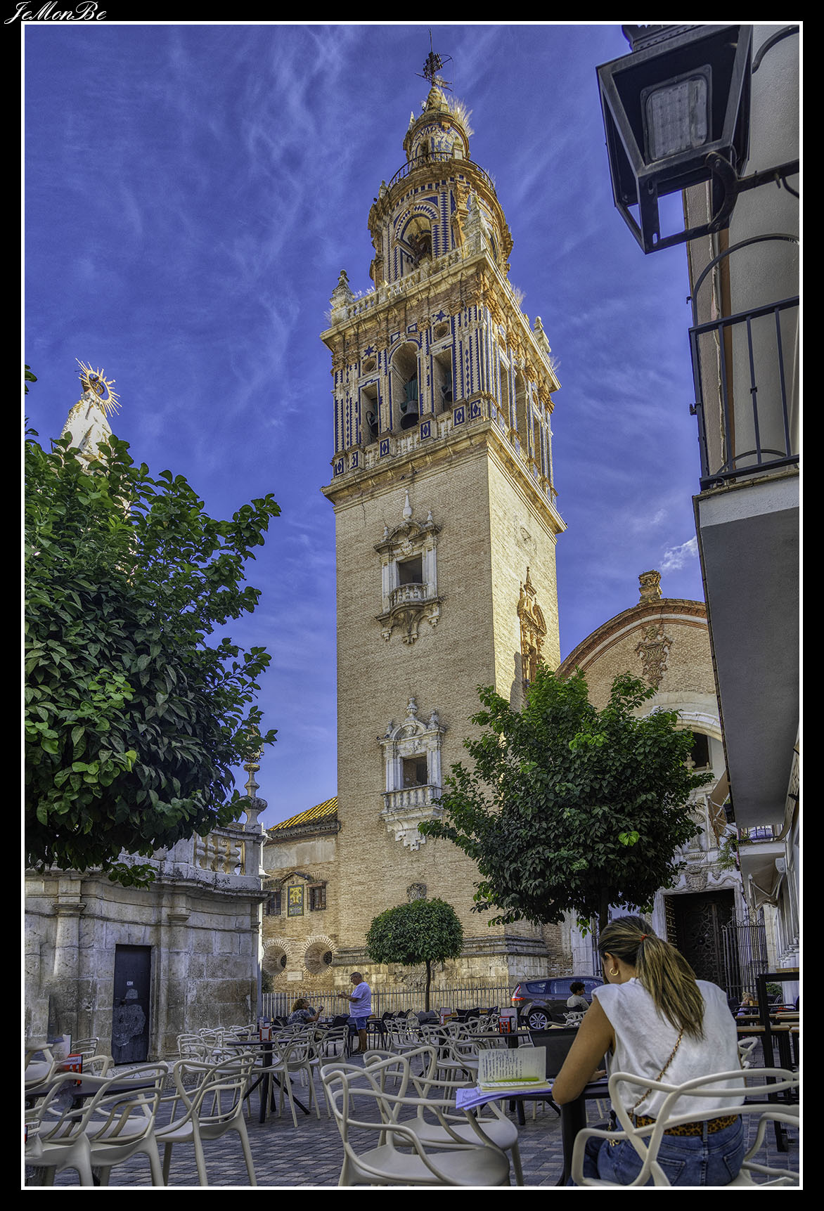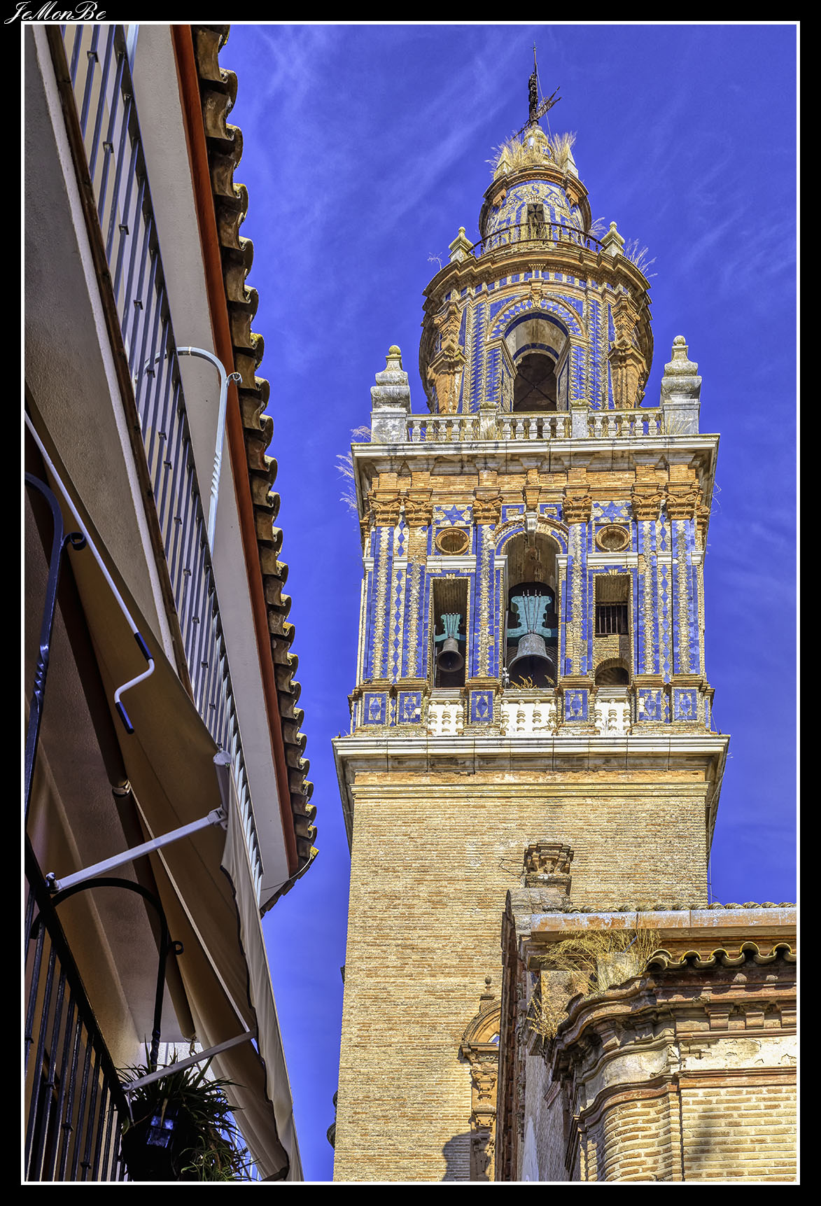 La torre adosada a la gran portada, cuyo diseño recuerda a la Giralda de Sevilla, posee un esbelto cuerpo de ladrillos con vanos decorados. El cuerpo de campanas es de ordenación clásica. Se observa una profusa ornamentación de azulejería del siglo XVIII. Entre las campanas figura una del siglo XV, que tiene el interés de reproducir el Pendón de Écija.