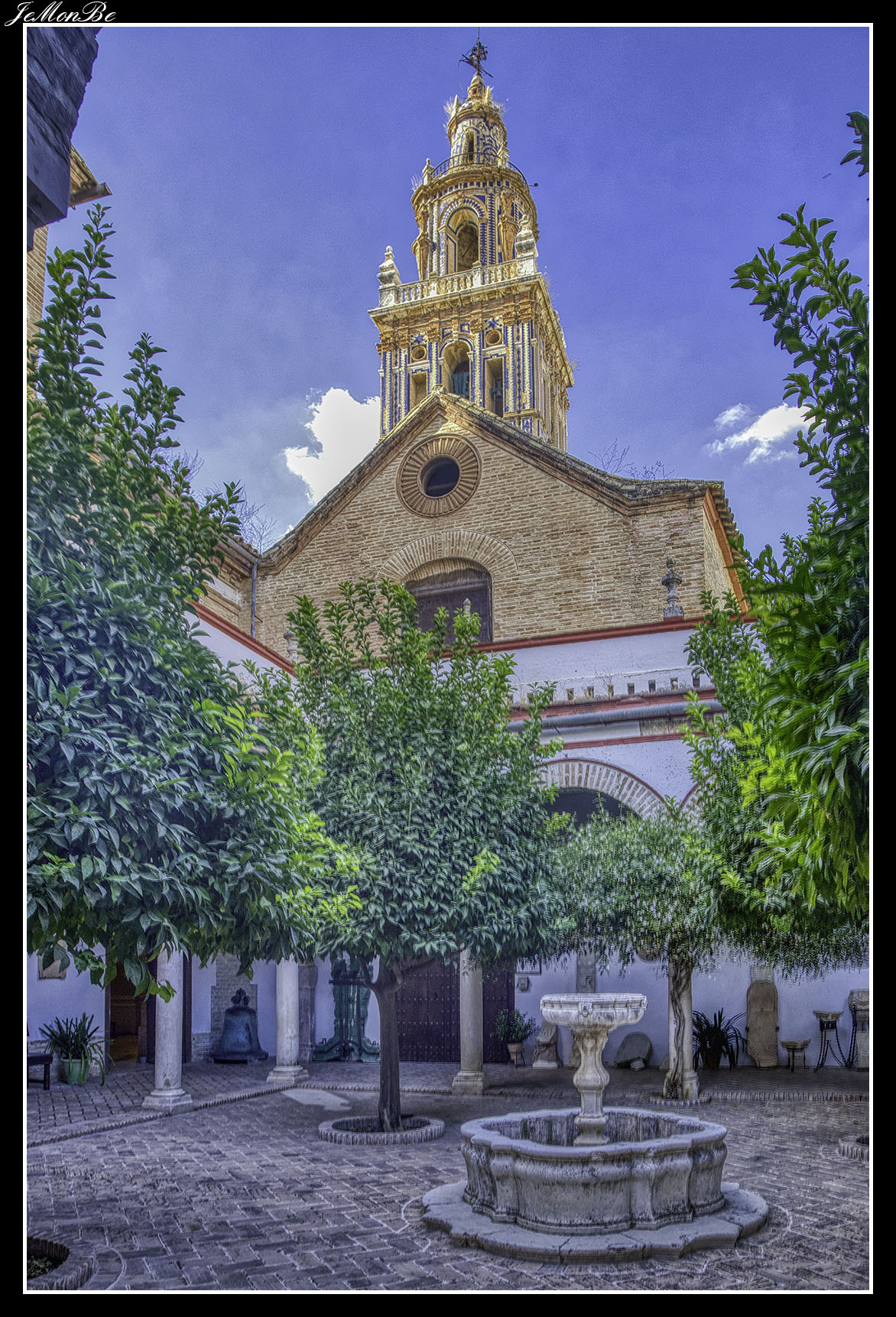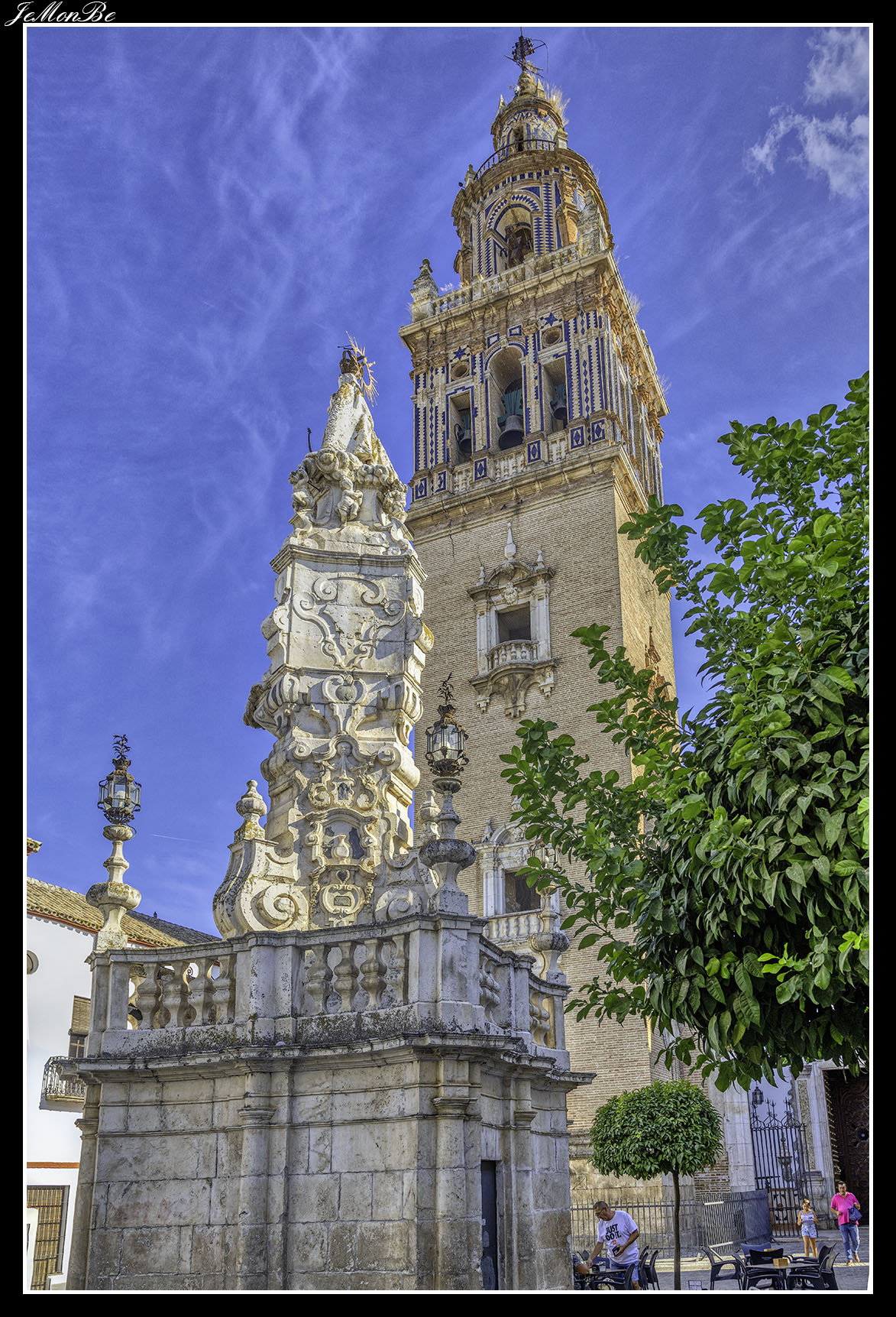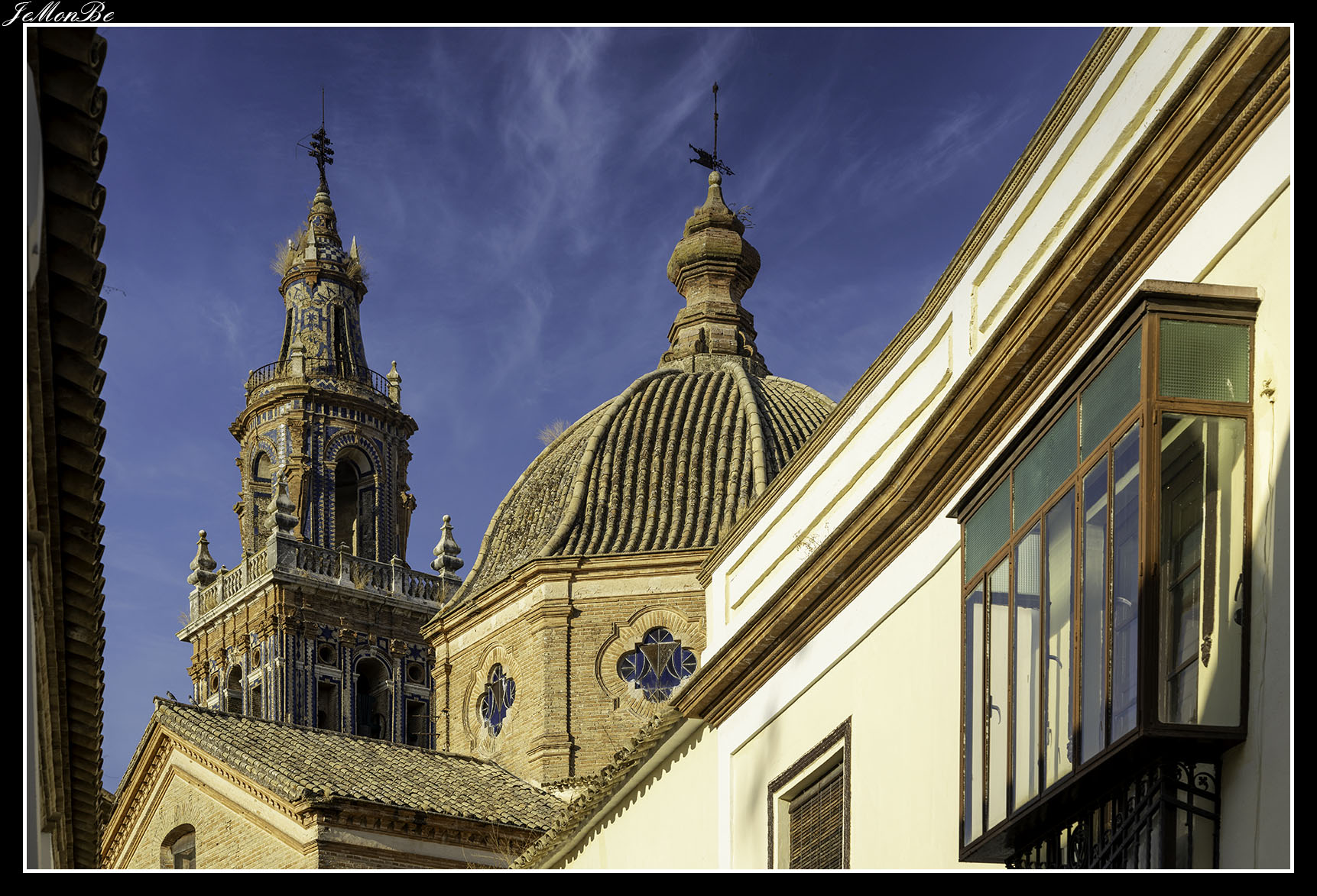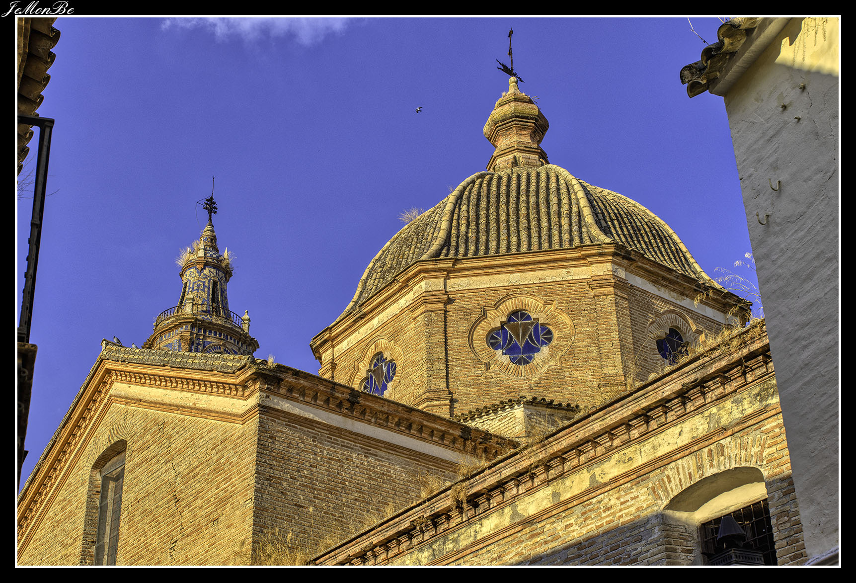 La torre adosada a la gran portada, cuyo diseño recuerda a la Giralda de Sevilla, posee un esbelto cuerpo de ladrillos con vanos decorados. El cuerpo de campanas es de ordenación clásica. Se observa una profusa ornamentación de azulejería del siglo XVIII. Entre las campanas figura una del siglo XV, que tiene el interés de reproducir el Pendón de Écija.
