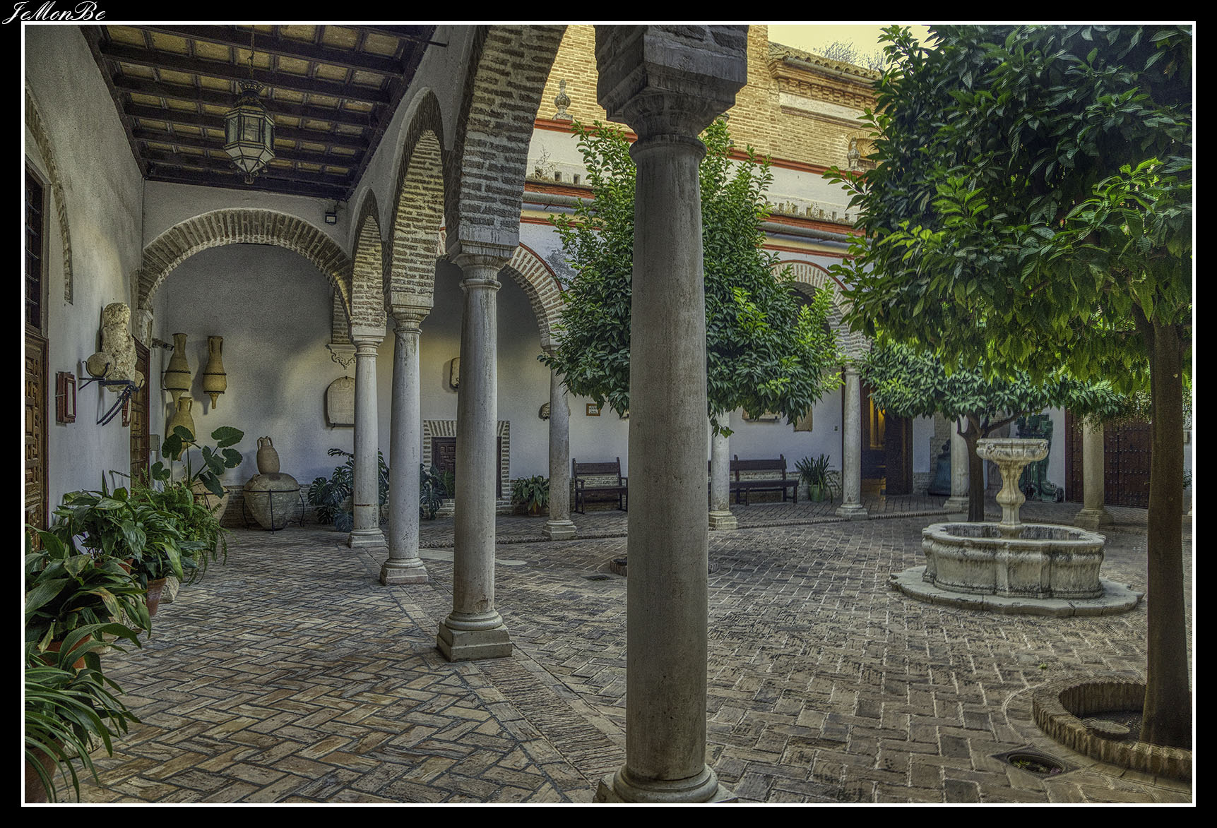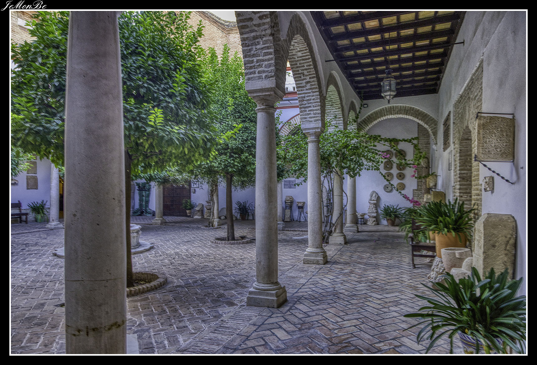 El palacio tiene varios patios. Destaca el principal, de doble arquería sostenida por columnas mármol y rematadas por capiteles, y paramentos de la galería decorados por zócalos con rica policromía.