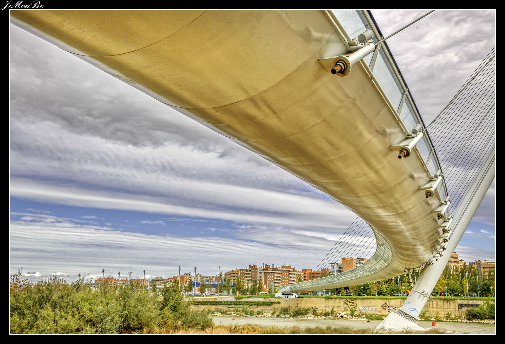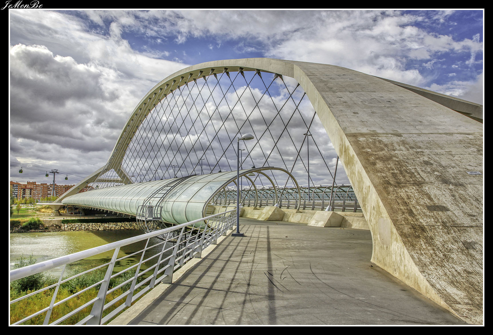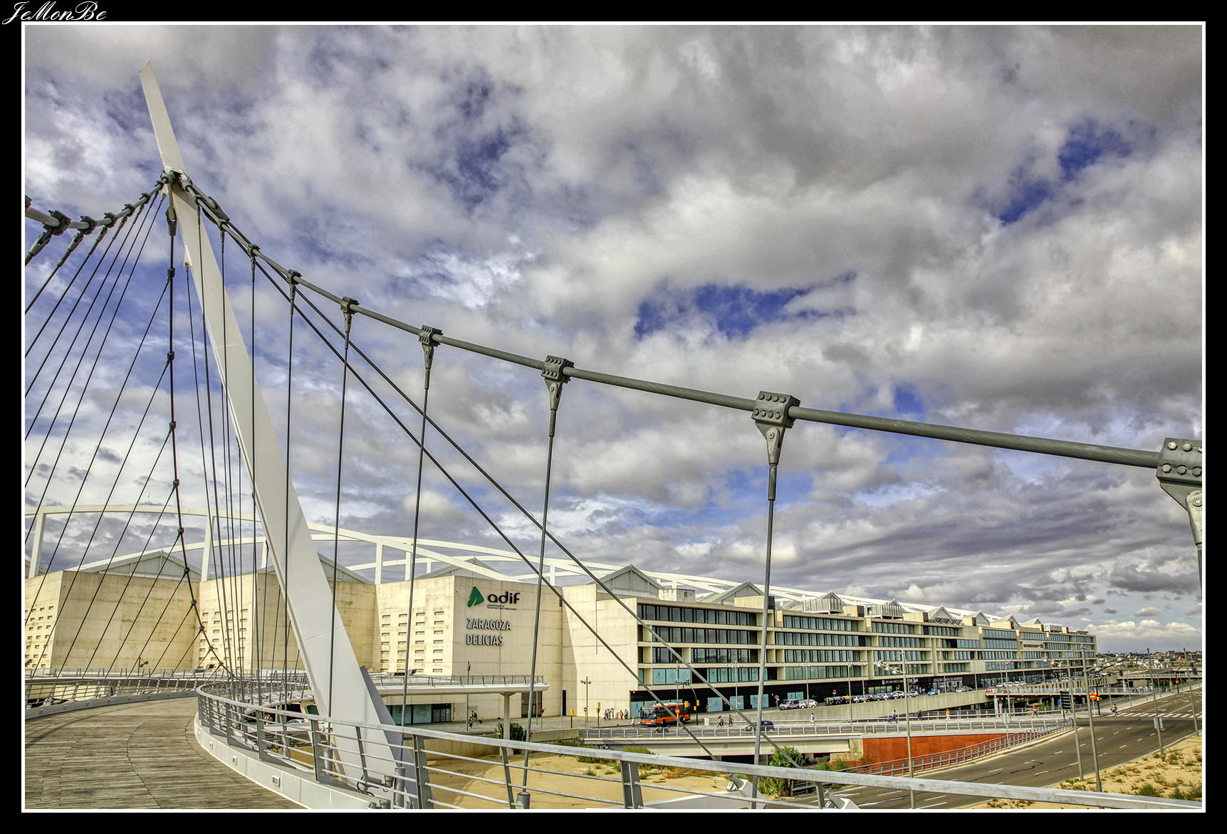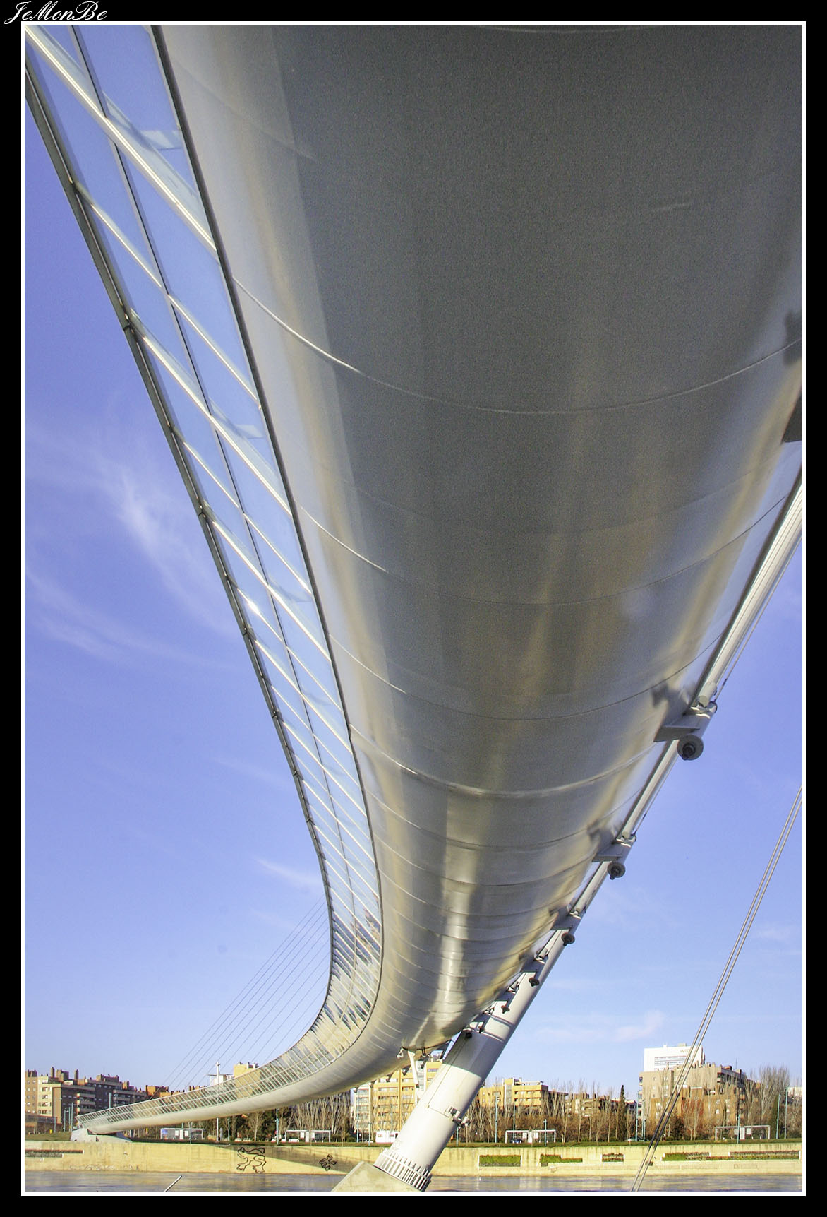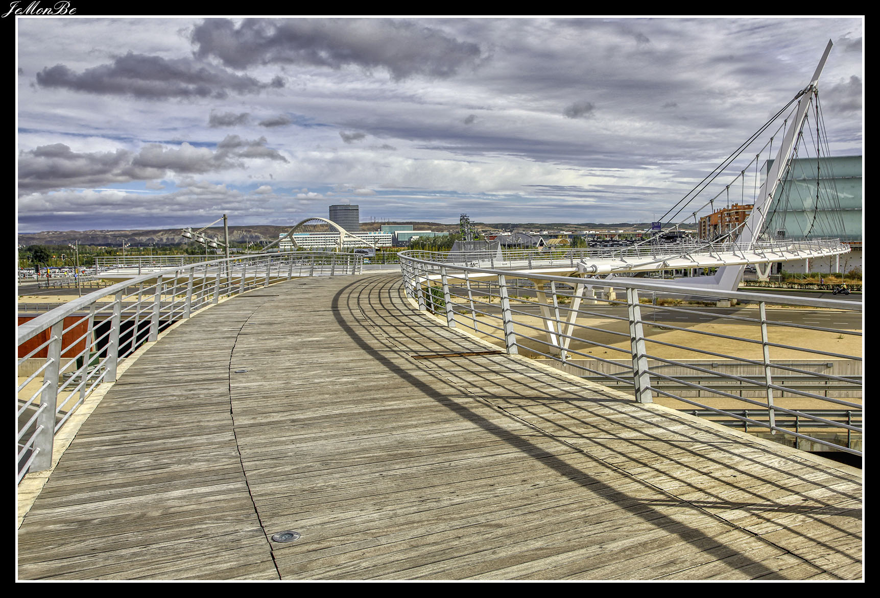 12. La pasarela de Delicias en las vecindades de la Estación Intermodal Zaragoza-Delicias, comunica los barrios de La Almozara y Delicias. Es obra del oscense Juan José Arenas. también autor del Puente del Tercer Milenio.