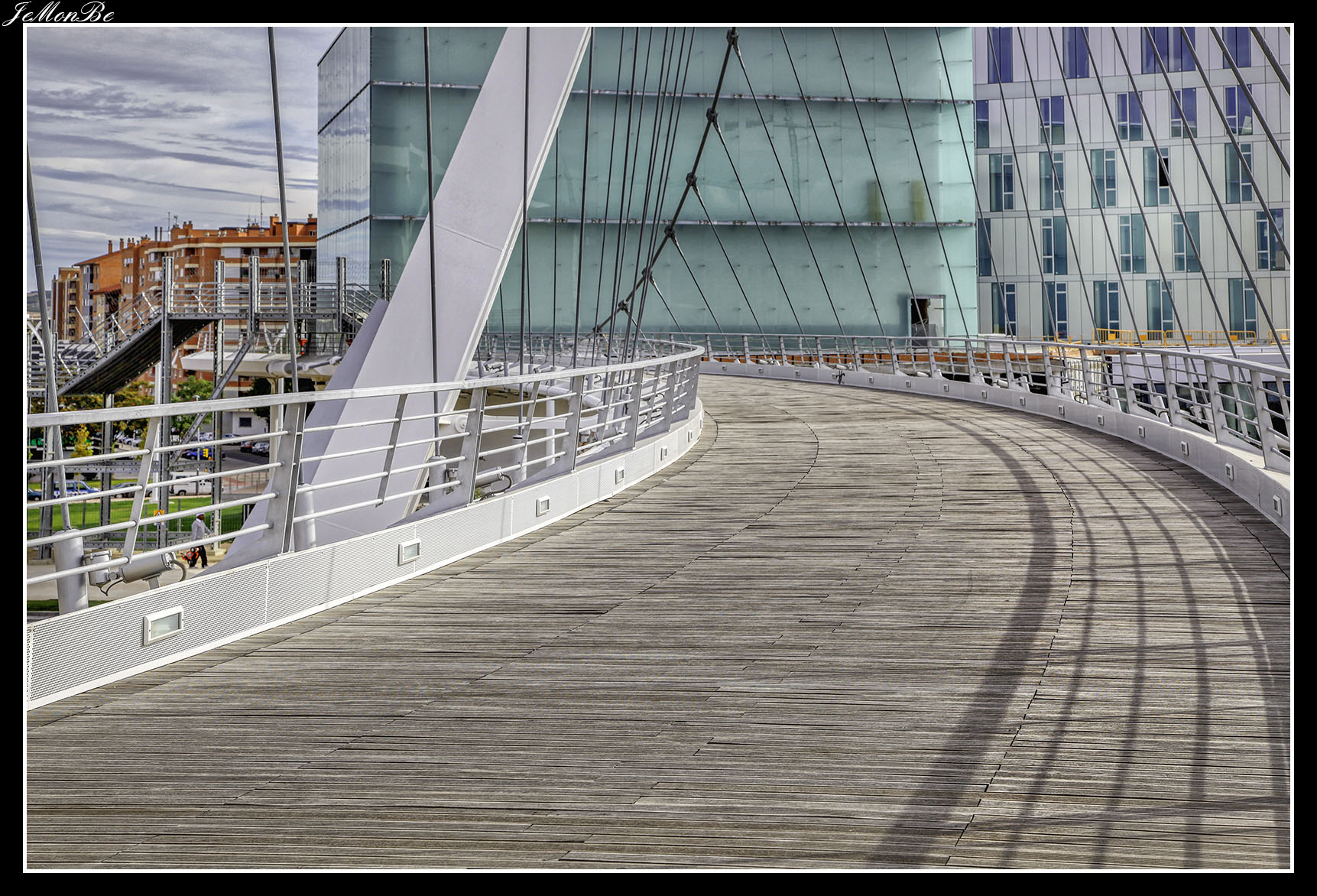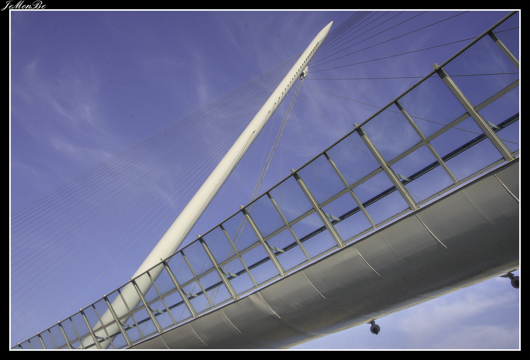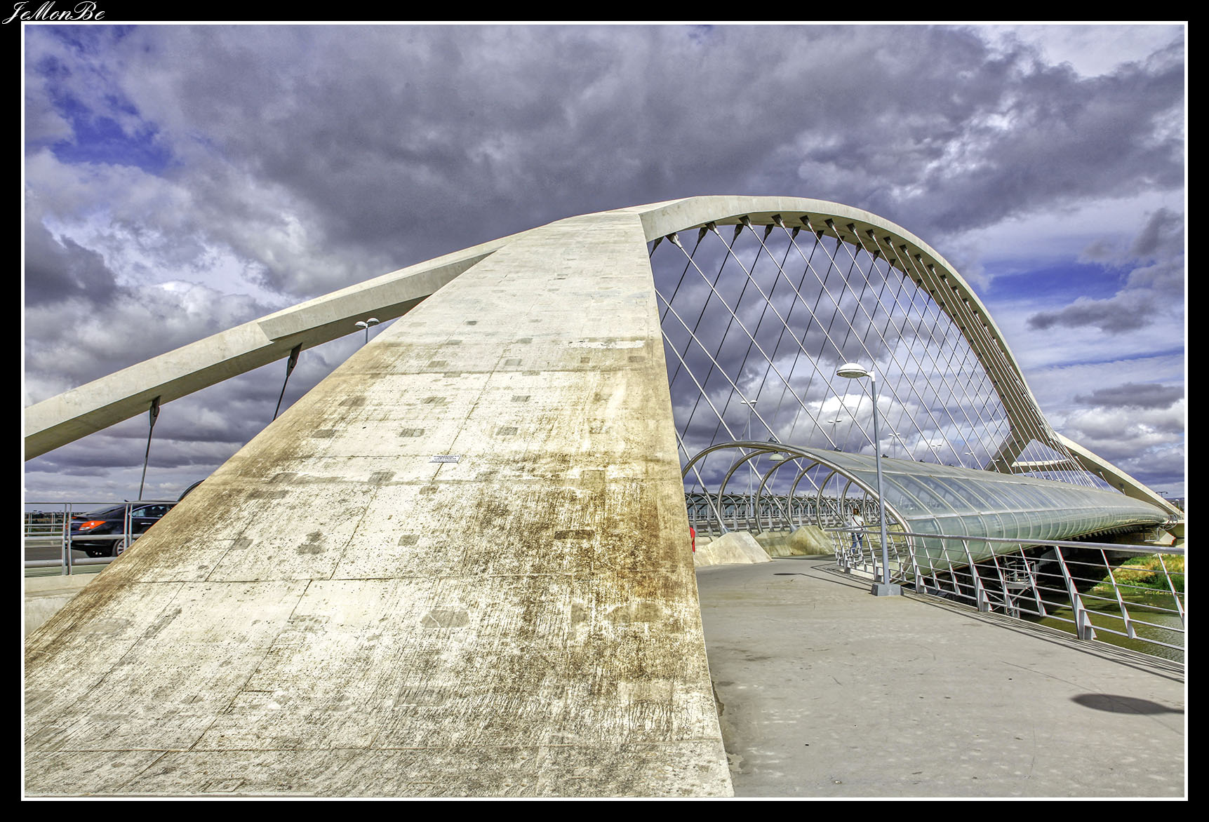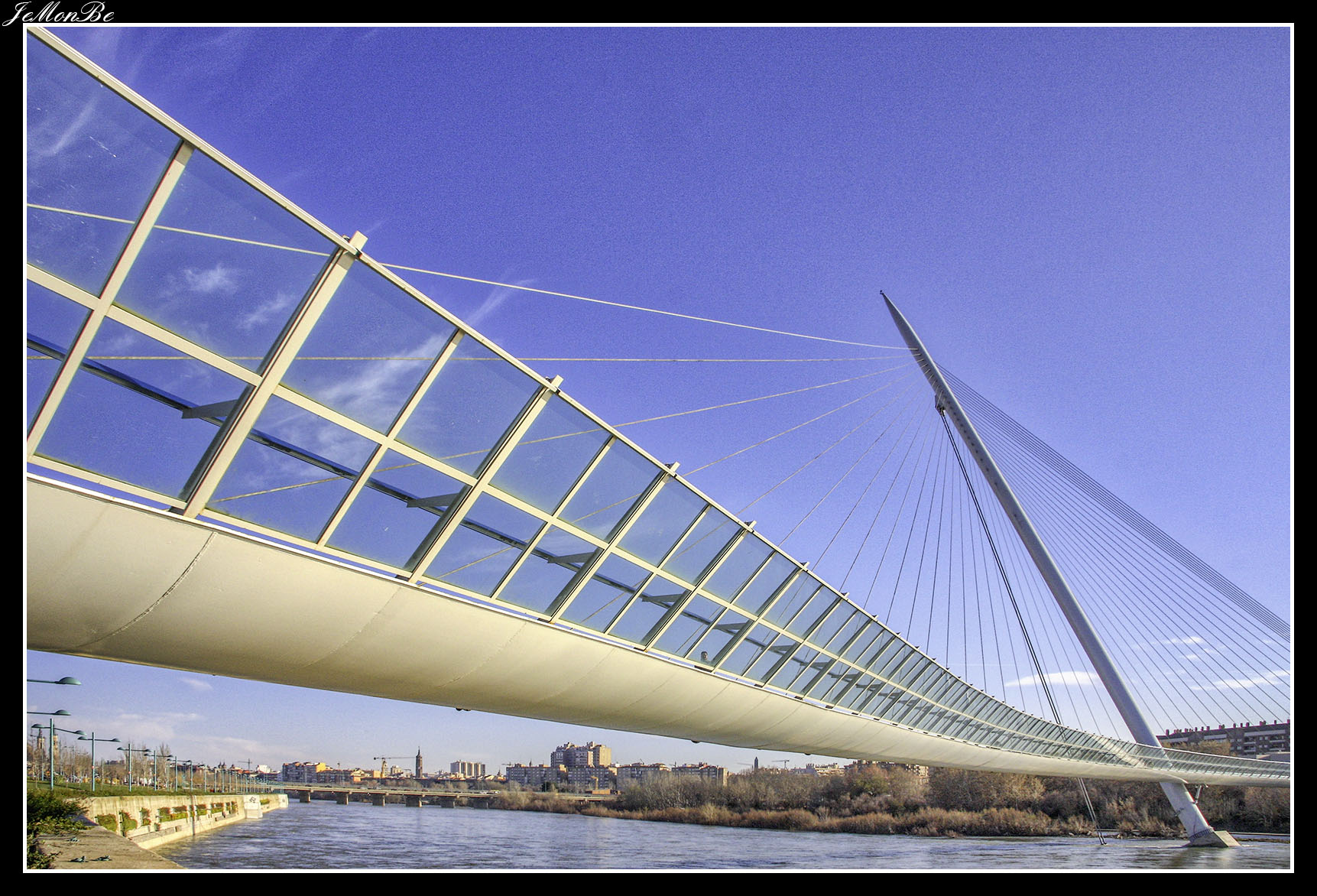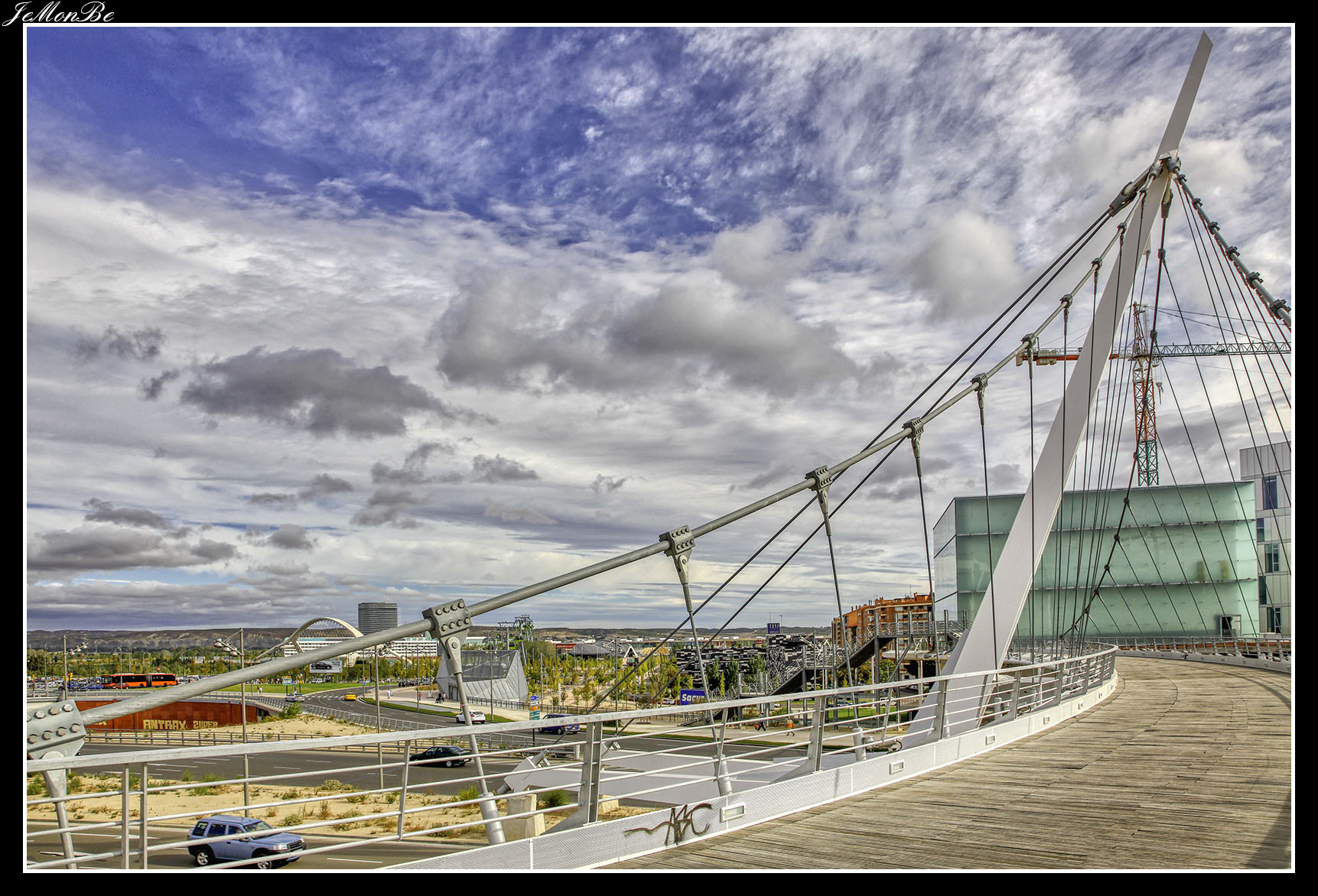 12. La pasarela de Delicias en las vecindades de la Estación Intermodal Zaragoza-Delicias, comunica los barrios de La Almozara y Delicias. Es obra del oscense Juan José Arenas. también autor del Puente del Tercer Milenio.