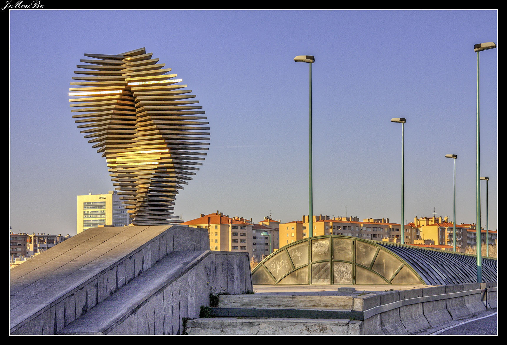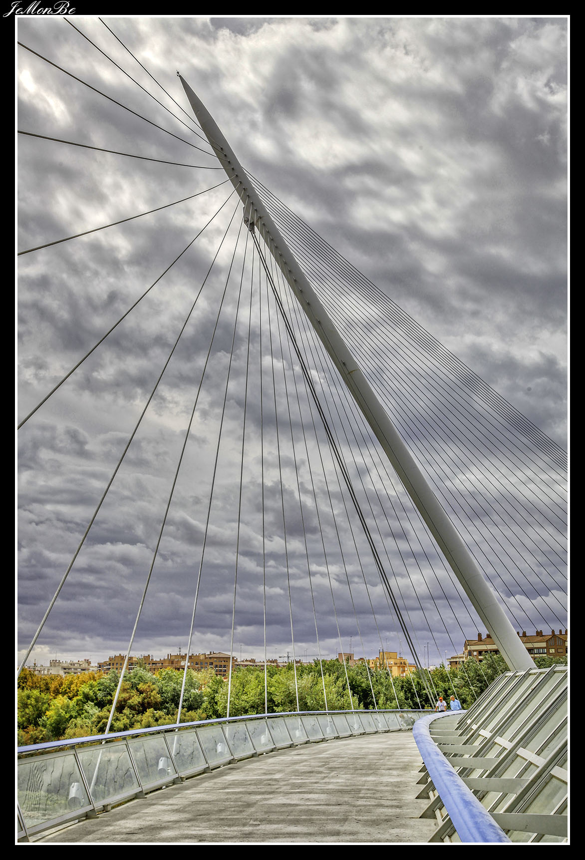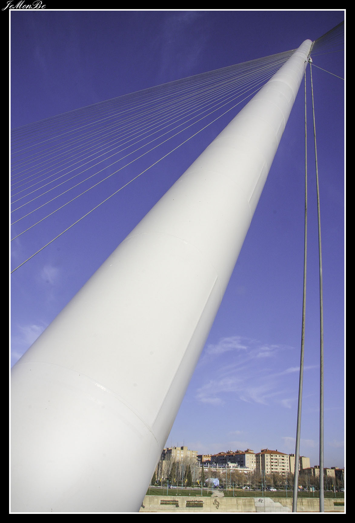 3. La pasarela del Voluntariado (del 2008), conocida popularmente como pasarela del pincho, es una pasarela peatonal que conecta los barrios zaragozanos de La Almozara y rey Fernando. El tablero tiene 277 metros de longitud, de los que 230 metros son en tramo curvo, atirantado desde un mástil central de 90 m. de longitud, 78,3 m. de altura respecto a su empotramiento en el cimiento y 30º de inclinación respecto a la vertical. La sección del mástil, es circular de radio variable, desde 1,1 m. en la base hasta 0,9 m. a 79,5 m desde este punto hasta la parte superior, el diámetro disminuye hasta hacerse nulo.