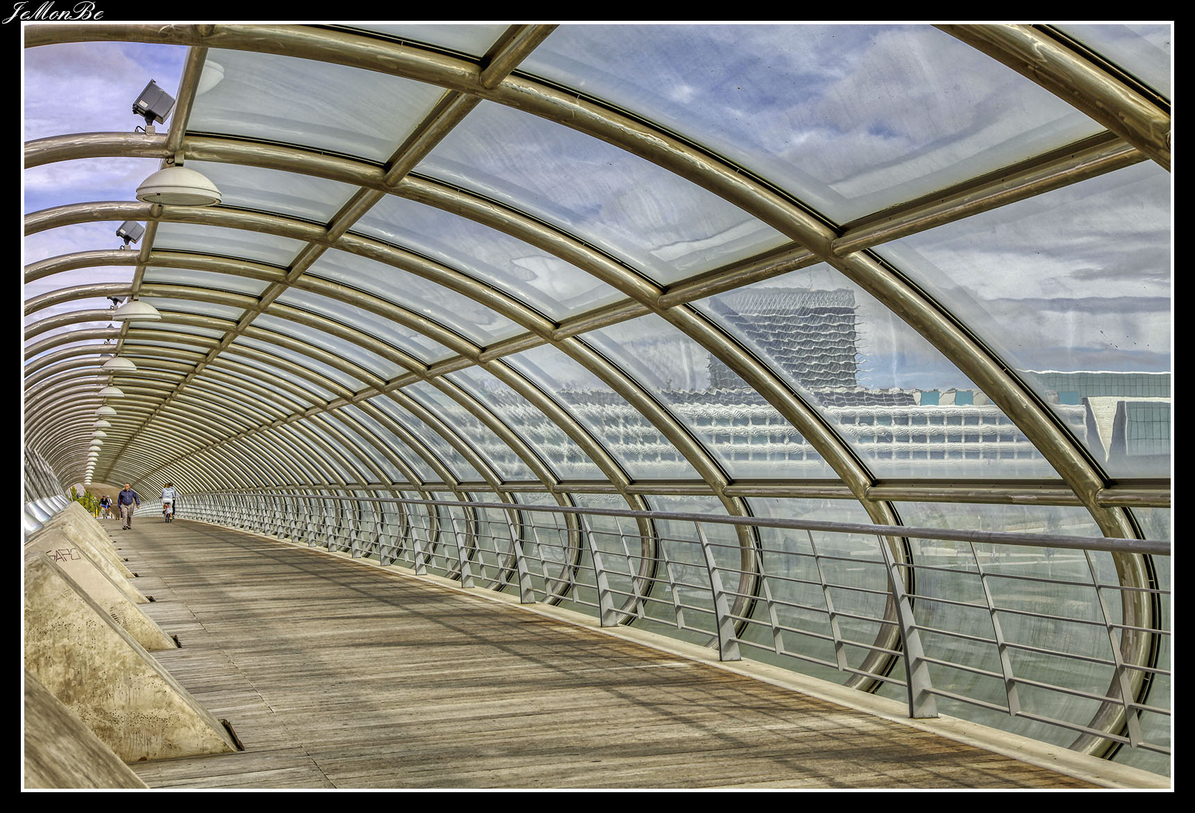 Cuenta con una pasarela de 240 metros que se divide en tres tramos. El primero, de 90 metros, es el más cercano a la estación Intermodal y es por donde acceden los peatones. El segundo tramo de 60 metros con forma curva queda situado justo encima del nuevo nudo de comunicaciones del Tercer Cinturón y de la avenida Ciudad de Soria. El último tramo de la pasarela es el más espectacular ya que sus 90 metros de longitud cuelgan del mástil de 28 metros de altura. Como curiosidad a destacar es que tanto la estación como la pasarela se levantan en el barrio de La Almozara pero llevan el nombre del vecino barrio de Delicias).