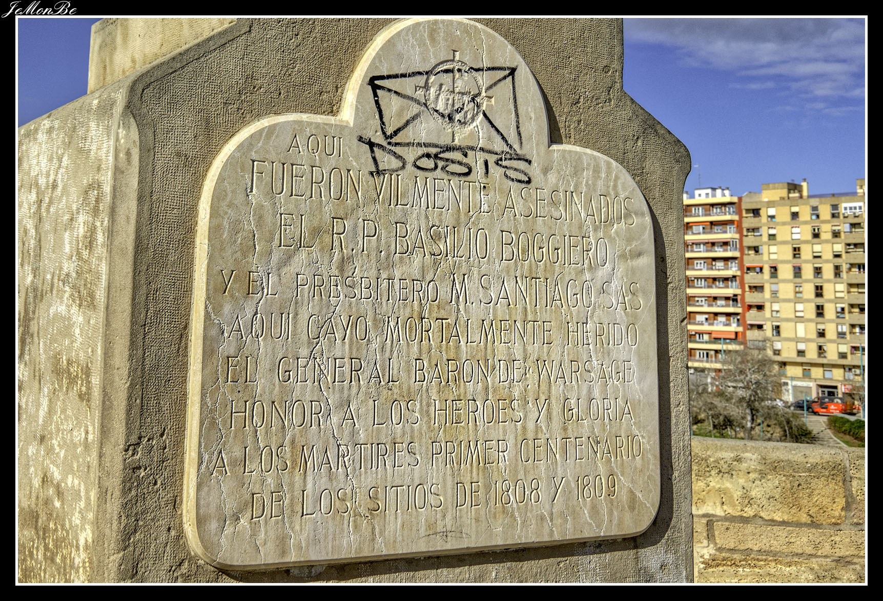 Sobre el puente tenemos en piedra la cruz de Basilio en la que figura la siguiente inscripción: “Aquí fueron vilmente asesinados el R.P. Basilio Boggiero y el presbítero Santiago Sas. Aquí cayó mortalmente herido el Barón de Warsage. Honor a los héroes y gloria a los mártires. Primer Centenario de los Sitios de 1808 y 1809”.