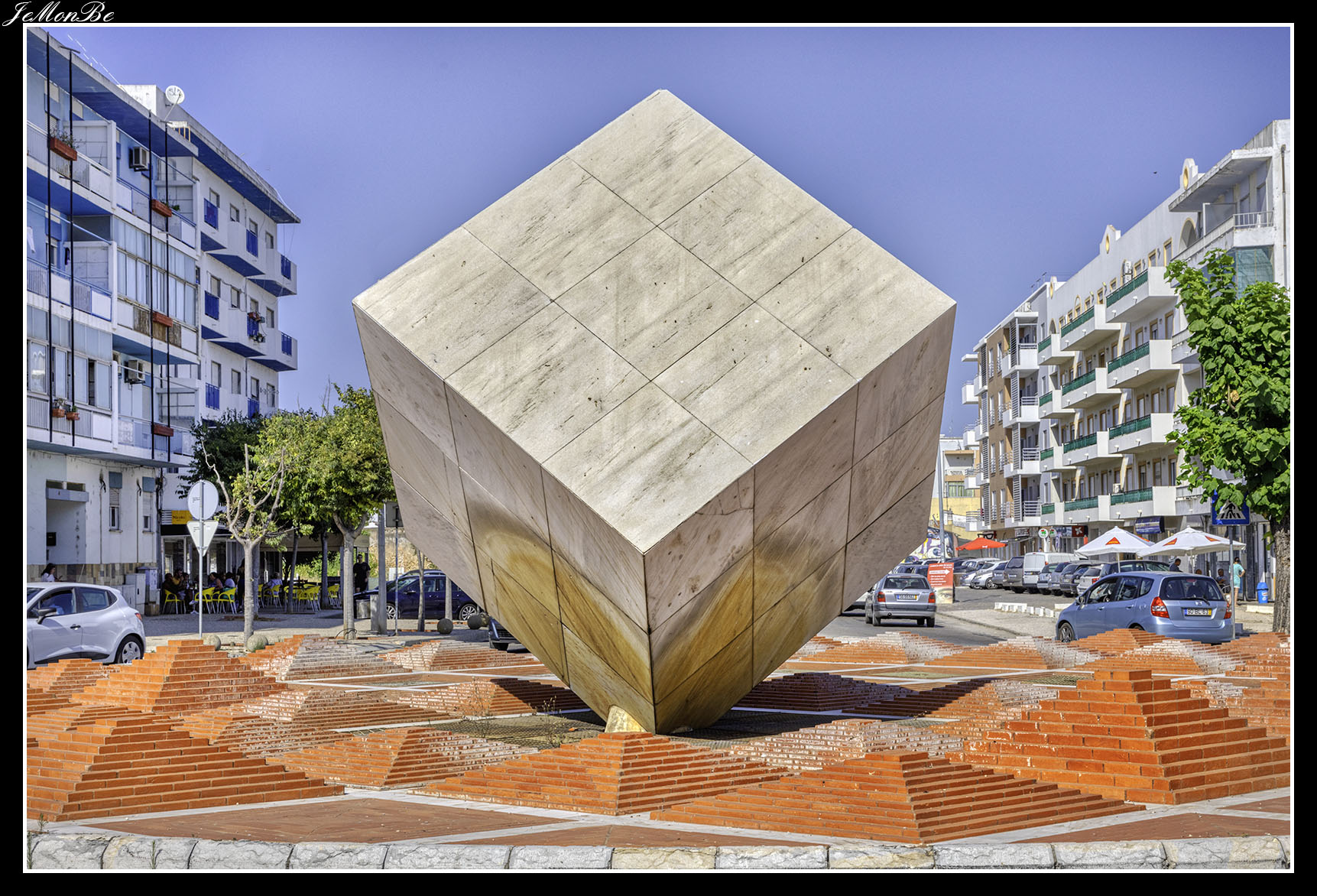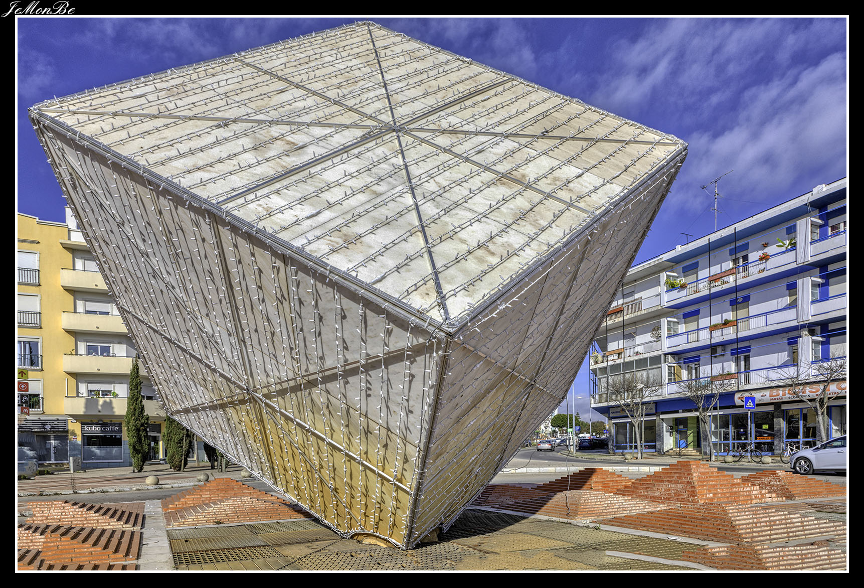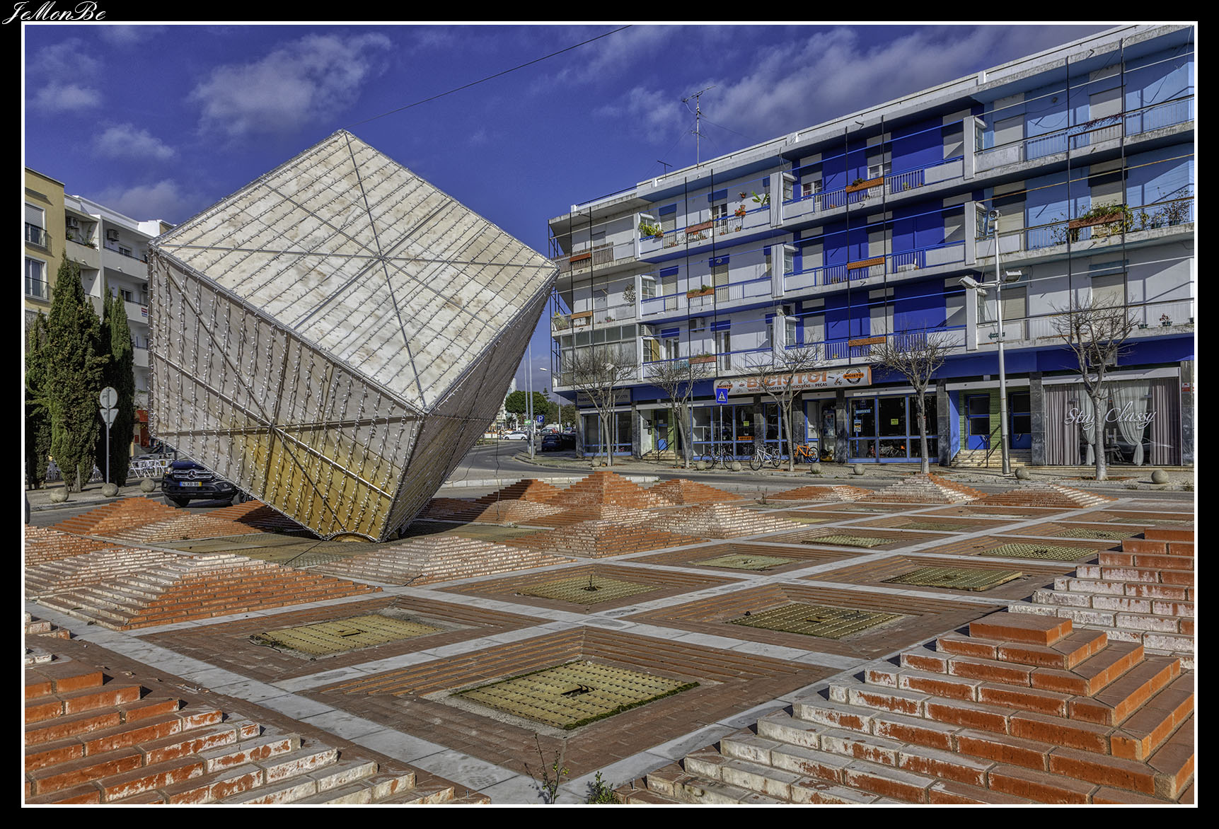 Recorriendo la avenida Bernadino de Silva no hay que perder detalle en las antiguas mansiones. Elegantes edificaciones que nos hacen imaginar la prosperidad de la ciudad de otros tiempos, con sus grandes ventanales, acabados en las esquinas y remates superiores de las fachadas. Acabamos en la N-125 y una rotonda con un gran cubo, símbolo con el que se conoce a esta población: la ciudad cubista.