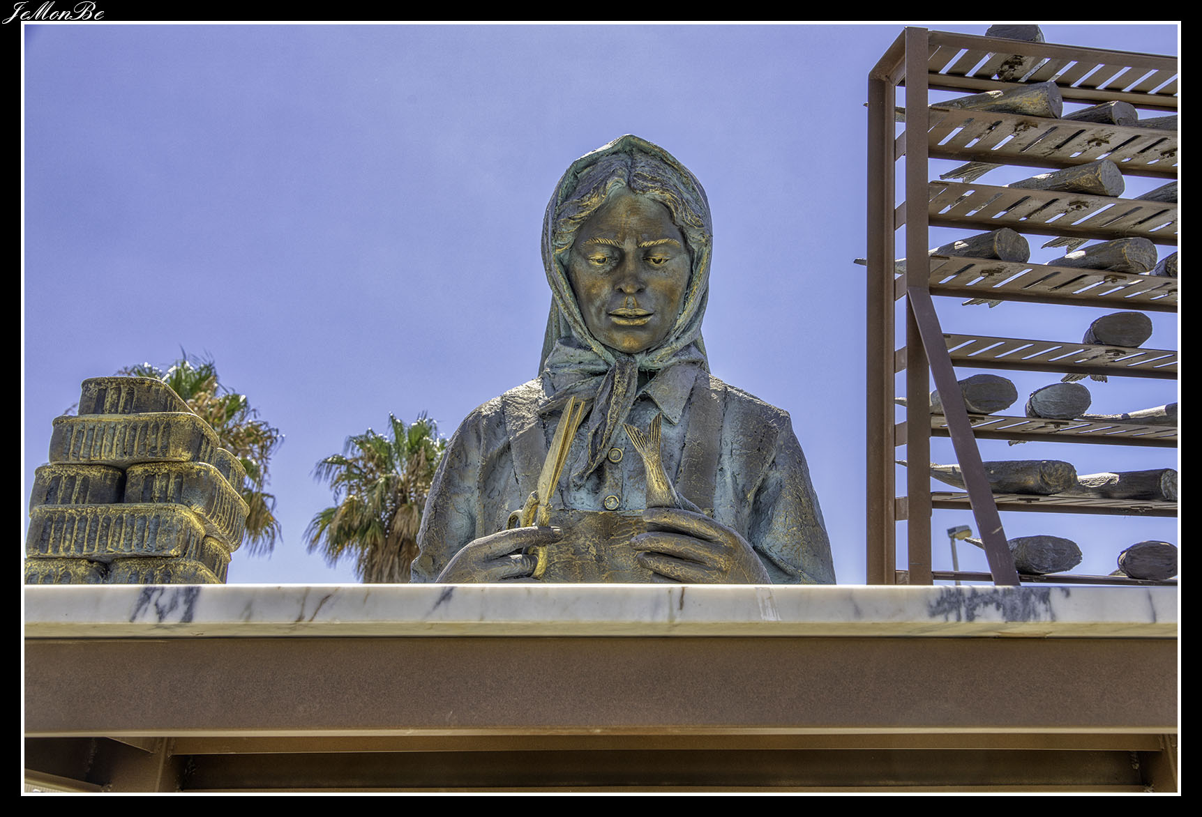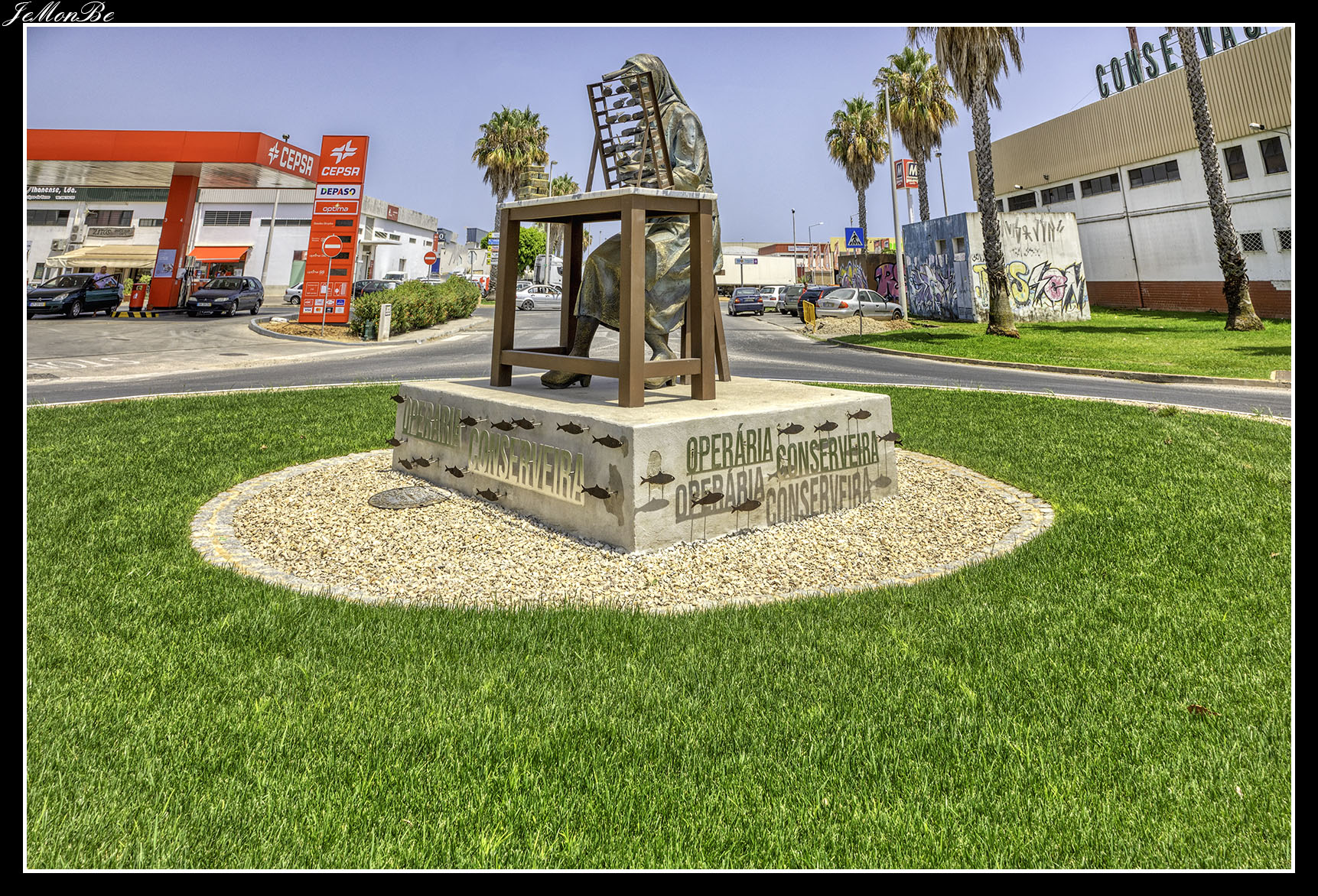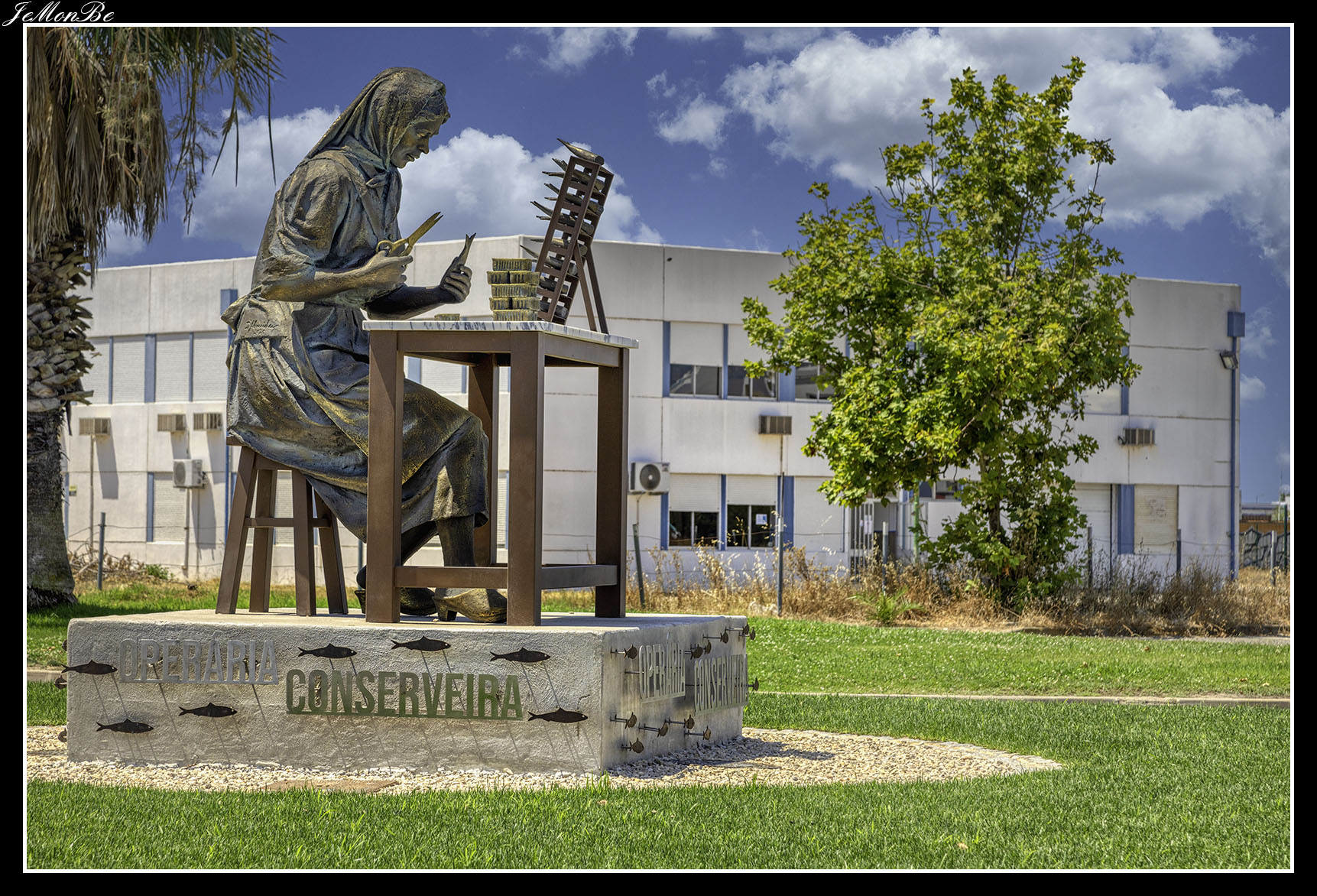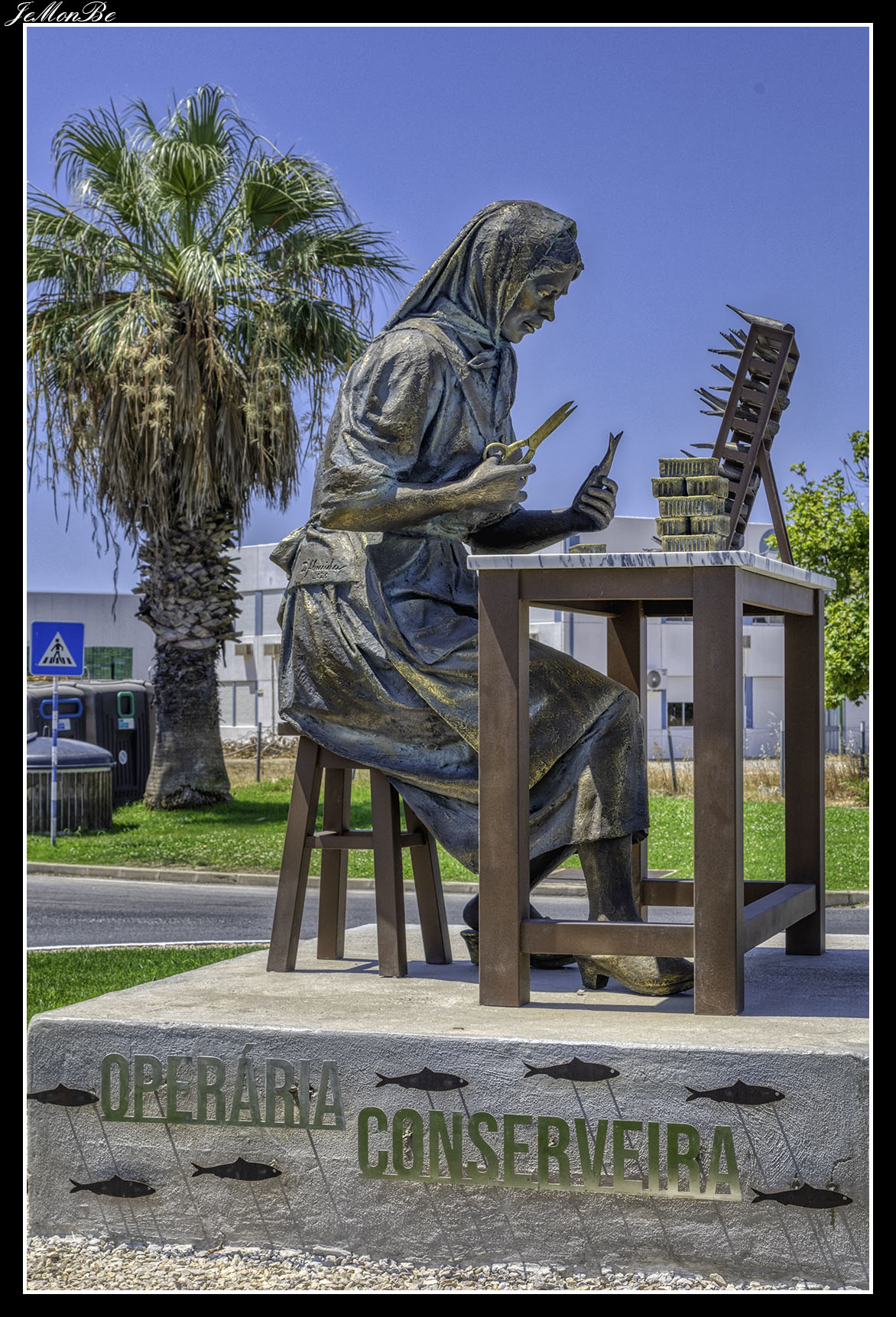 La «Operária Conserveira» está ubicada en la rotonda de acceso al Polígono Industrial de Olhão, rinde homenaje a las mujeres que trabajaron durante décadas y fueron la columna vertebral de la industria conservera del municipio. La estatua es de José Carlos Almeida y António Faustino.