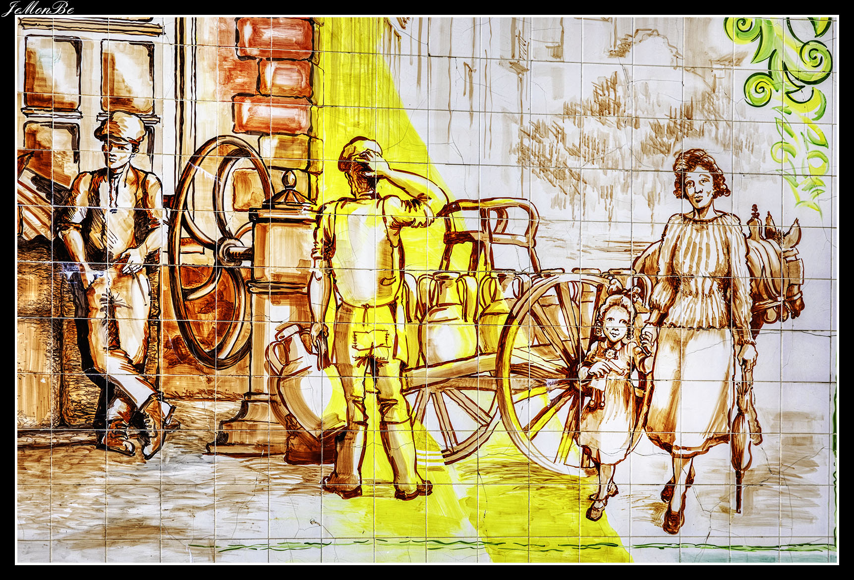 Hacia la mitad de la Avenida, en su lado derecho, tenemos un panel de azulejos de Jorge Timóteo, en alusión a los aguadores.