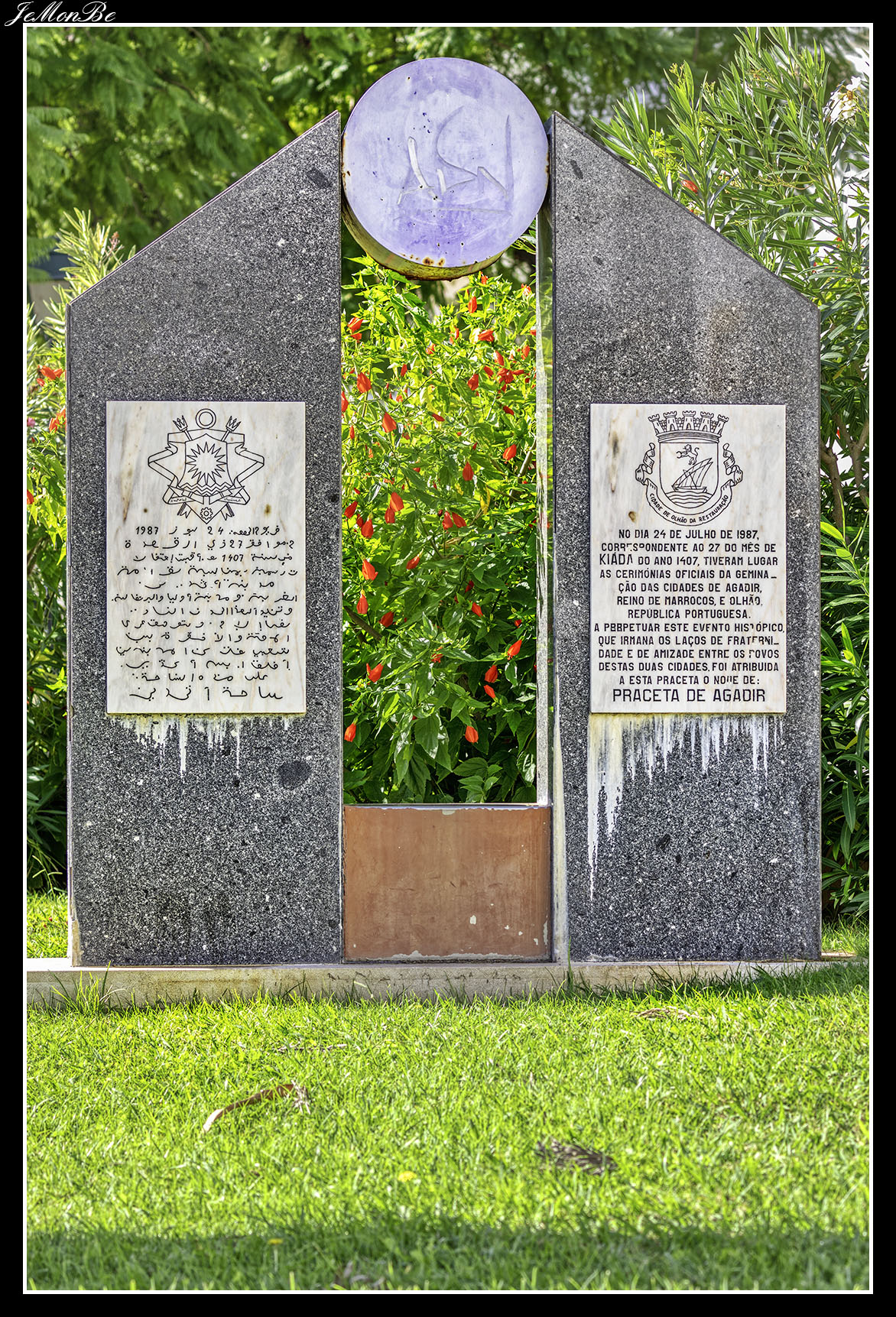 Cruzando la vía férrea y dejando a la derecha la avenida de Bernadino de Silva, nos encontramos con la plaza de Agadir, el nombre se debe al hermanamiento de las ciudades de Olhão y Agadir, en el reino de Marruecos, en 1987. En ella podemos disfrutar de un espacio verde, con terrazas y en su día una fuente luminosa que ha desaparecido.