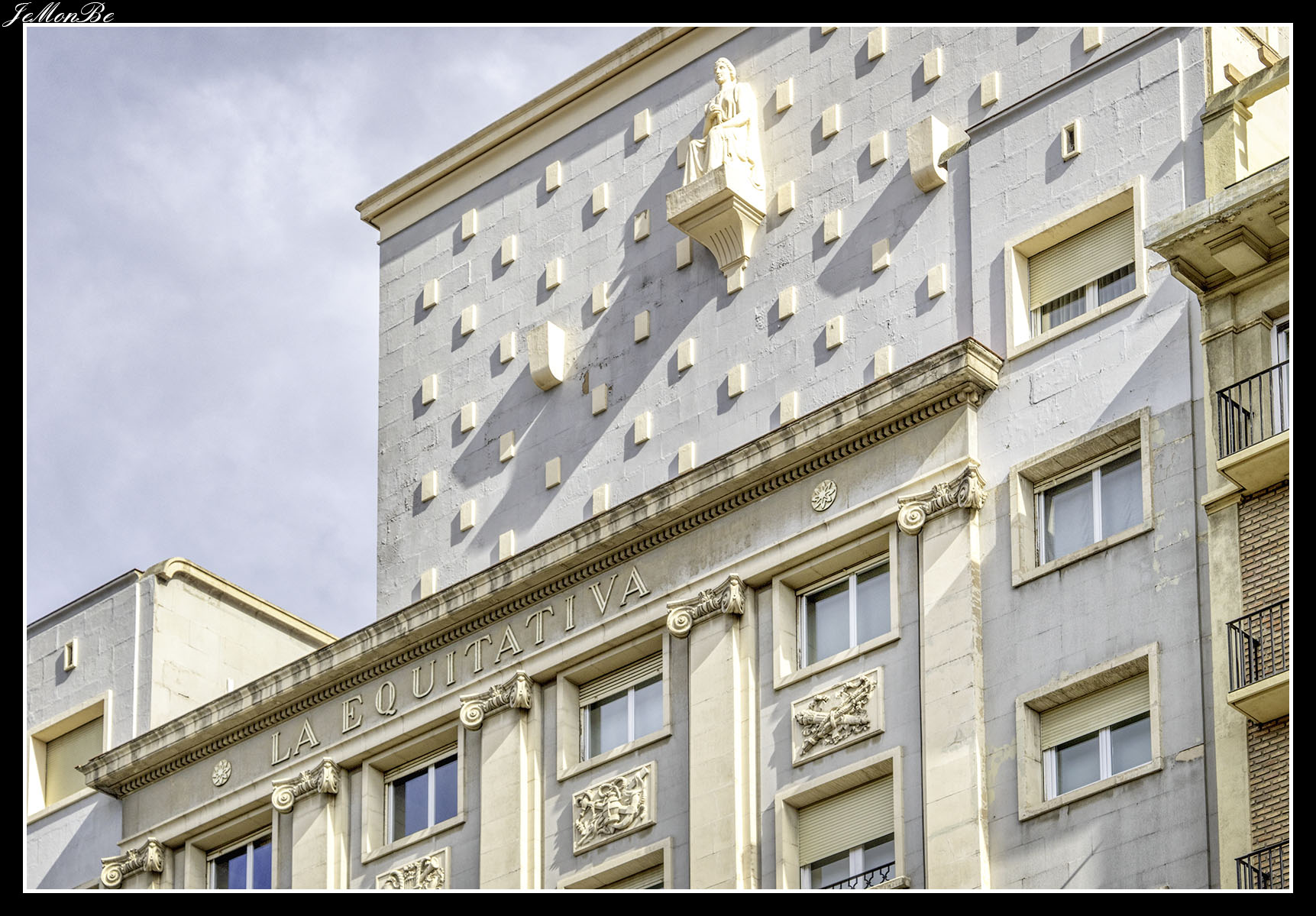 La Compañía de Seguros La Equitativa, construía este edificio, en el año 1950, en el nº 19. La fachada con cinco pilastras jónicas, que articulan el cuerpo central de ésta, separando los ejes de vanos, y rematado en un entablamento en cuyo friso se dispone el rótulo de la Compañía para la que se construyó. En su parte superior una gran escultura con figura de mujer, en posición sedente y con una balanza en las manos, campea sobre el edificio; es el símbolo de la citada Compañía de Seguros.