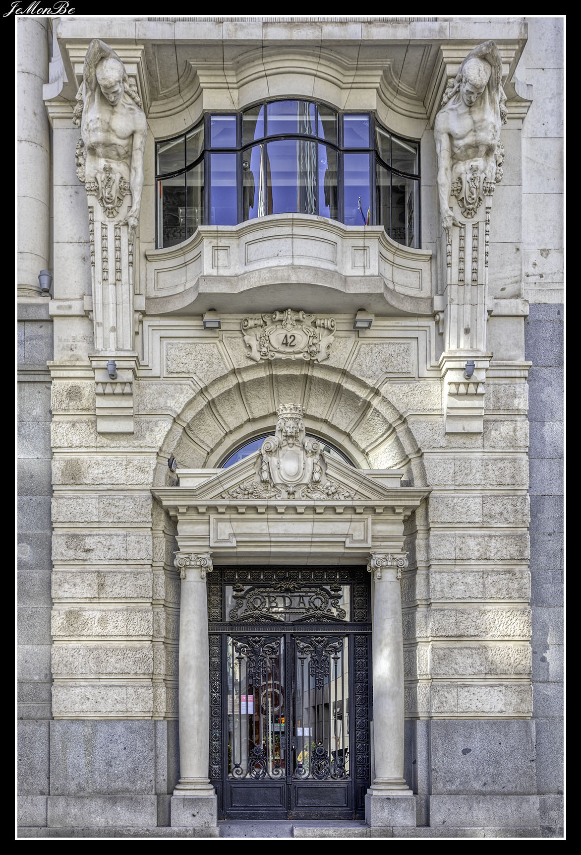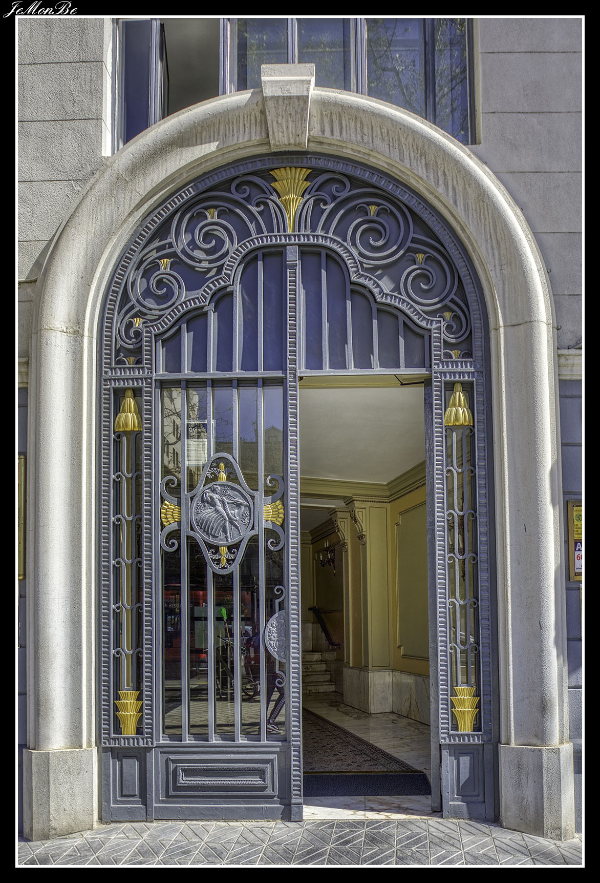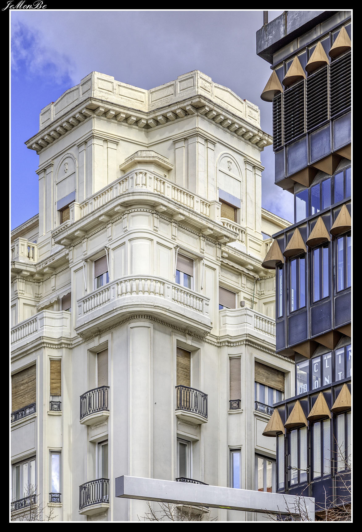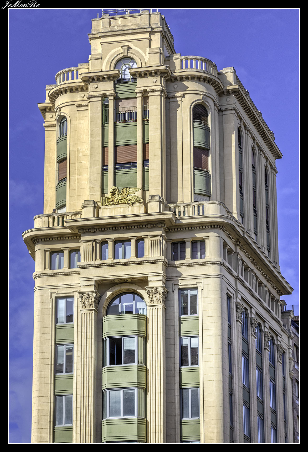 Gran Vía 22 de 1929. Se trata de un edificio de siete alturas a las que se añaden dos torreones esquineros como remate. La fachada se articula en tres zonas en altura separadas por balcones corridos volados. La inferior, de dos alturas, en la que destaca el uso de arcos de medio punto en los balcones. La intermedia, con tres alturas, con un triple vano en el centro y miradores laterales. Y la superior en la que llama la atención el último piso planteado como una galería de arcos de medio punto abiertos en balcón de planta semicircular. A ambos lados miradores abiertos guarnecidos con una cubierta apoyada sobre columnas anilladas y de orden jónico. Los torreones son de una altura y se abren mediante vanos geminados con arco de medio punto. Un rafe muy volado culmina toda la composición.