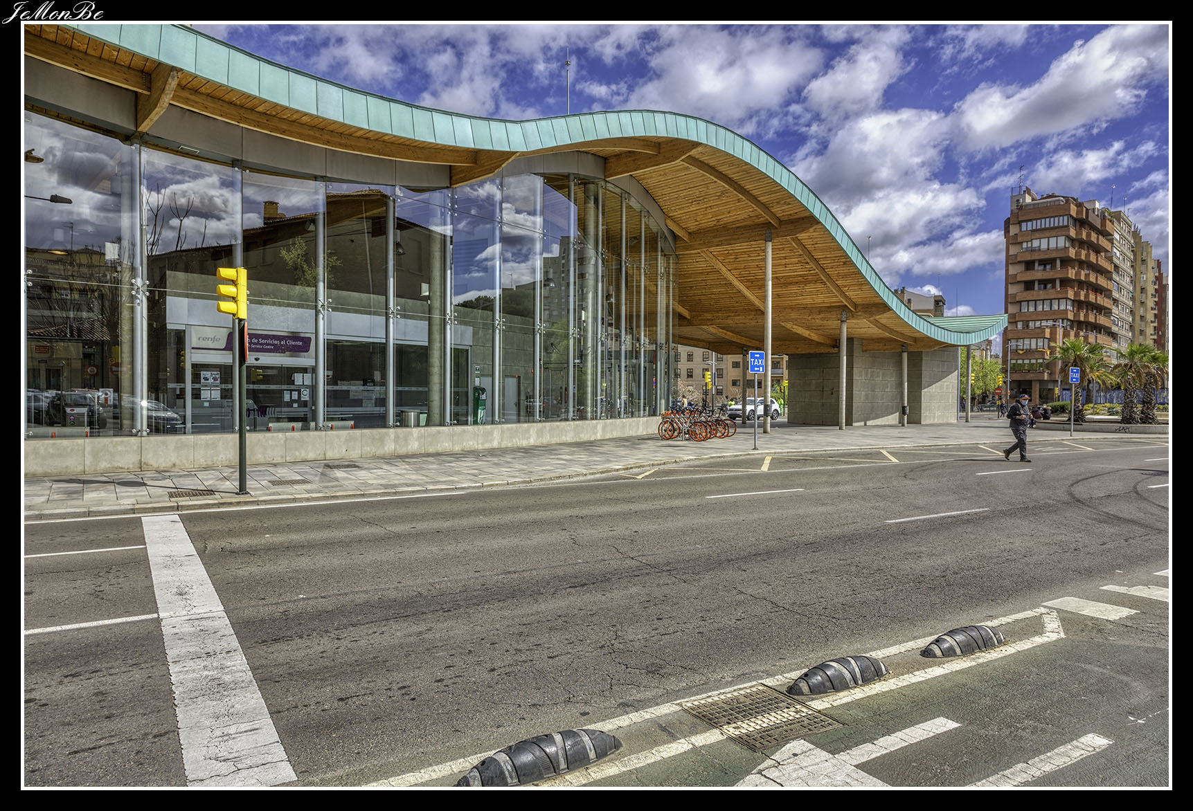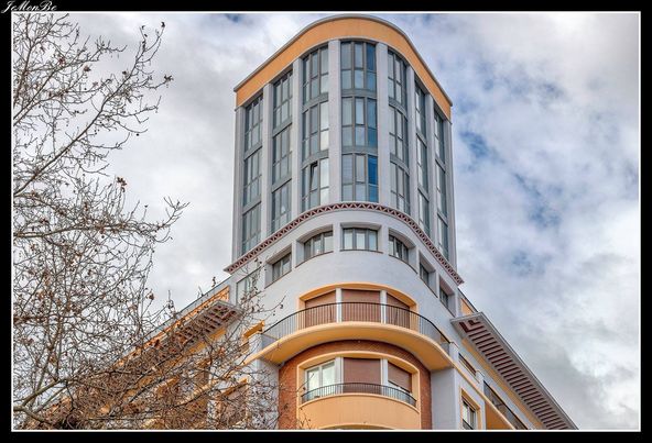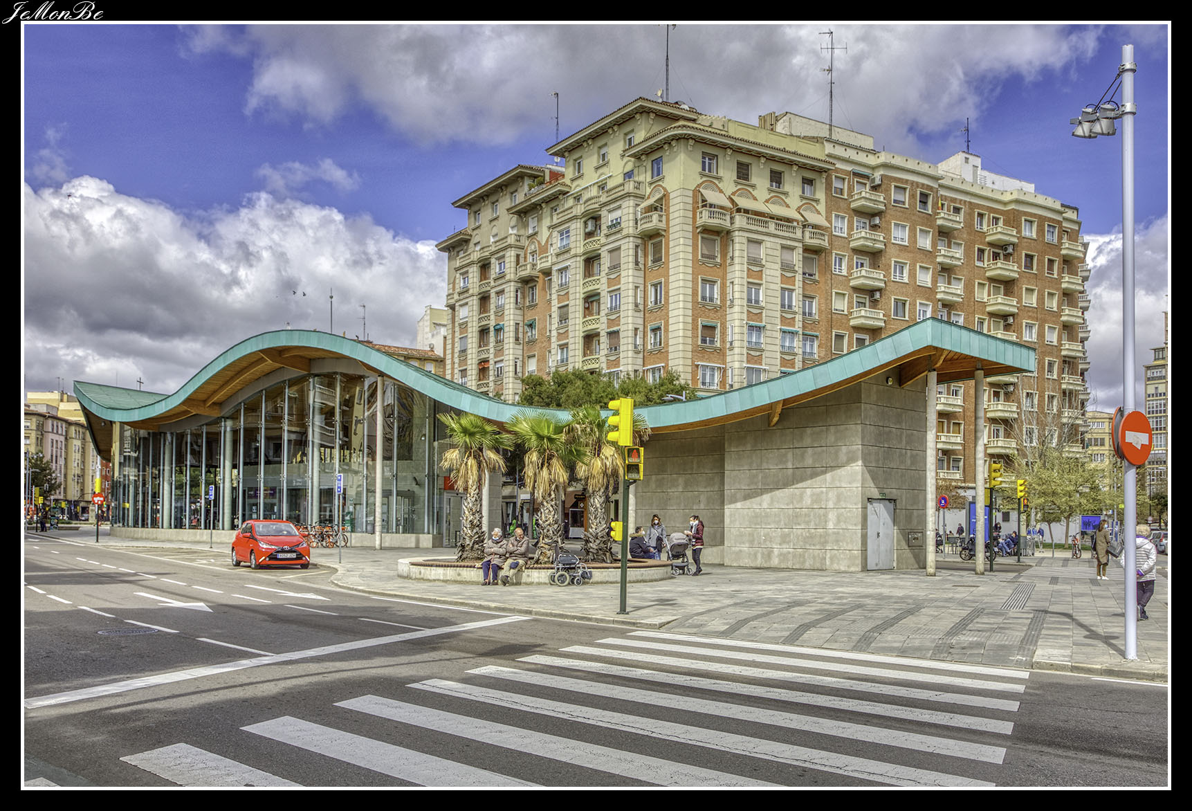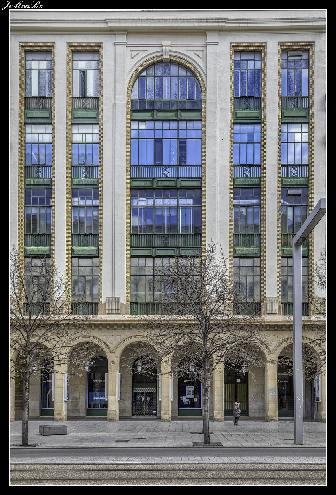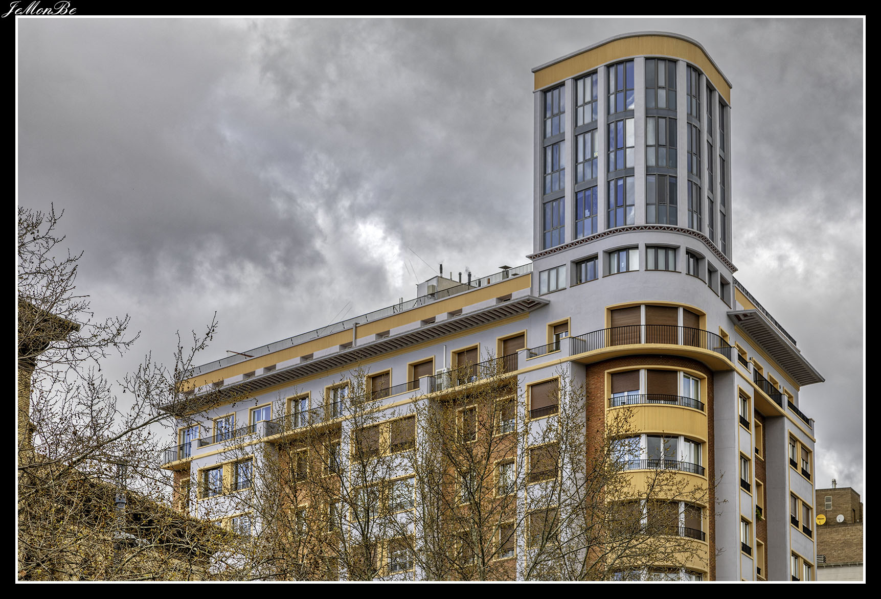 En el arranque del paseo de Pamplona, vemos un edificio singular y casi emblemático de su época (1955). Este inmueble de programa mixto, verticalmente se estructura con la habitual disposición tripartita en basamento, de doble altura, cuerpo y ático, al que añade un nivel a modo de torreón generosamente acristalado.