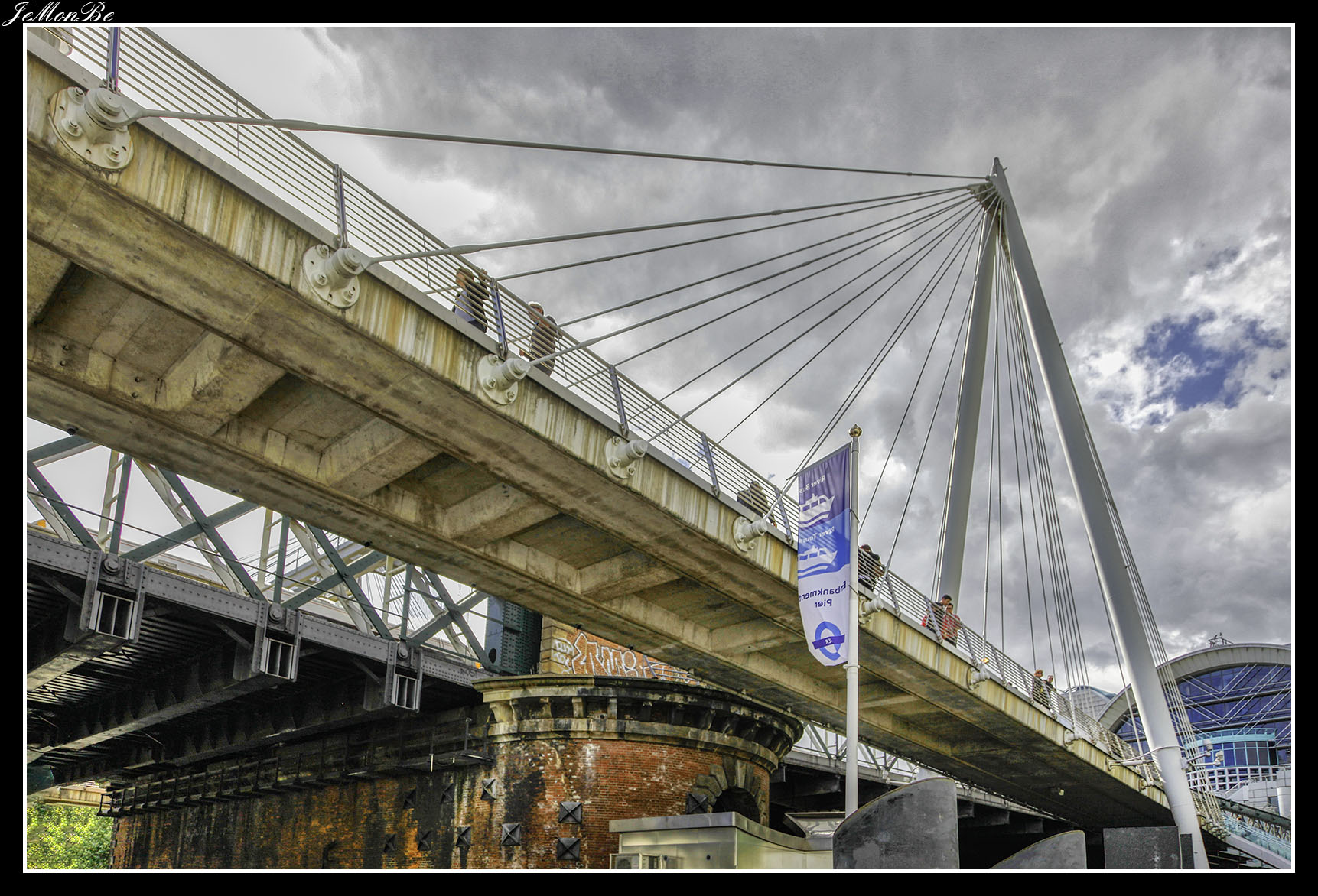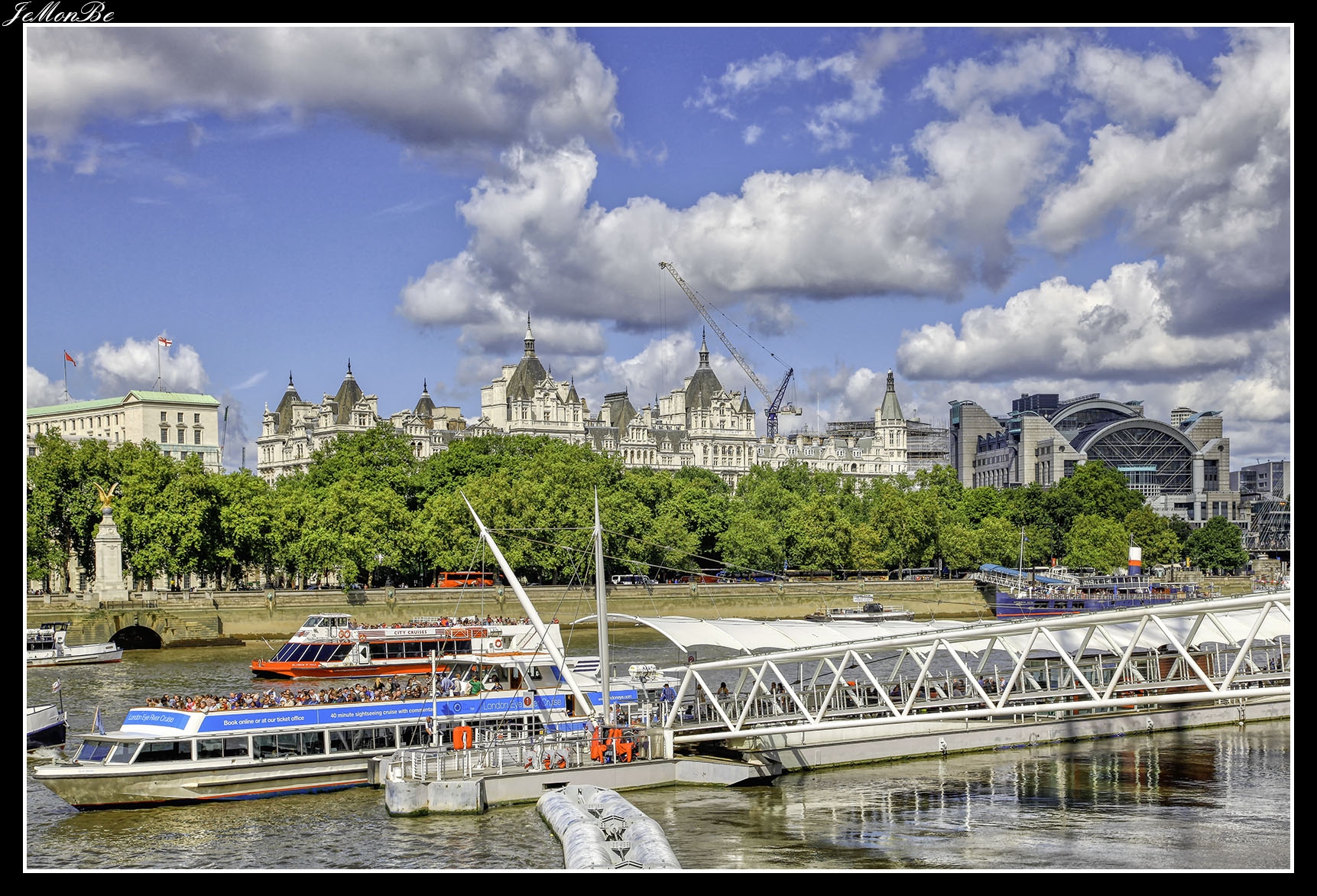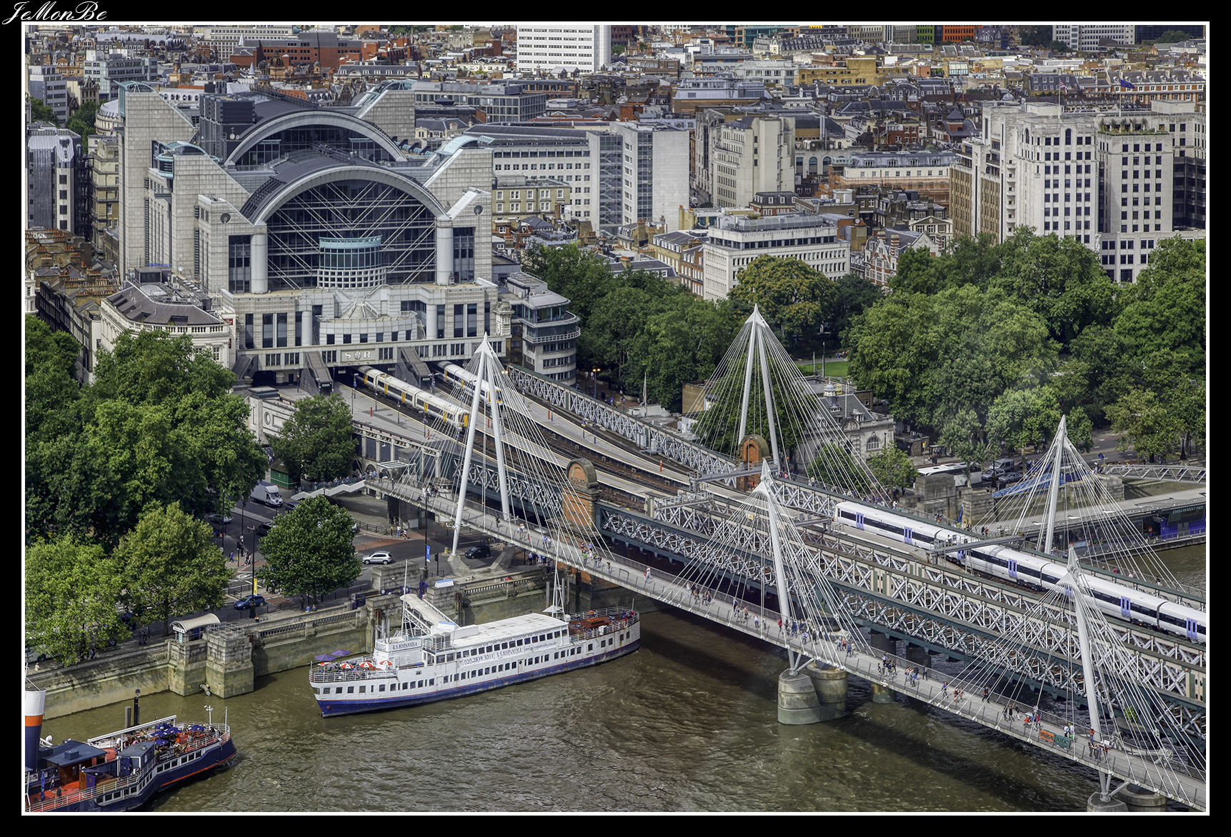 El puente de Hungerford cruza el río Támesis, situado entre el puente de Waterloo y el puente de Westminster, da paso a los trenes que vienen del sureste de Inglaterra hasta la estación terminal en la ribera norte de Charing Cross. Se trata de un puente ferroviario de hierro, que se inauguró en 1864, en sus laterales se construyeron pasarelas peatonales a finales del siglo XX.