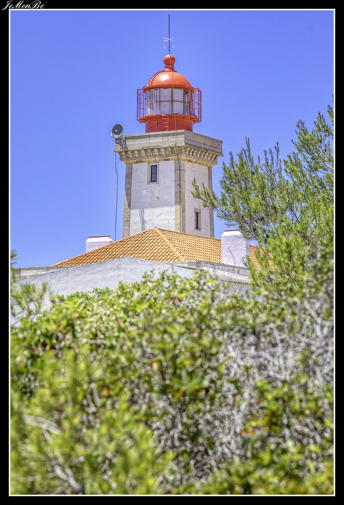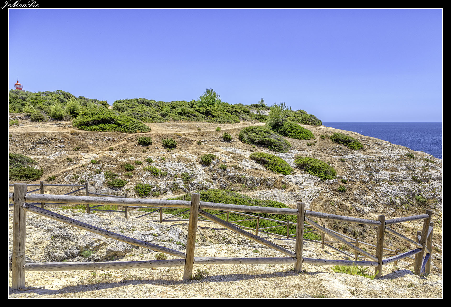 Tras un ligero ascenso divisaremos un faro de 15 metros de altura con la parte superior de rojo, hecho de mampostería recubierta de azulejo blanco. Es el faro de Alfanzina, colocado en el extremo del cabo Carvoeiro. Al aproximarnos iremos viendo varios algares, convenientemente cercados.