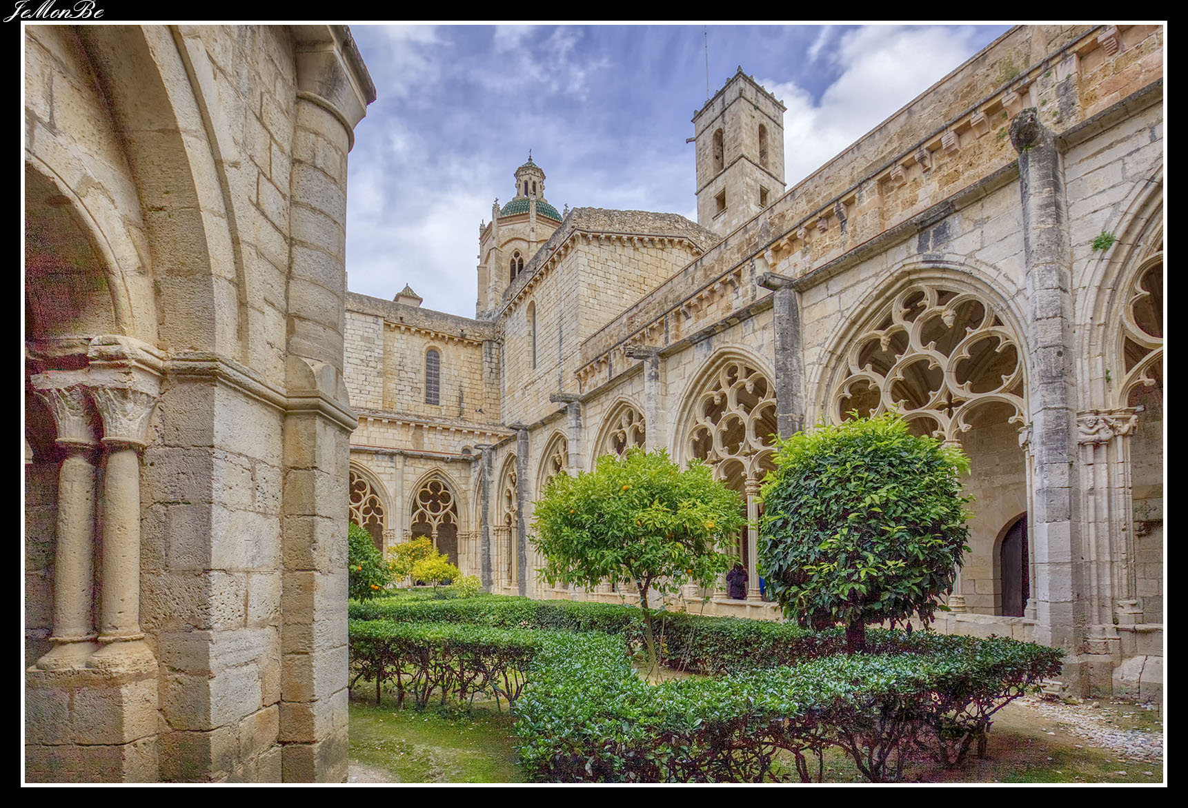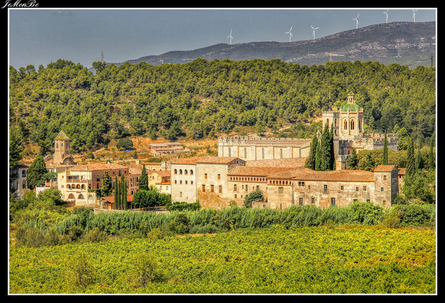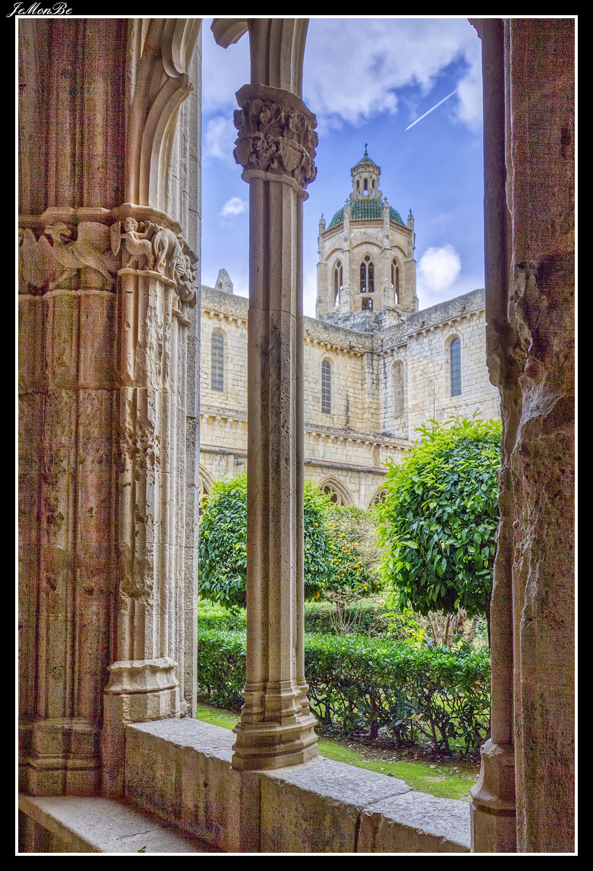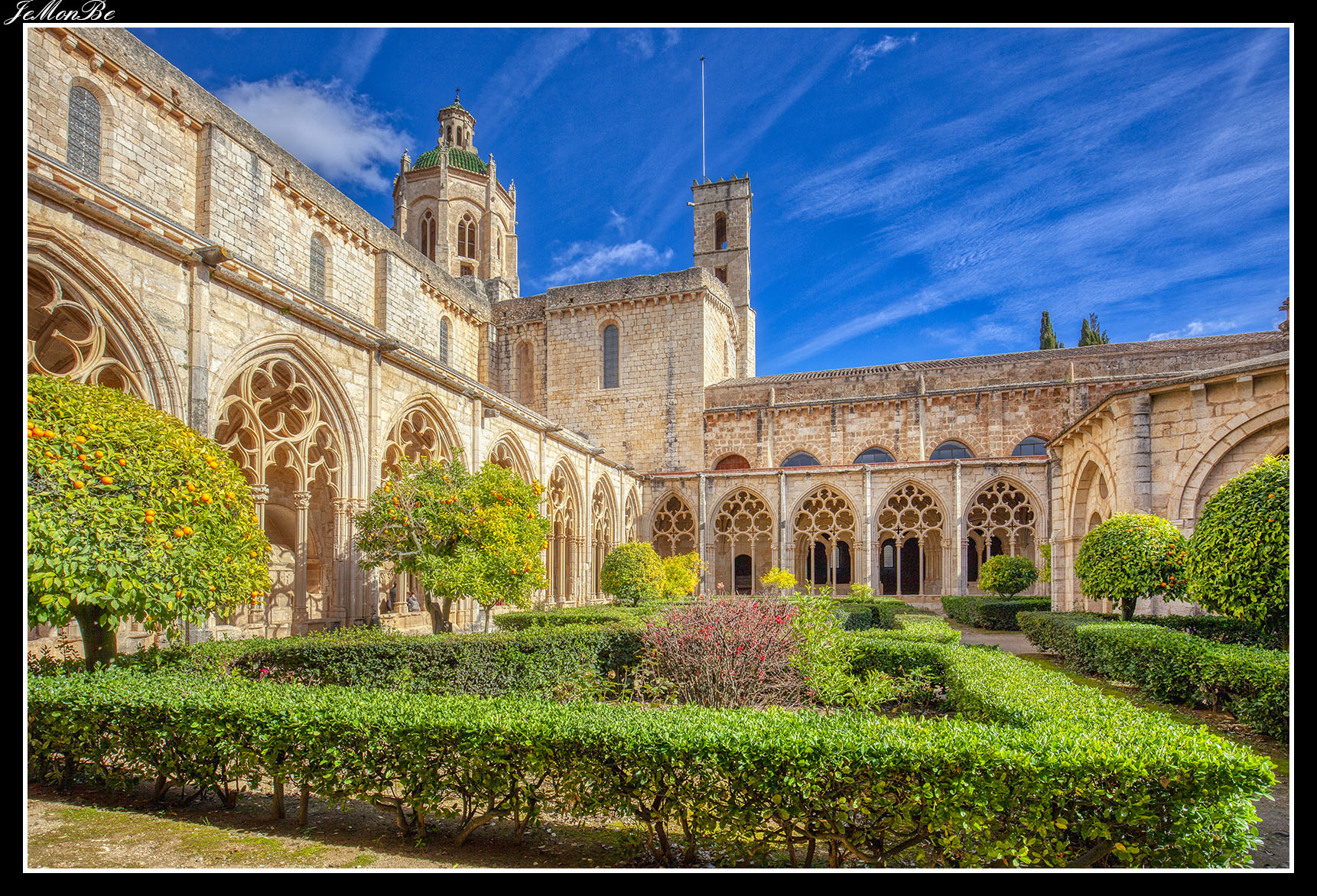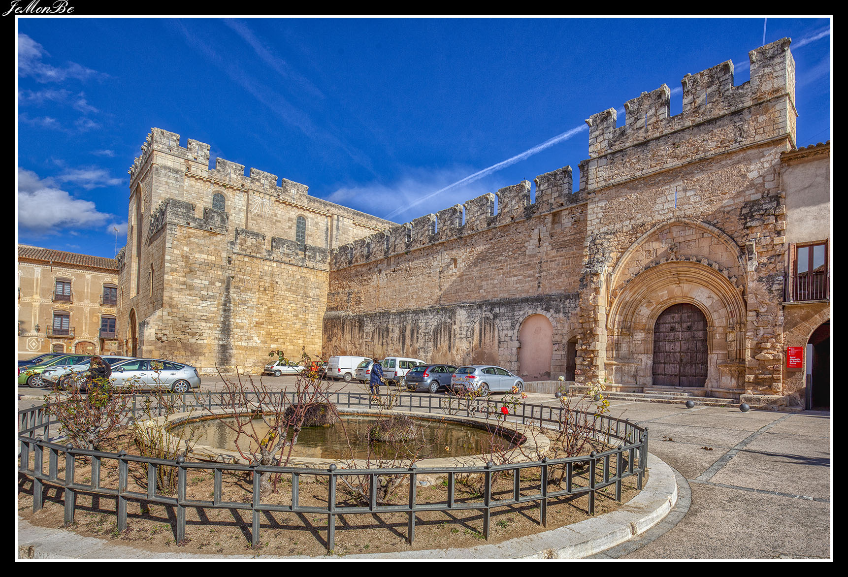 Al entrar por el Arco Real se aprecia una gran plaza rectangular, en cuyo centro se encuentra una fuente sobre la que hay una estatua dedicada a san Bernardo Calbó, antiguo abad del monasterio. Alrededor de la plaza se encuentran las diversas dependencias monacales antiguas, donde habitaban los monjes más ancianos y los que trabajaban en diversos oficios; todas muestran en sus fachadas decoraciones con esgrafiados realizados durante el siglo XVIII. Entre estos edificios se encuentra el antiguo hospital del monasterio. La parte más resaltable es un pequeño patio con arcos apuntados y una galería con doble arcada. El fondo de la plaza está ocupada por la fachada de la iglesia y la entrada de la Puerta Real, donde se aprecia el intento de amurallamiento decretado por el rey Pedro IV el Ceremonioso por las almenas que coronan toda la iglesia.